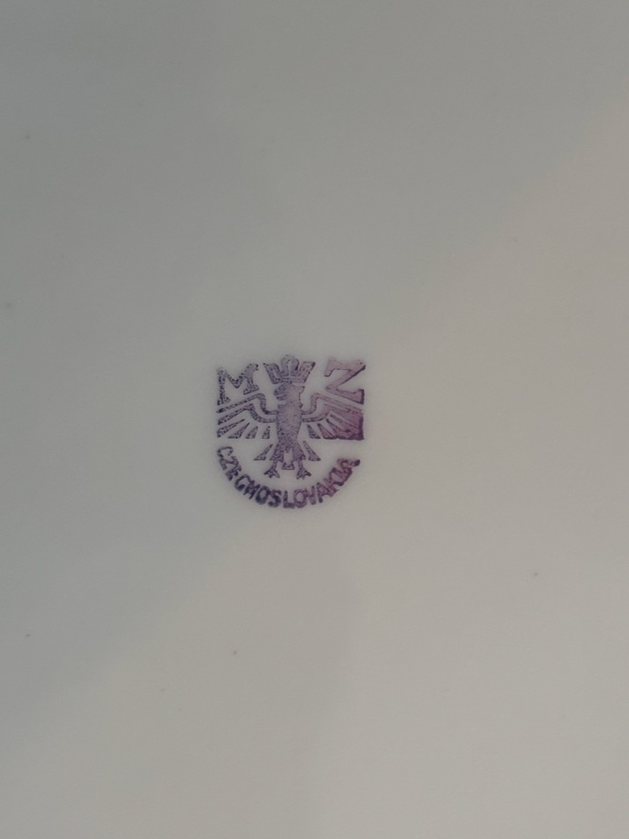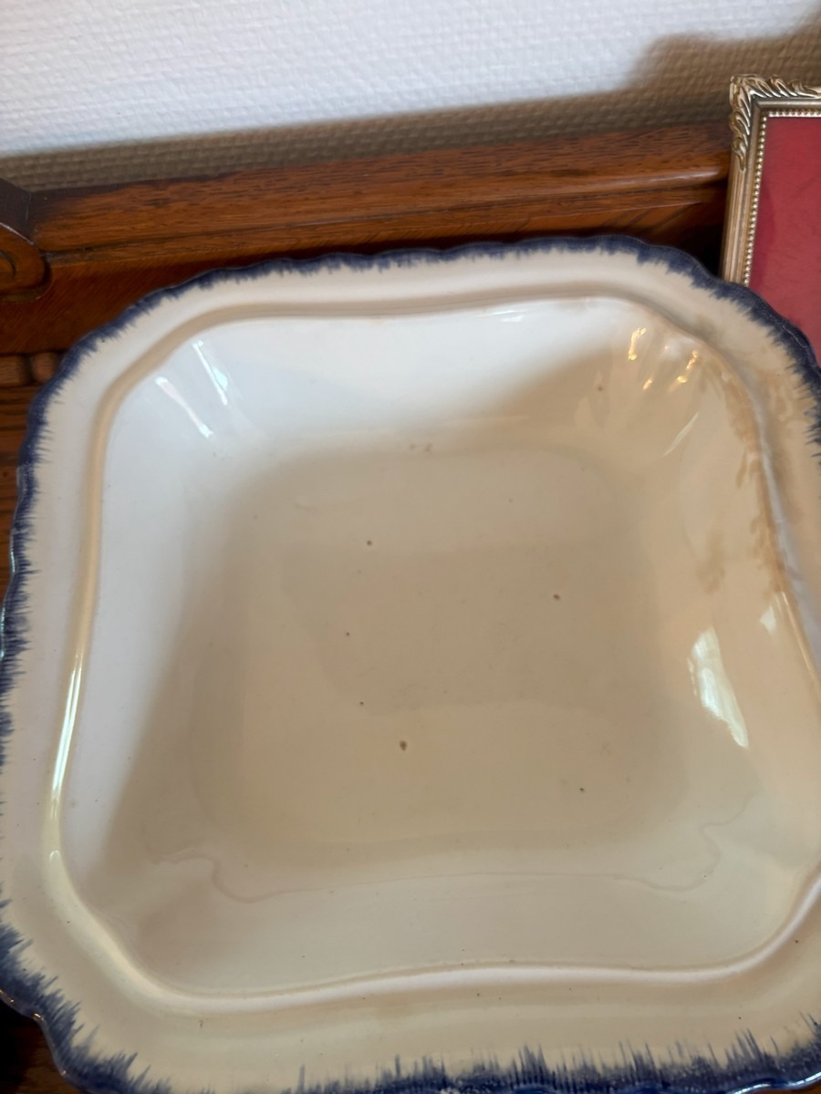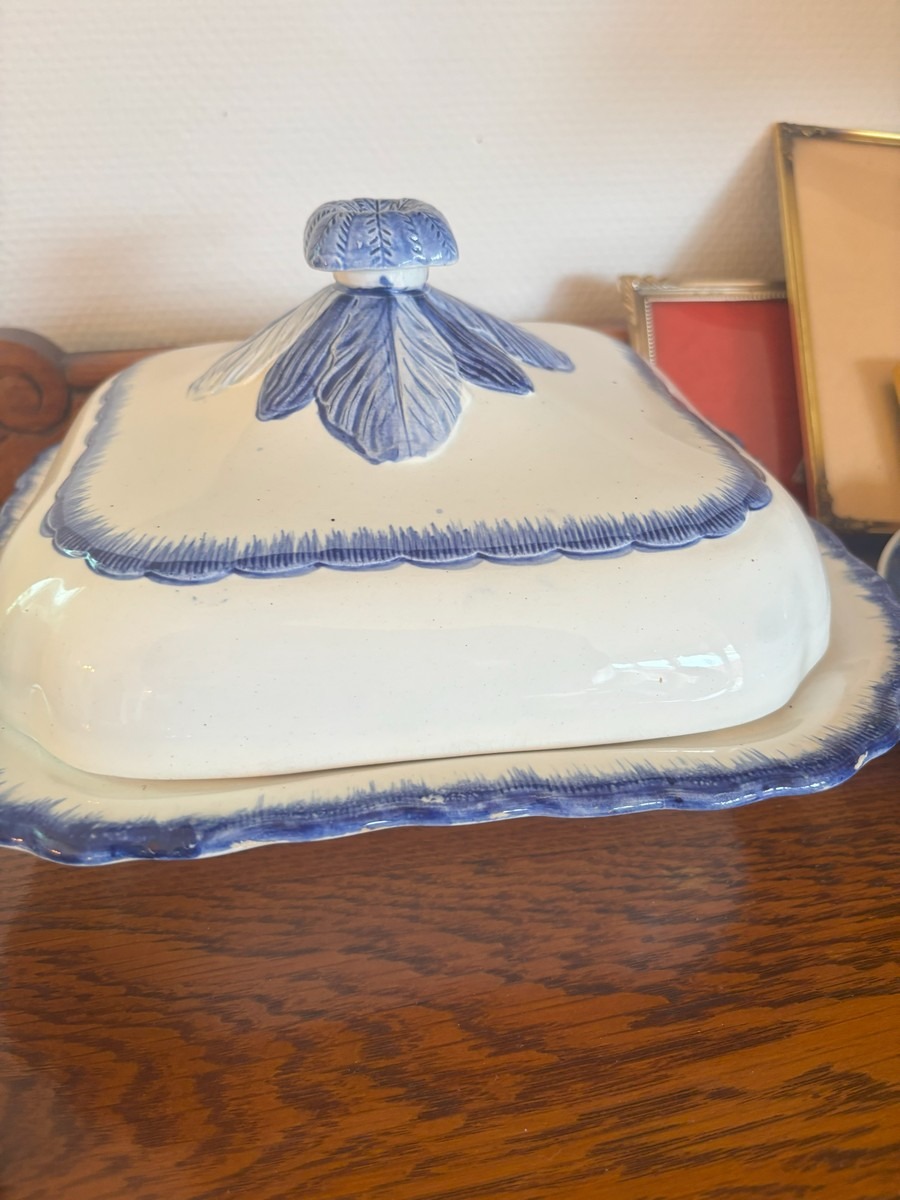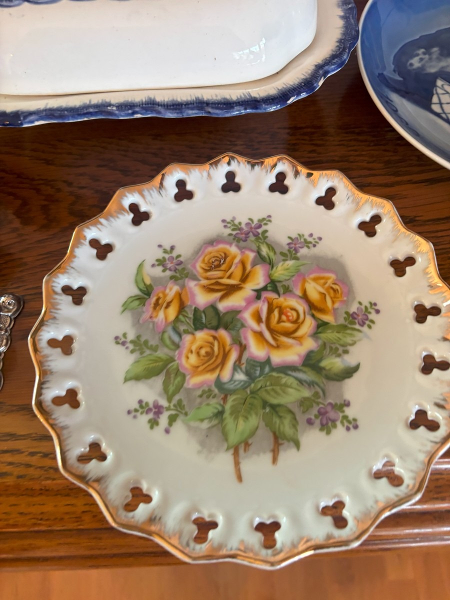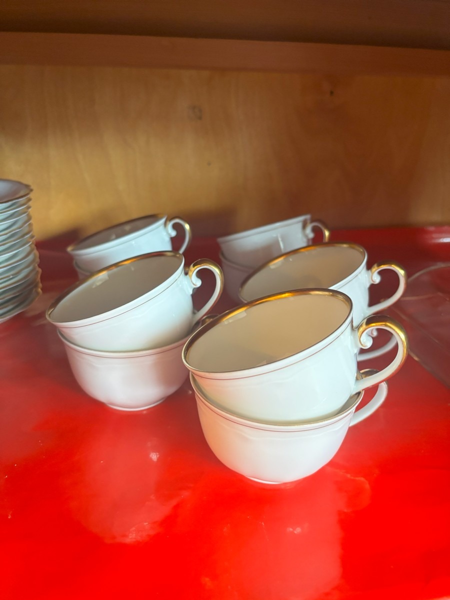 Lot med blandet indbo. Olie på lærred. Diverse steldele med guldkant, forskellige fade samt mindre nips og bordlampe af hvid porcelæn.