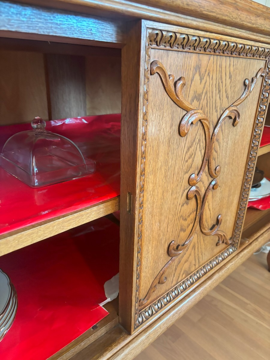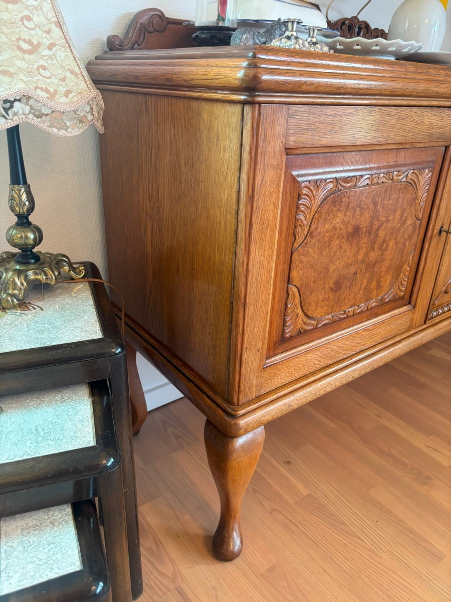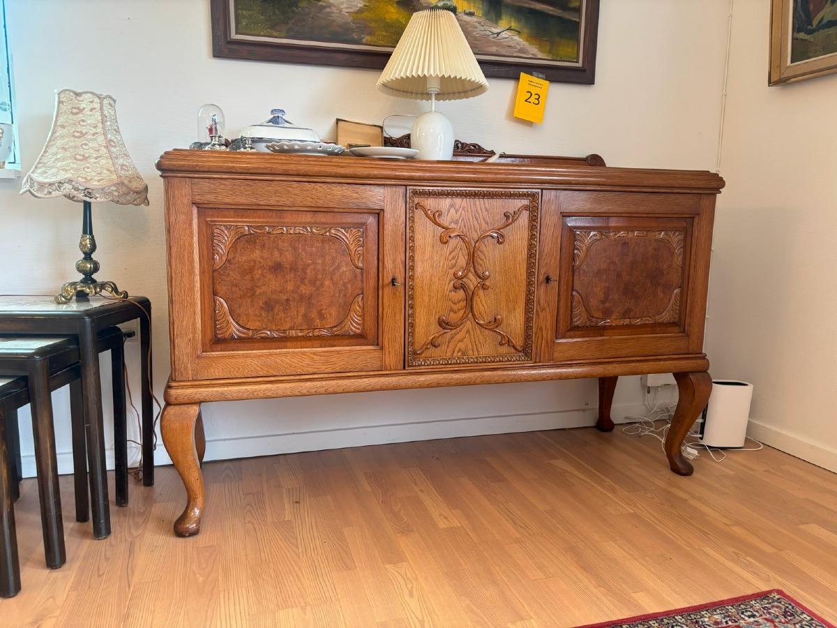 Skænk af bejdset eg. Front med udskæringer og nøddefiner. H. 94, B. 153, D. 51 cm.