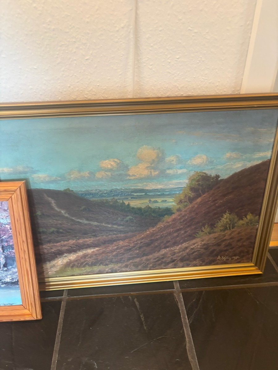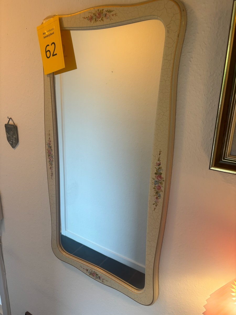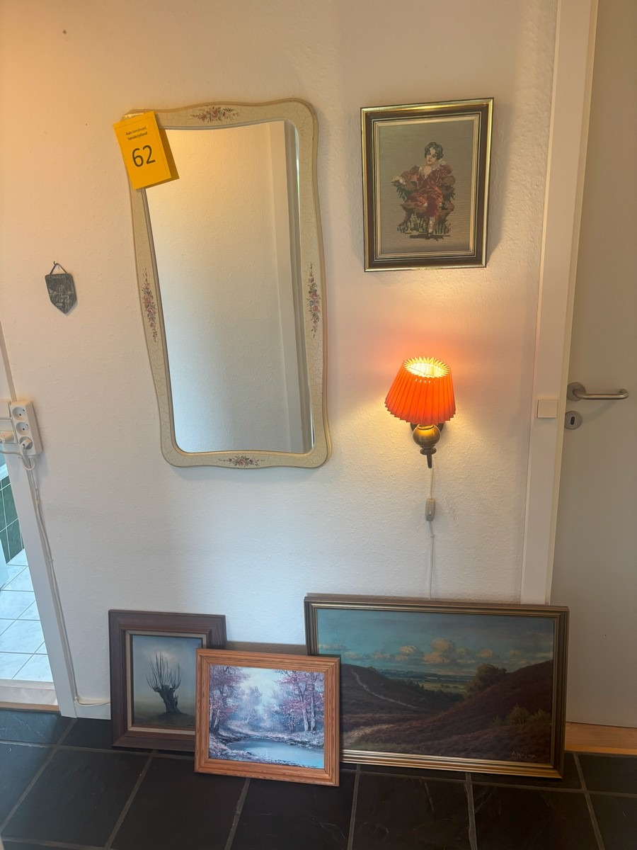 Spejl, billeder og lampet. Spejl 90 x 47 cm. Køber afmonterer selv fra væggen.