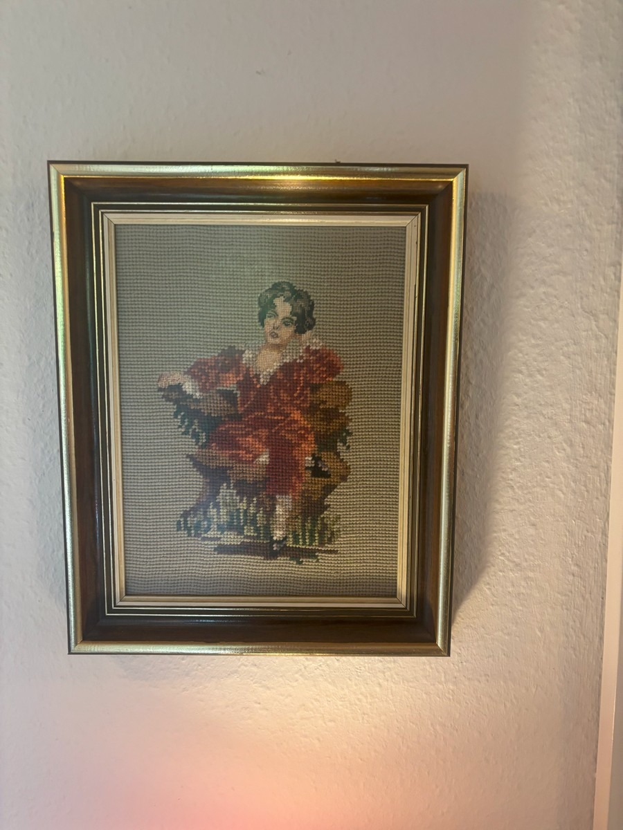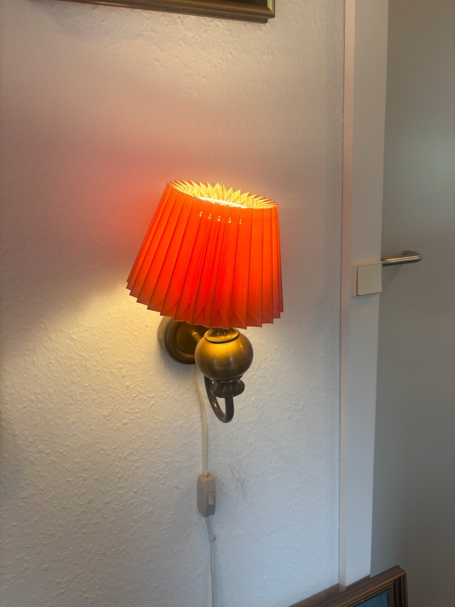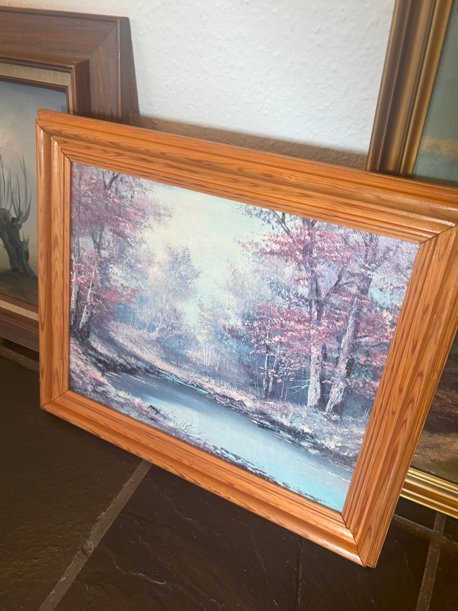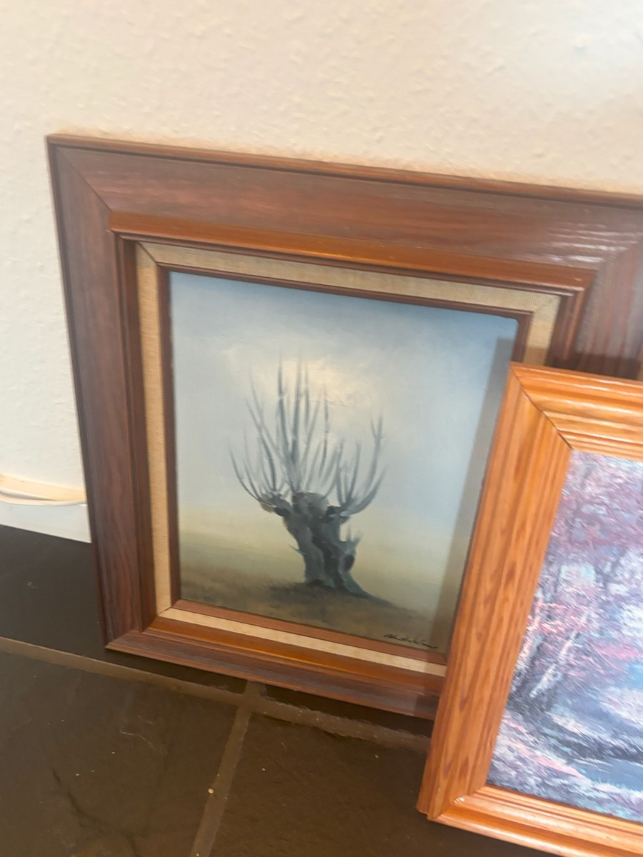 Spejl, billeder og lampet. Spejl 90 x 47 cm. Køber afmonterer selv fra væggen.