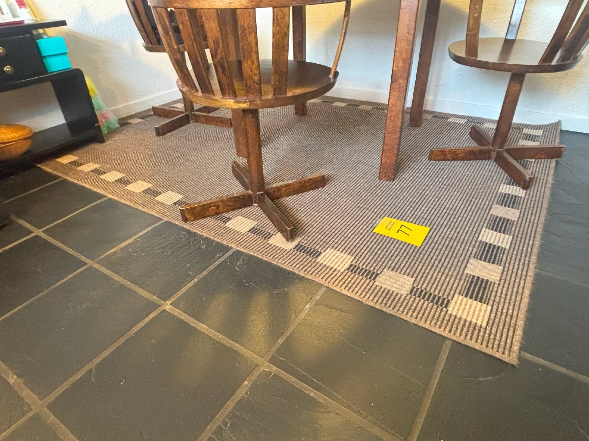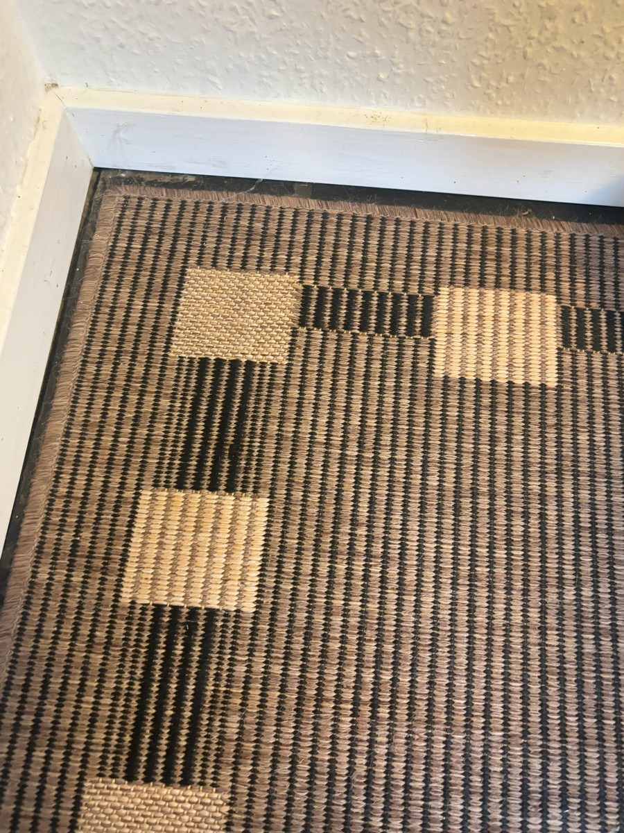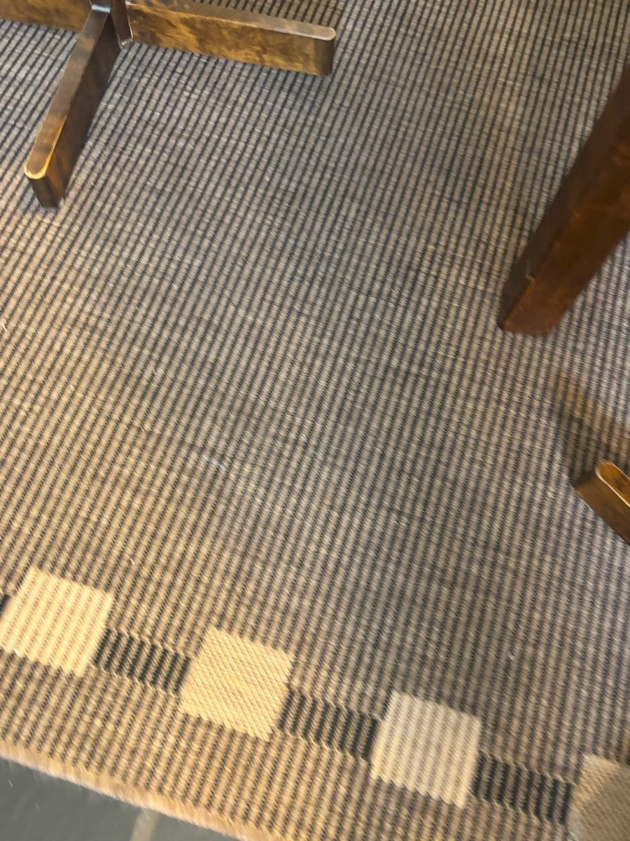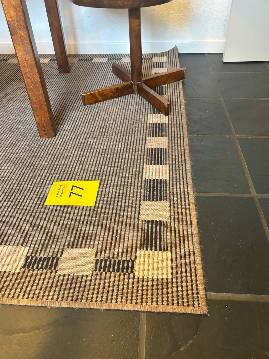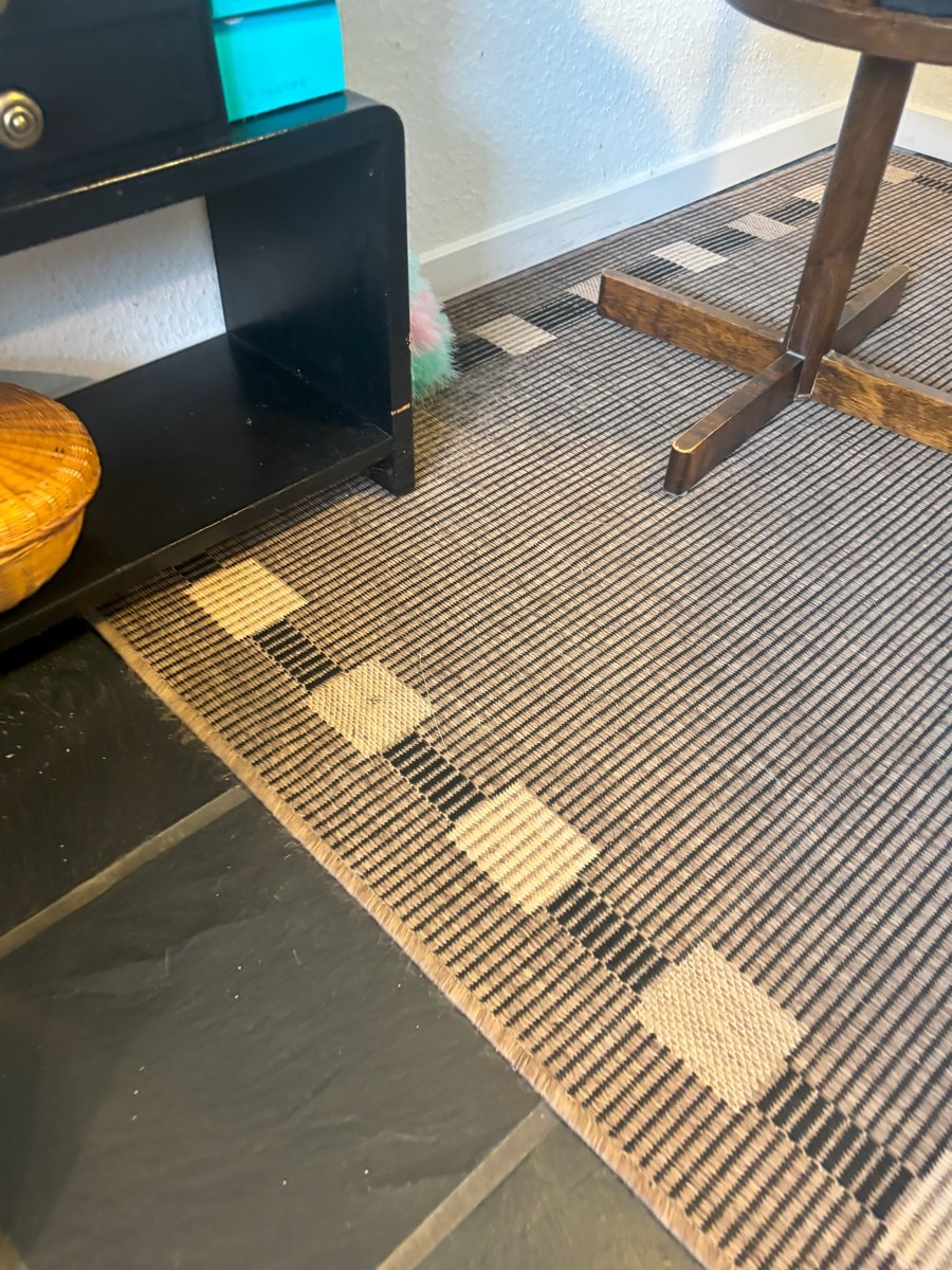 Tæppe af uld. Gummibelægning bagpå smuldrende. 160 x 218 cm.