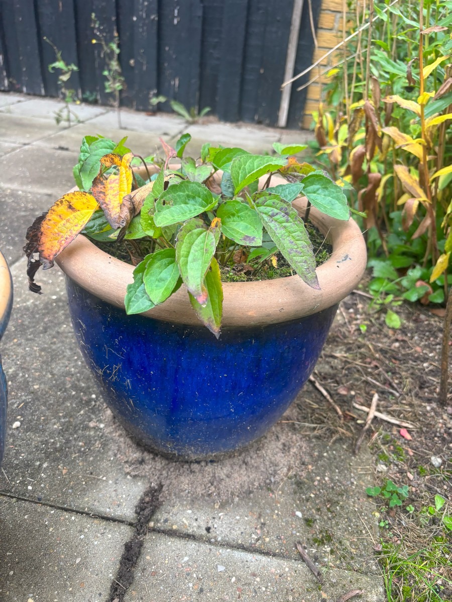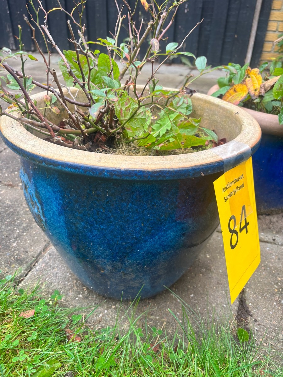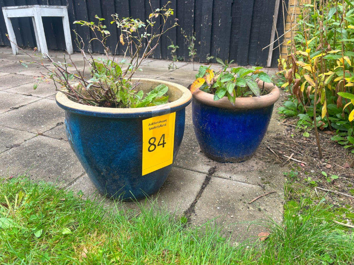 To havekrukker med blå glasur. Største: H. 30, Ø. 35 cm.