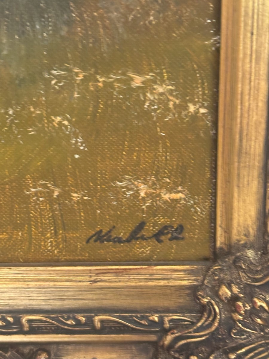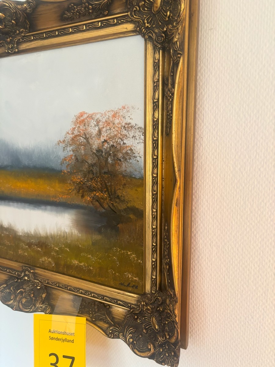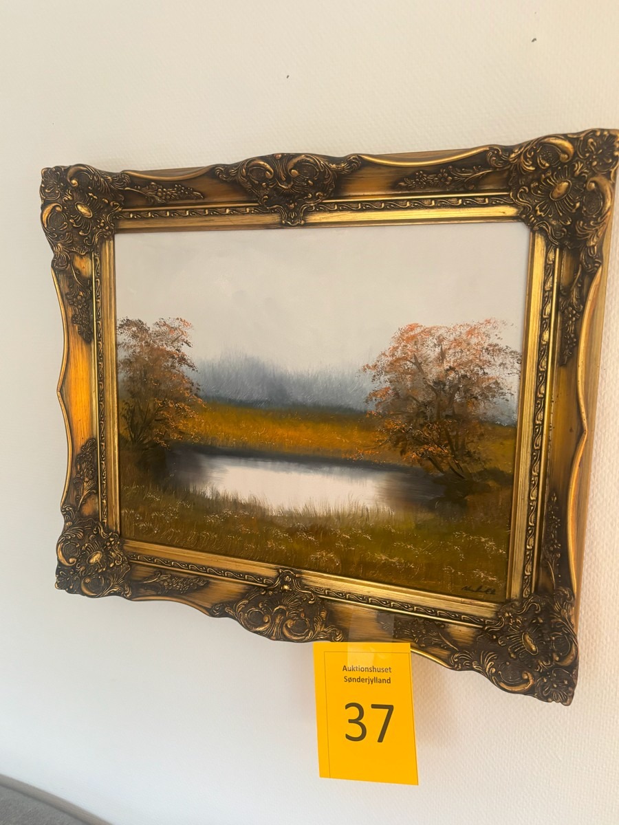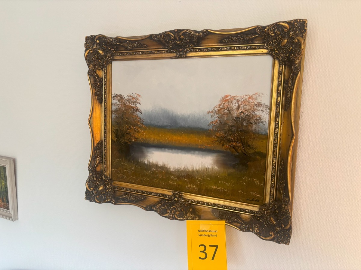 Ubk. kunstner. Olie på lærred. motiv med lille sø. Monteret i forgyldt pragtramme. 43 x 53 cm.