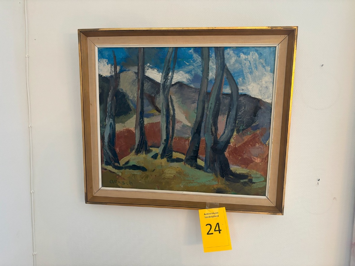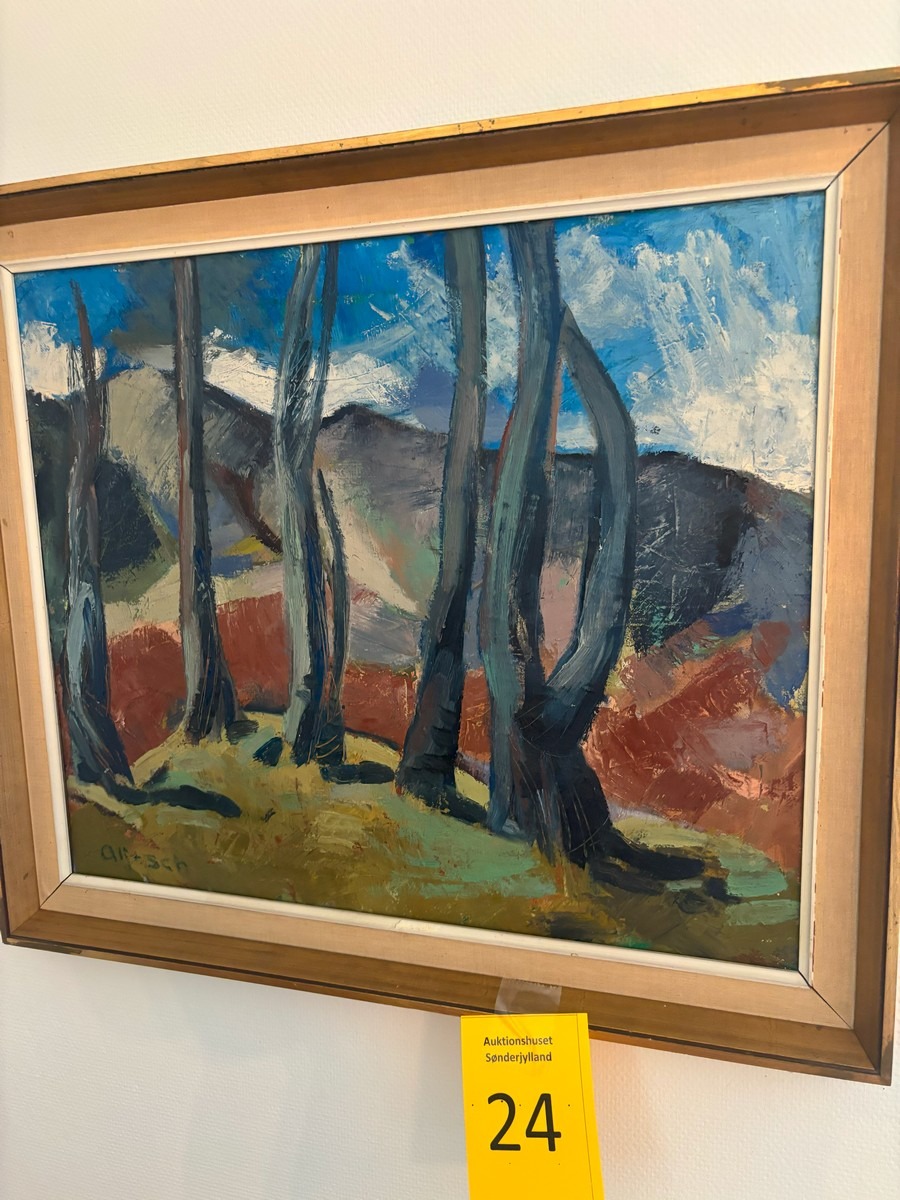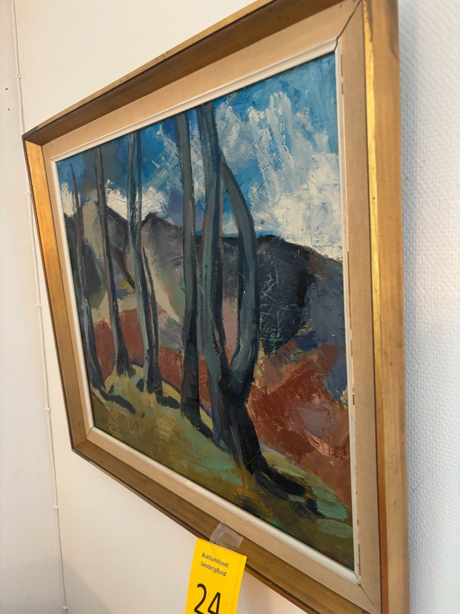 Ubk. kunstner. Parti med træer og bjerge. Olie på lærred. 77 x 67 cm.