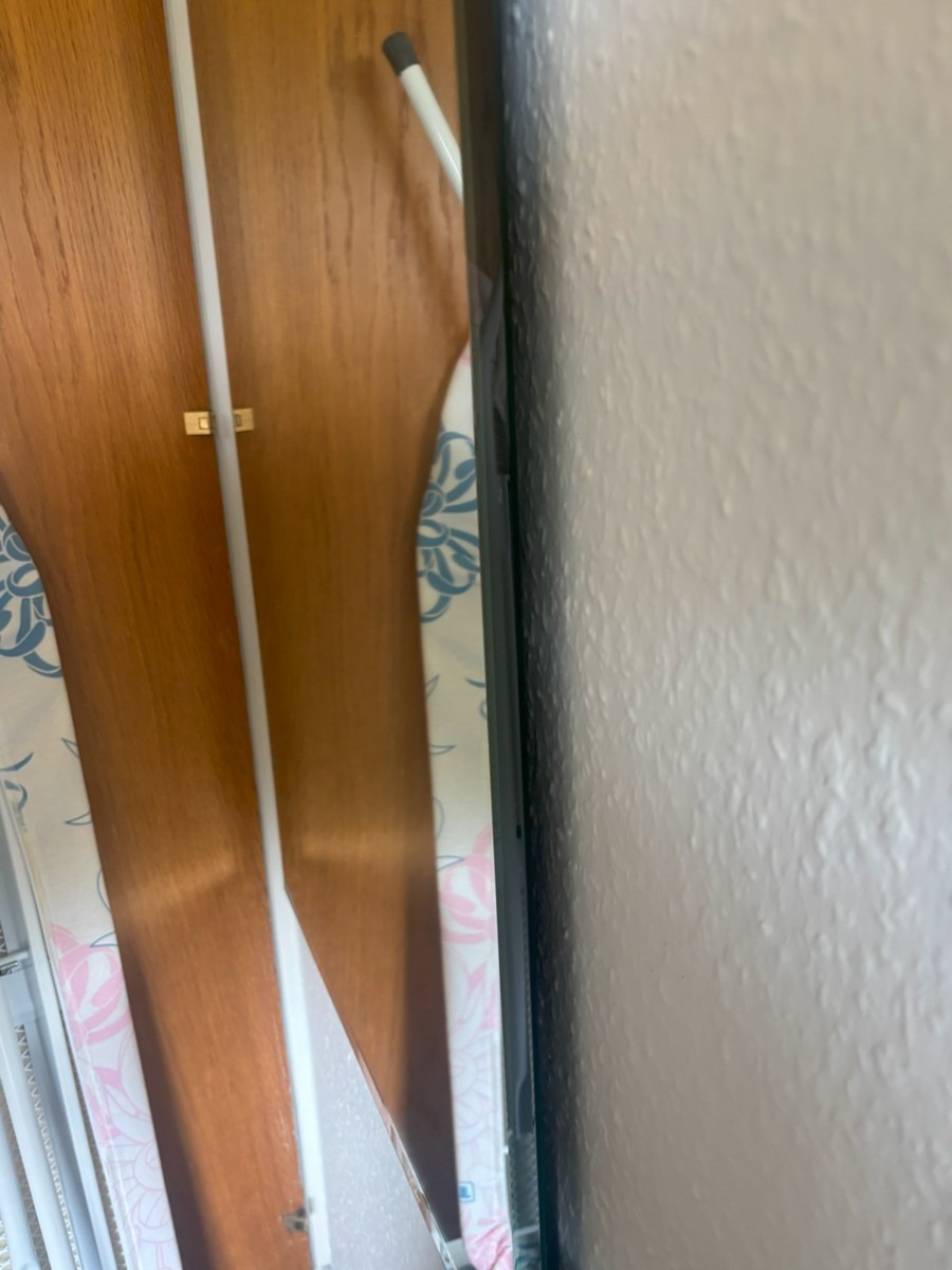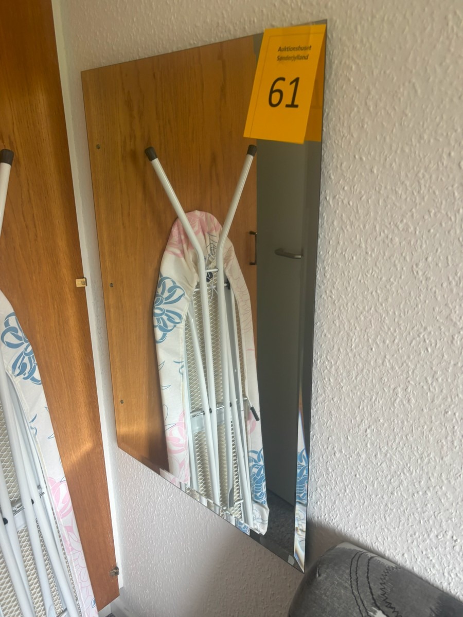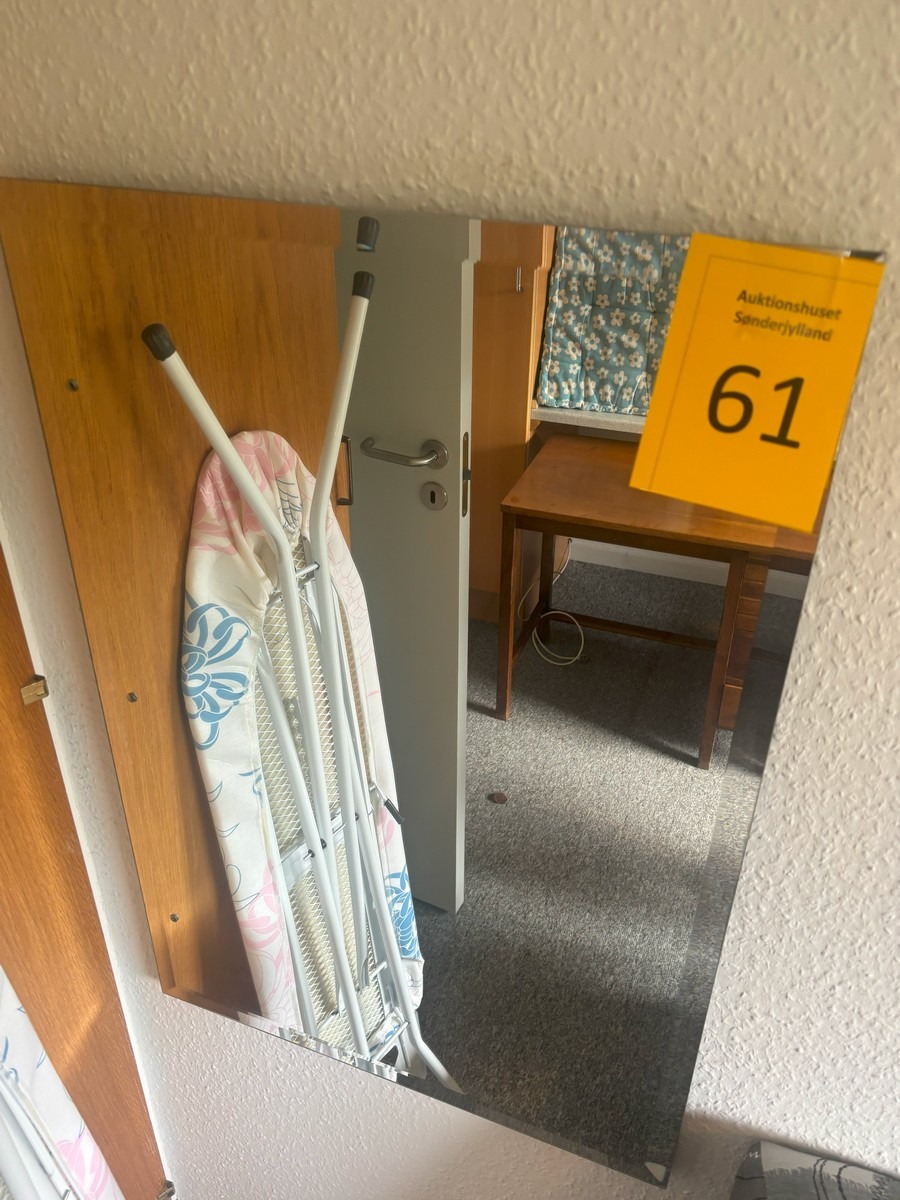 Vægspejl med faceteret kant. 3 montagehuller fra tidligere brug. Køber skal selv afmontere fra væggen. 90 x 60 cm.