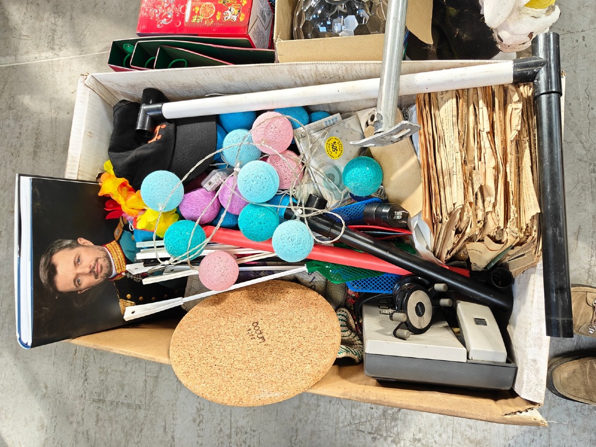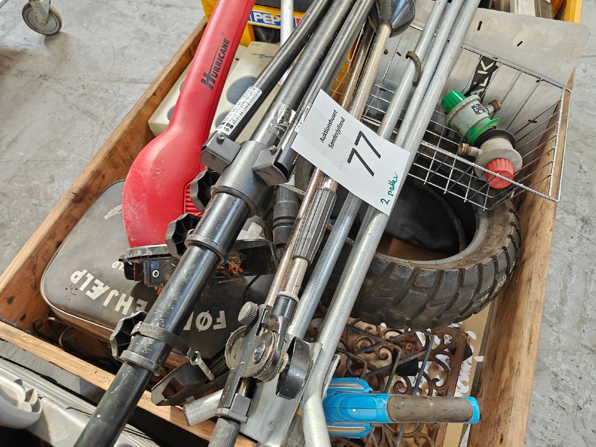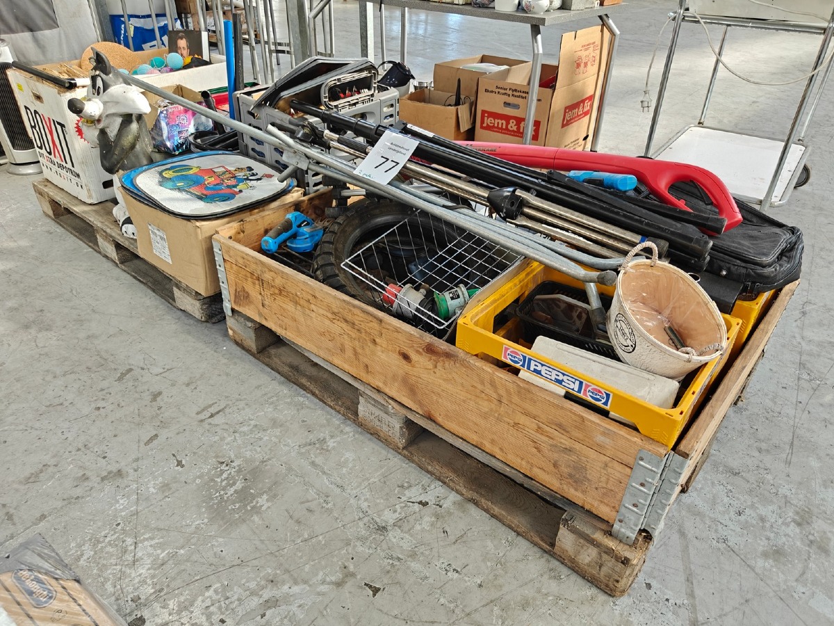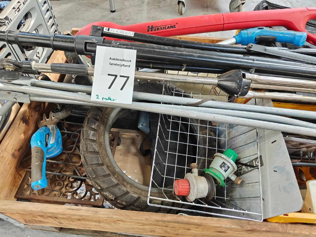 2 paller med blandede genstande. Pallerne medfølger ikke.