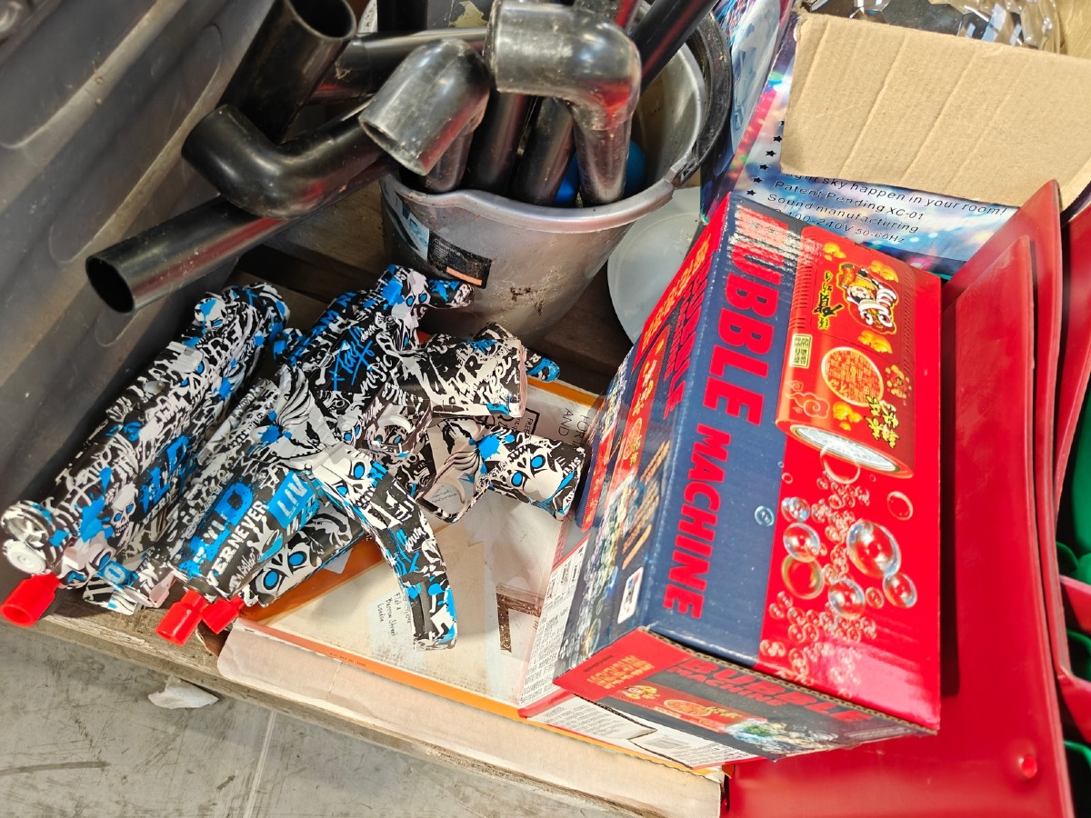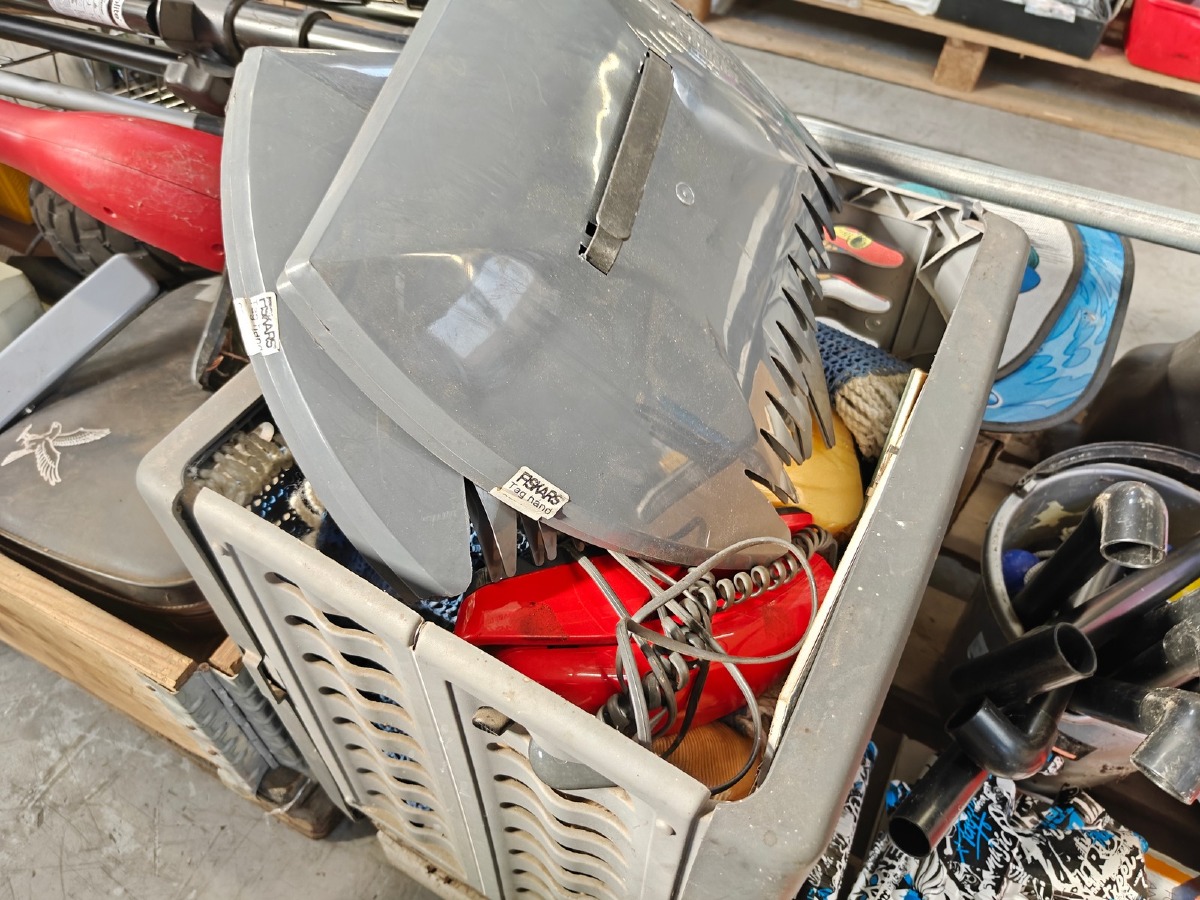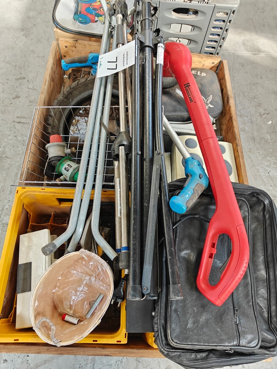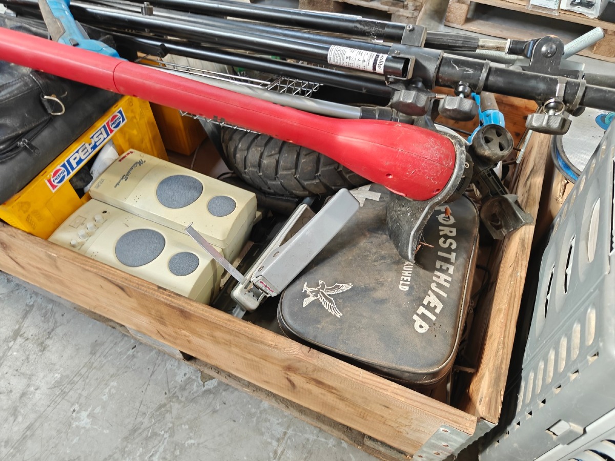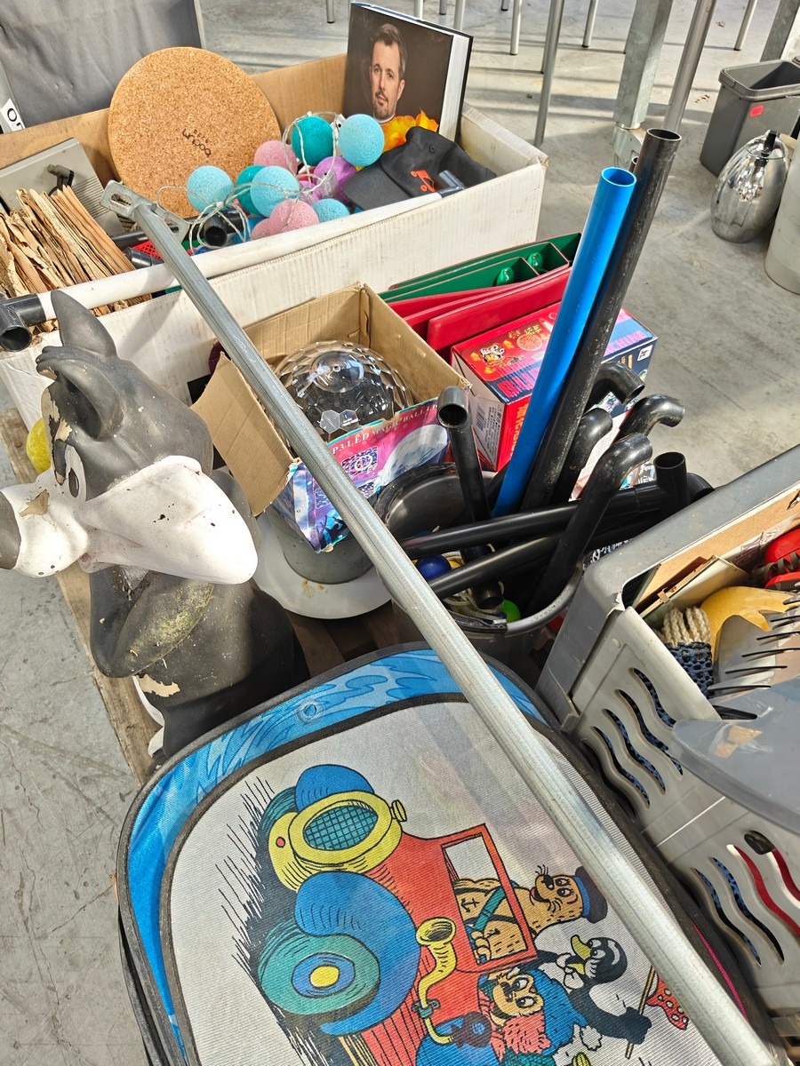 2 paller med blandede genstande. Pallerne medfølger ikke.