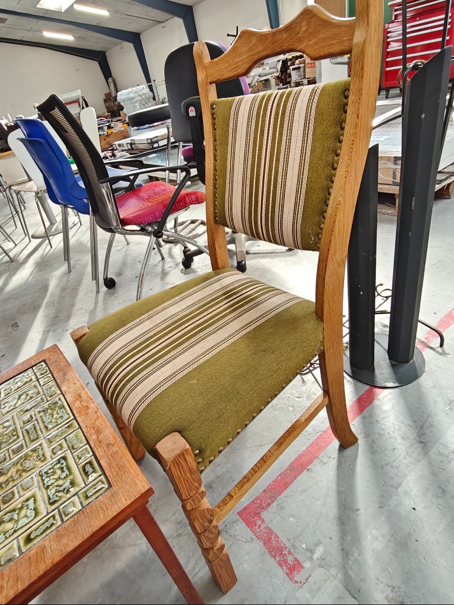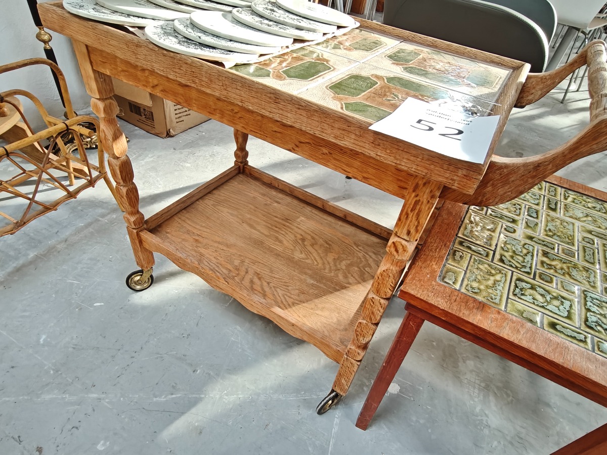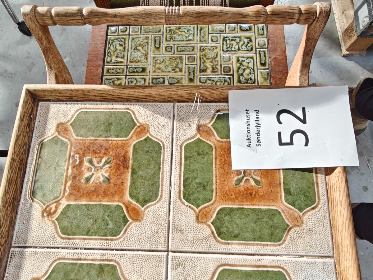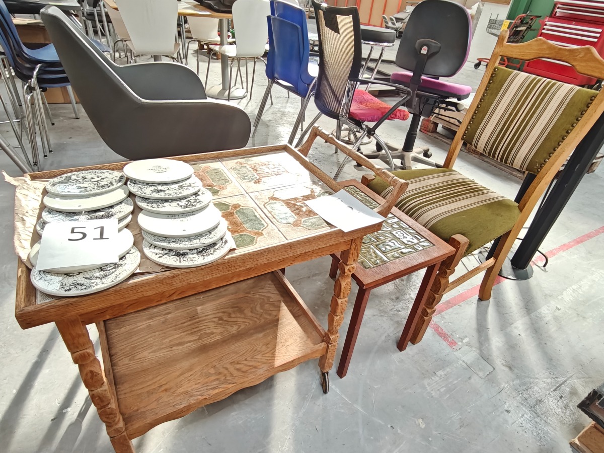 3 mindre møbler: Rullebord af syret eg, topplade monteret med kakler. Lille sidebord af fineret teak med kakler på topplade samt spisestuestol af syret eg.