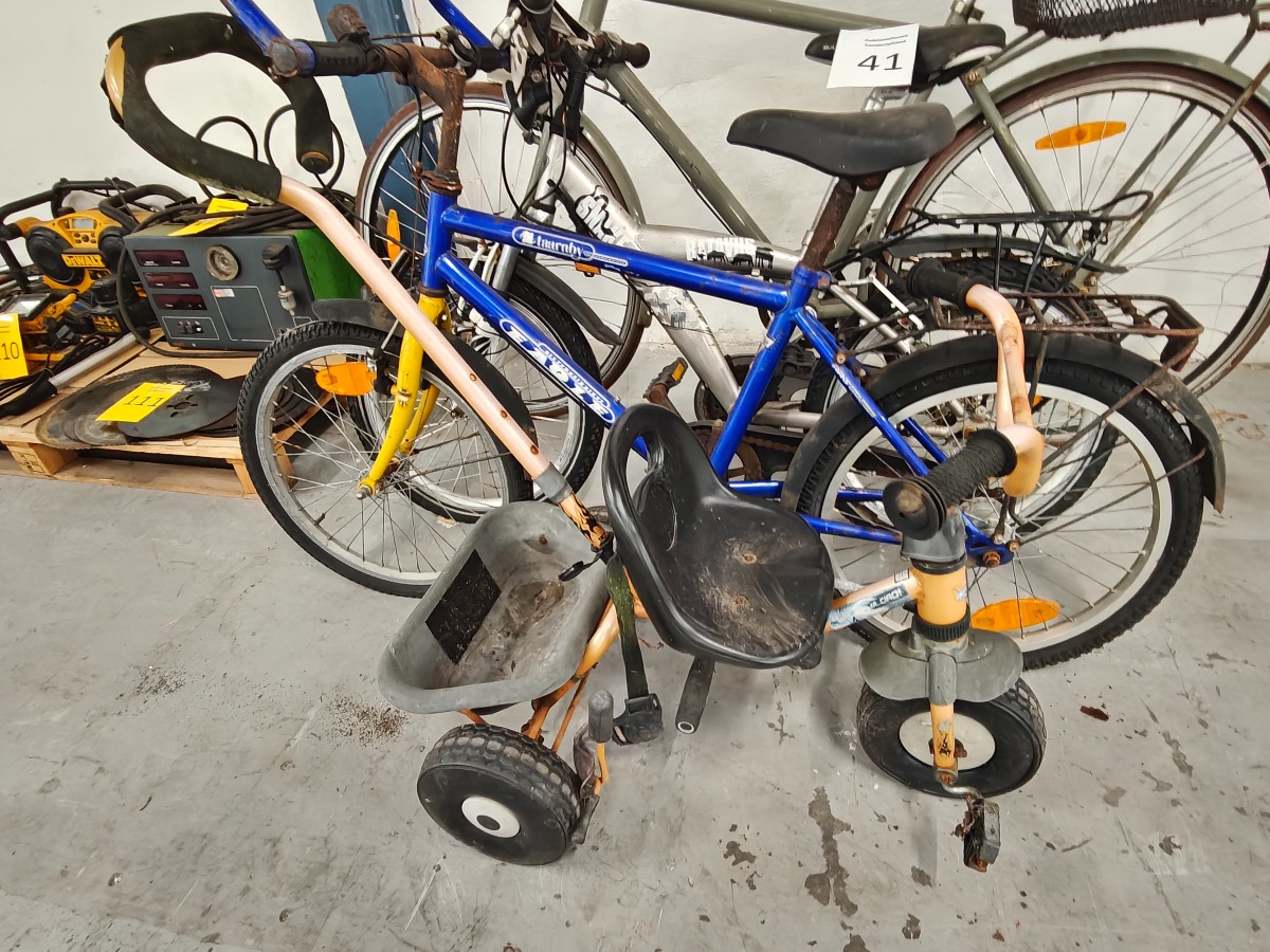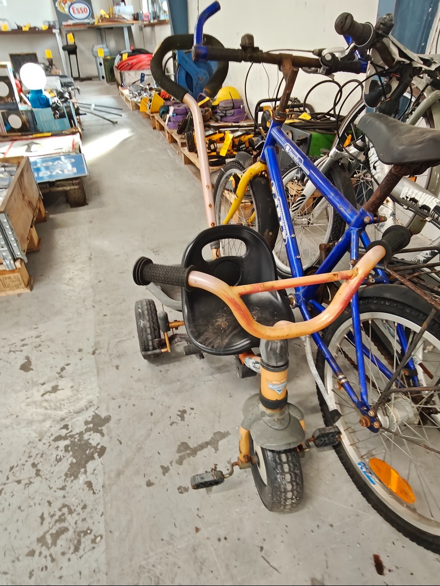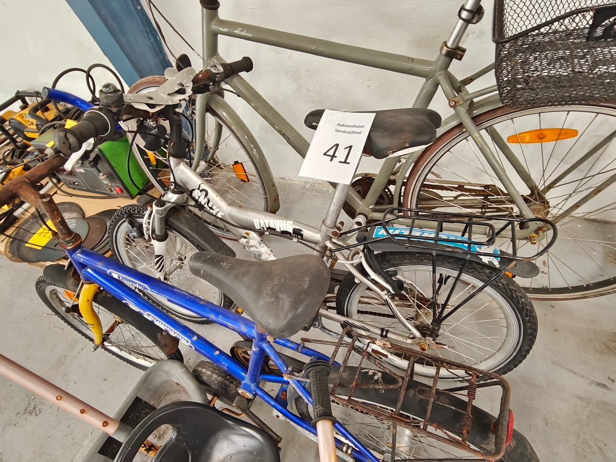4 cykler. 3-hjulet med lad, 2 børnecykler, Taarnby og Batavus samt Ebsen Toulouse herrecykel. Alle cykler er med kraftigt slid og der garanteres ikke for eventuelle mangler og funktionalitet.