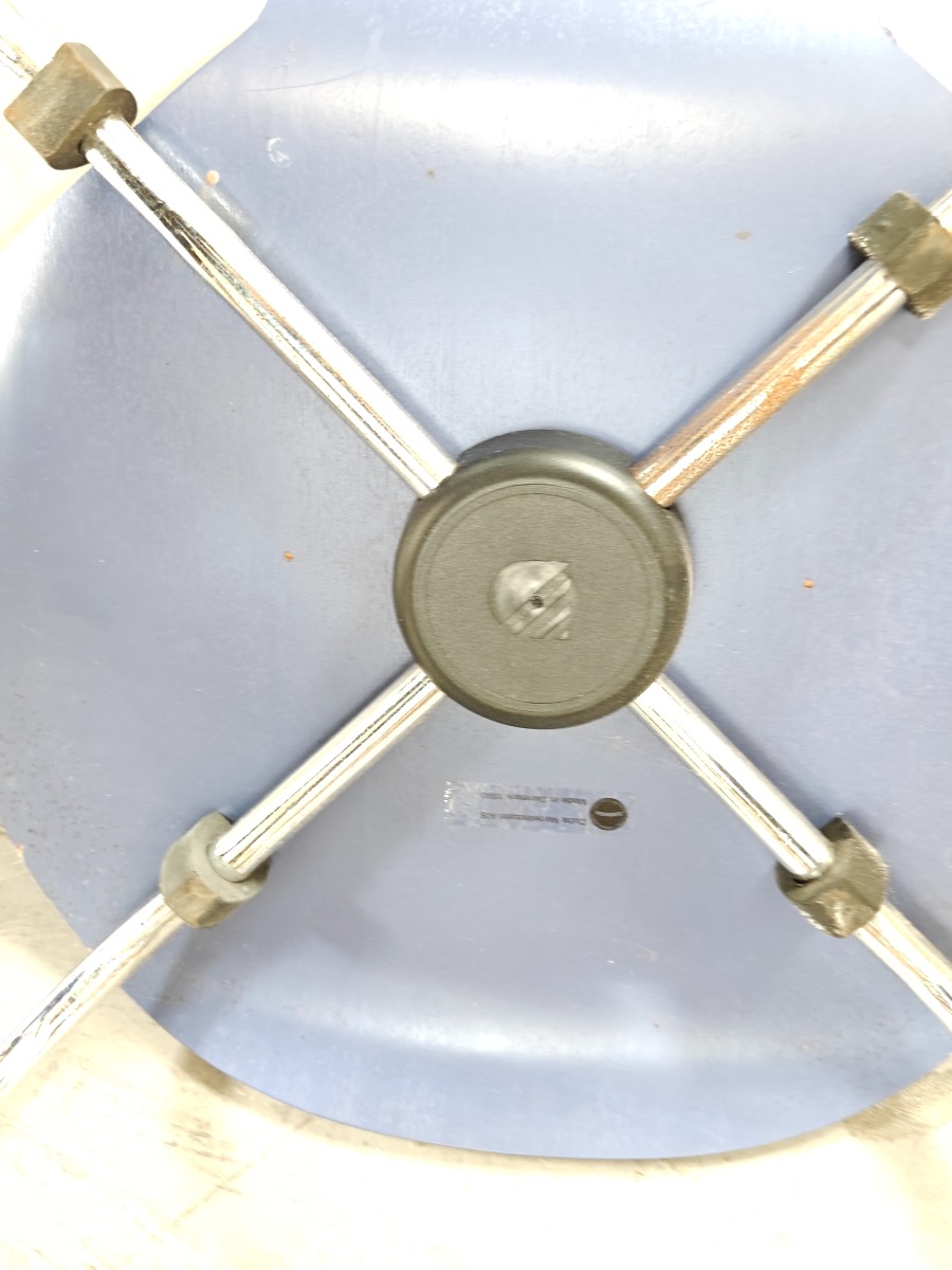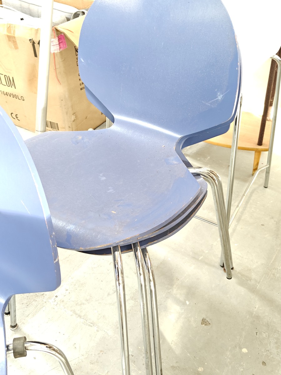 4 Duba skalstole med forkromet stel og blålakerede skaller. Fremstår med en del brugsslid.
