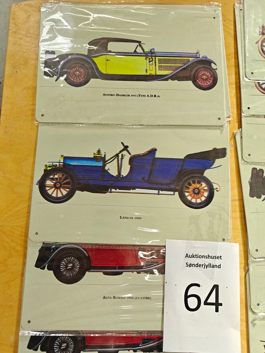 Samling metalskilte med motiver af biler.