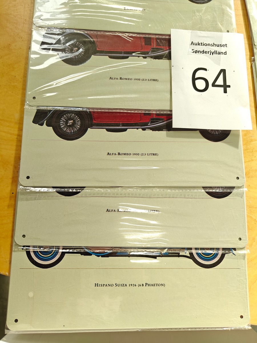 Samling metalskilte med motiver af biler