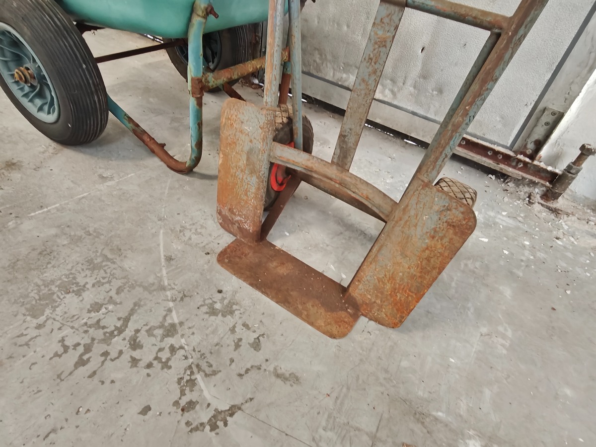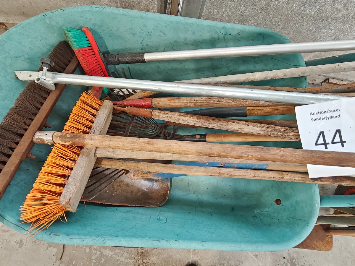 Tohjulet trillebør med balje af plast. Hertil div. håndredskaber samt sækkevogn. Alle dele med brugsspor.