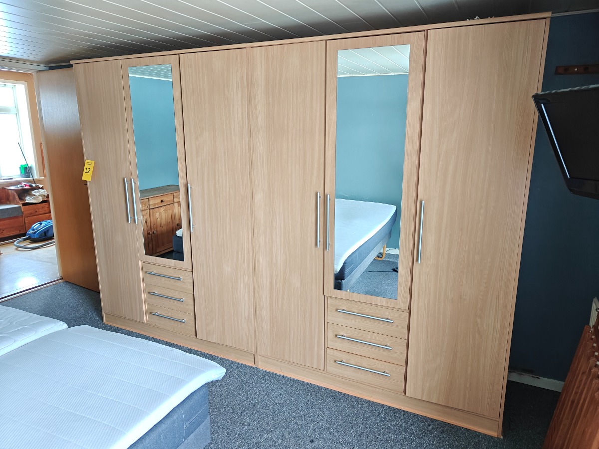 2 stk. 3-fløjede klædeskabe af bøgelaminat. Indrettet med hylder, skuffer og bøjlestang. Pr. sektion: H: 200, B. 146, D. 58 cm. står i rygerhjem.
