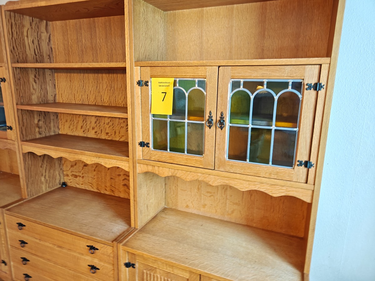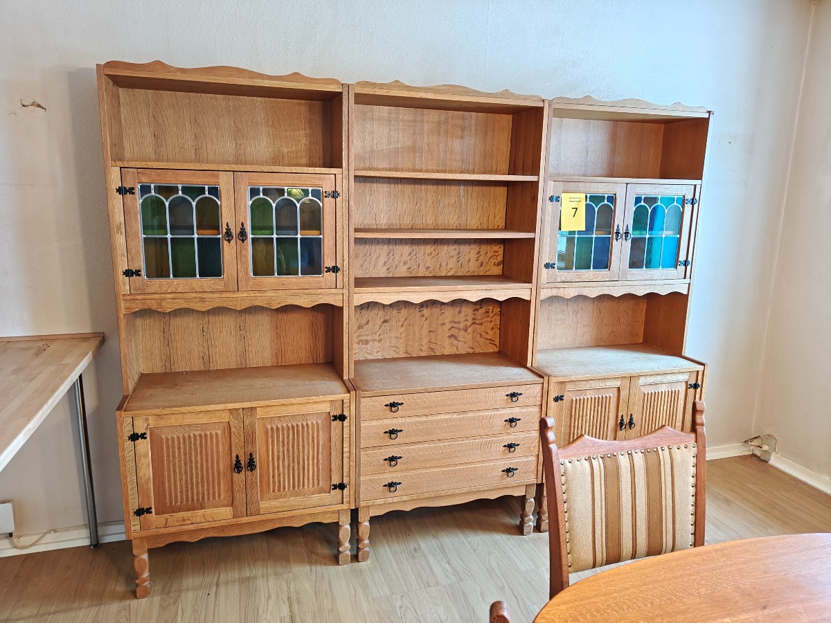 3-fløjet reol af syret eg. 2 af sektionerne med vitrinedel med blyindfattet glas. Mål pr. sektion: H. 180, B. 78, D. 42 cm. Står i rygerhjem.