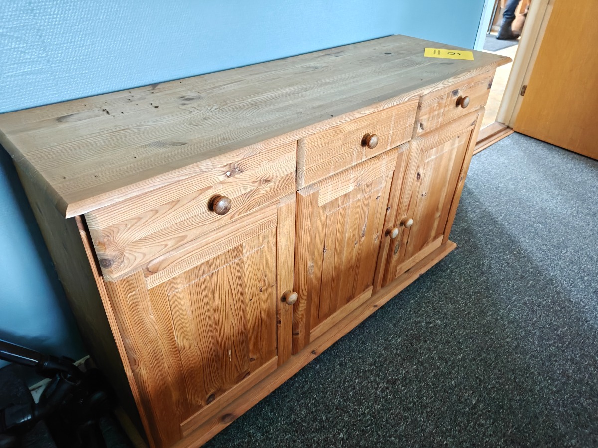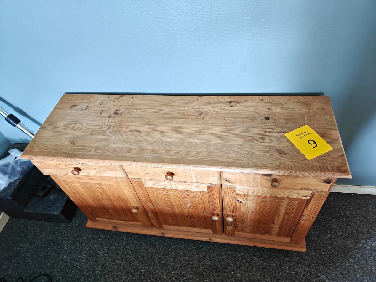 3-fløjet skænk af fyr med 3 skuffer og låger i front. H. 78, B. 130, D. 41 cm. står i rygerhjem.