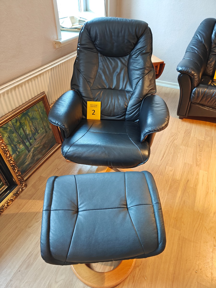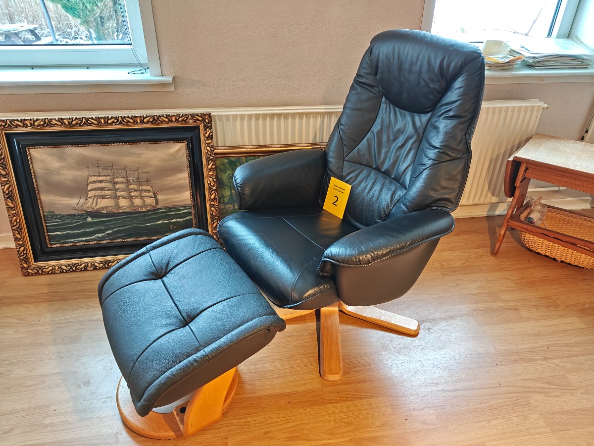 Hvilestol med fodskammel. Stel af bøg monteret med læder og kunstlæder. Mindre brugsspor. Står i rygerhjem.