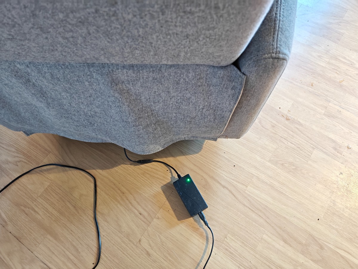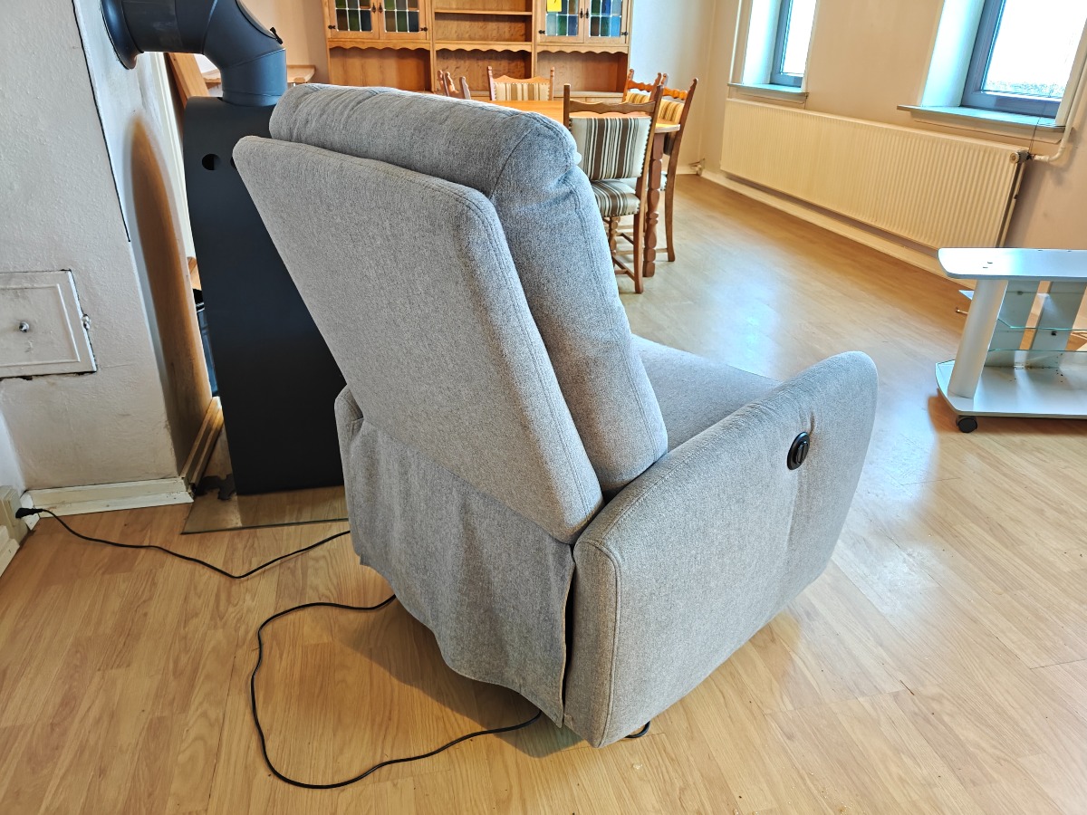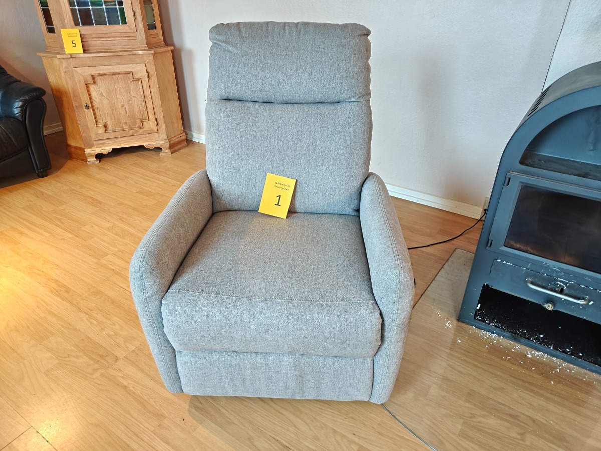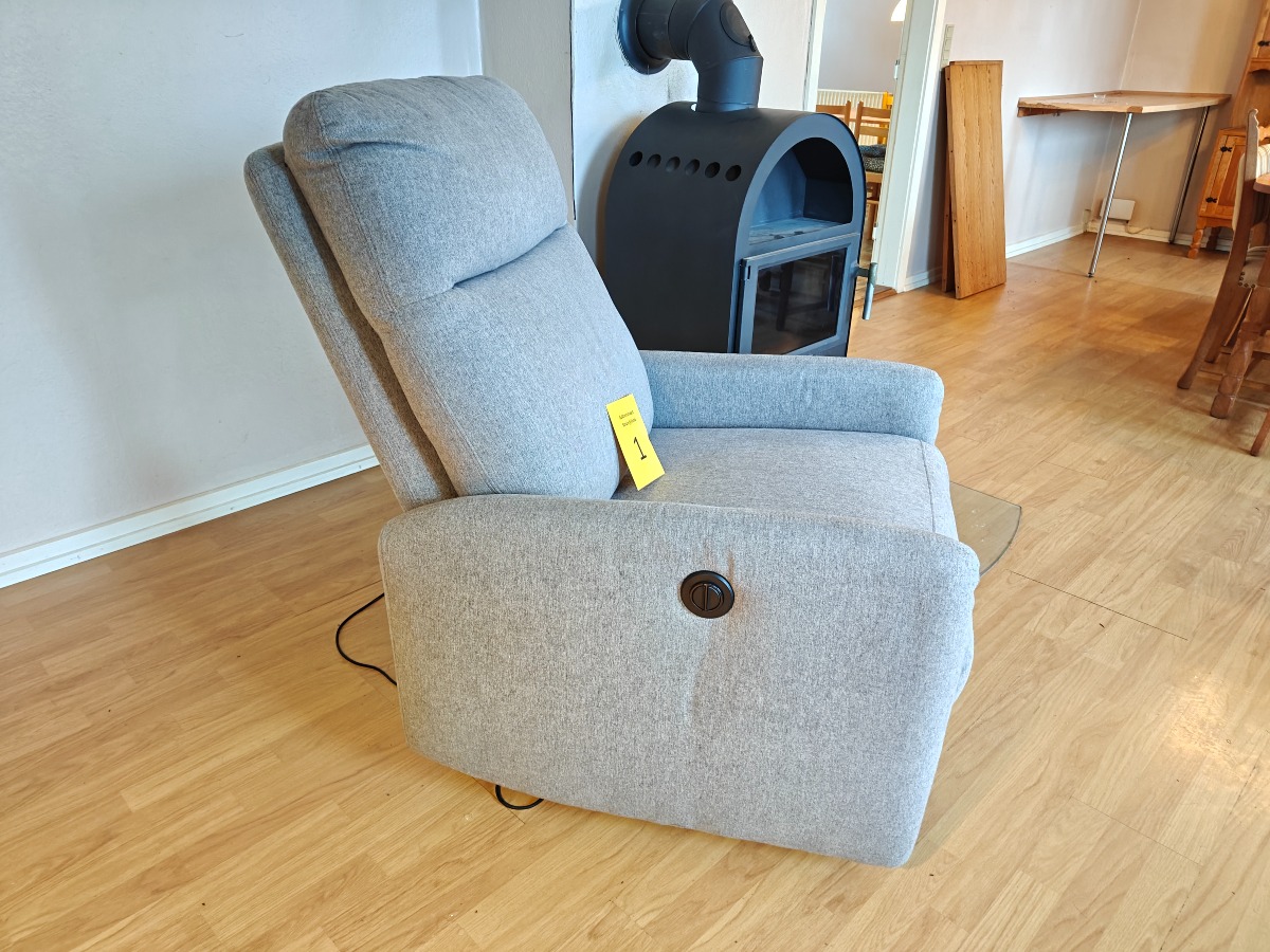 Lænestol med vippefunktion og fodstøtte. Elektrisk. Monteret med lysegråt stof. Mindre brugsspor. Stolen står i et rygerhjem.