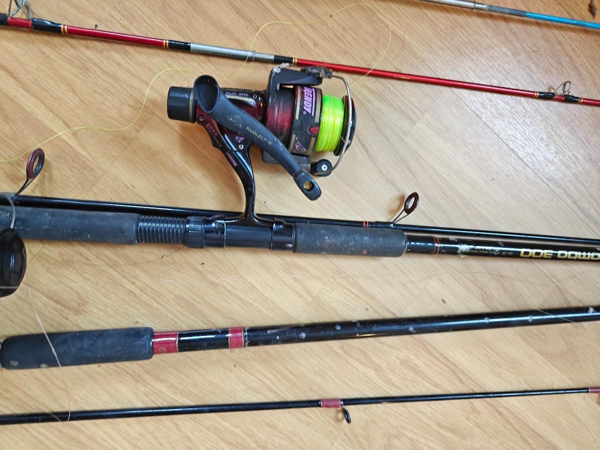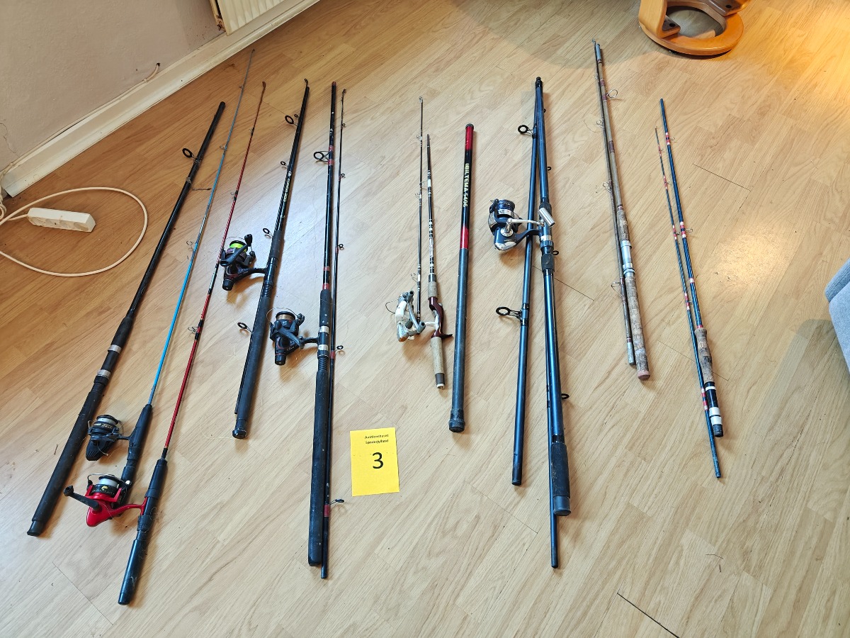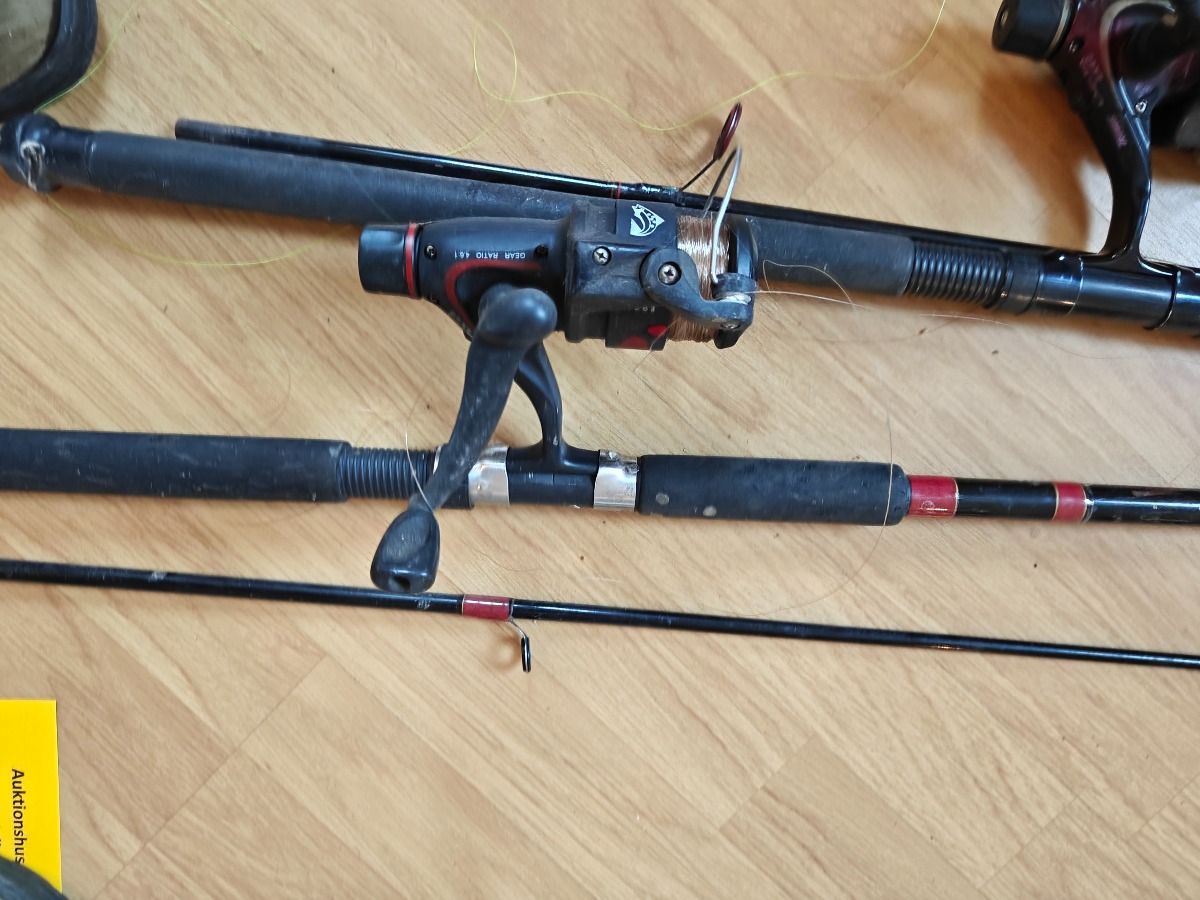 Stort lot fiskestænger samt hjul. 10 stænger og 6 hjul. Både til kyst, vandløb og medefiskeri. Vi garanterer ikke for funktionaliteten.