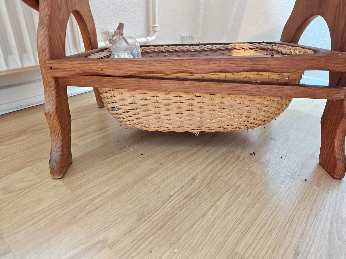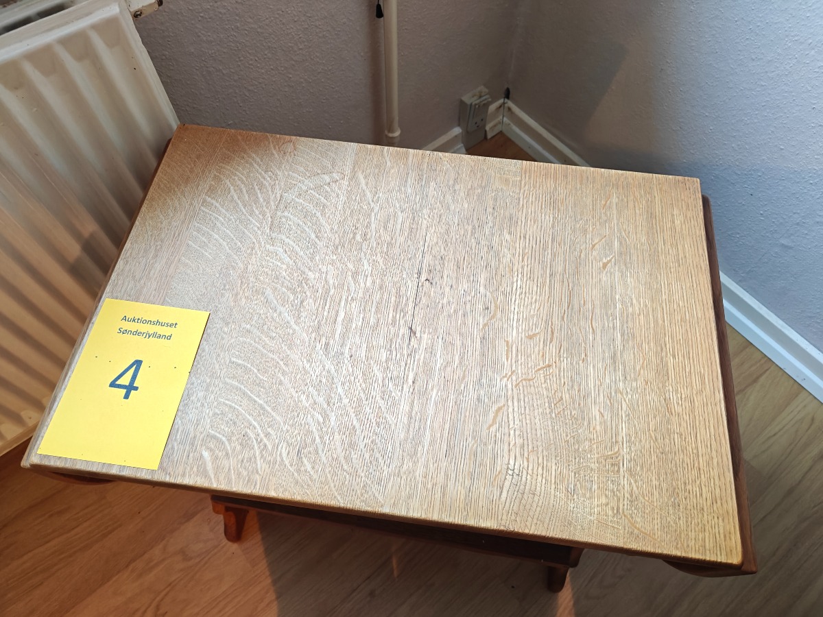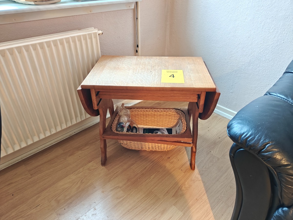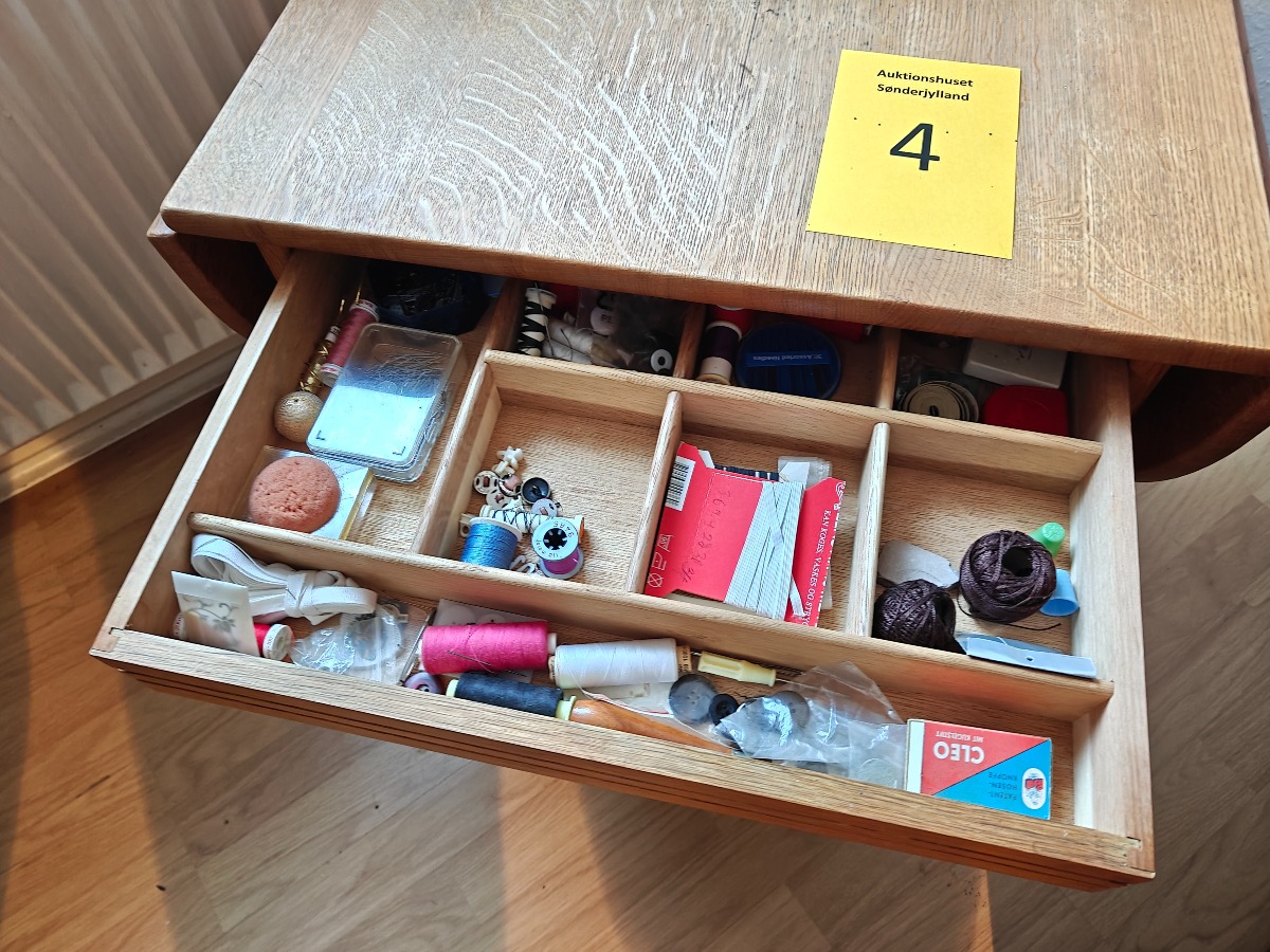 Sybord/sidebord af syret eg. Bordplade med to klapper, skuffe med ruminddeling samt garnkurv. Enkelte løse samlinger. H. 53, B. 59D. 40 cm. Møblet står i et rygerhjem.