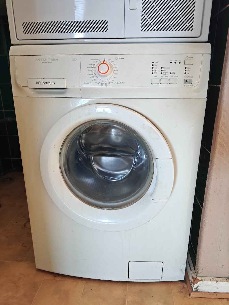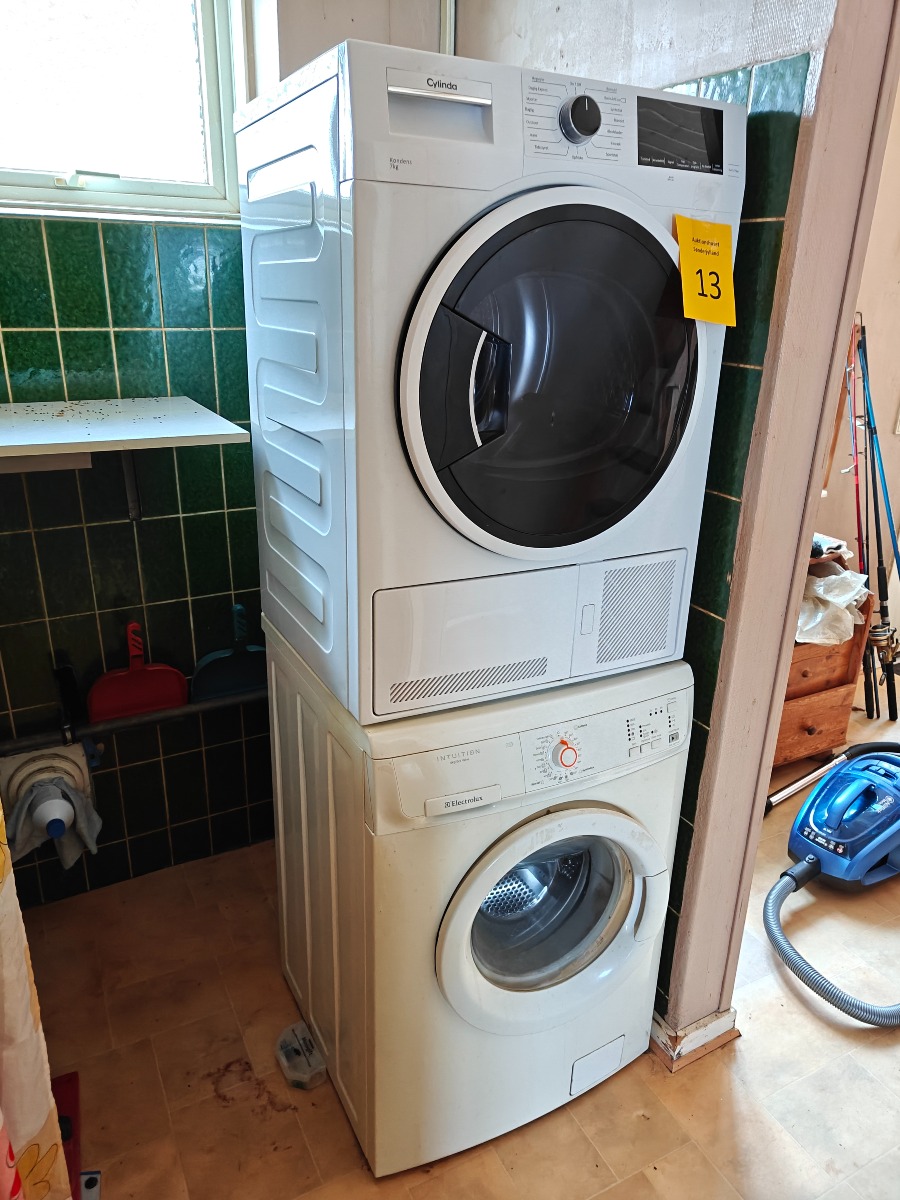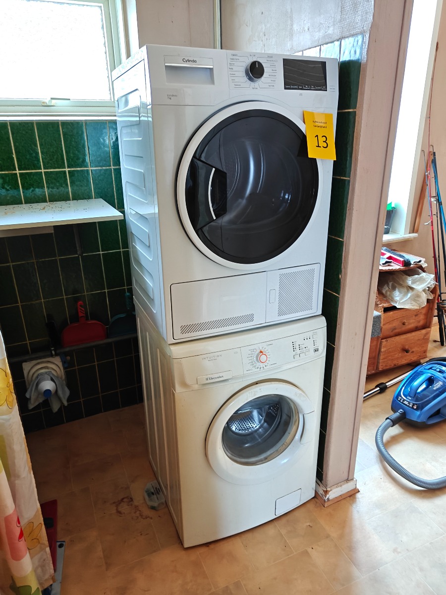 Vaskesøjle bestående af Elektrolux Intuition vaskemaskine og Cylinda kondenstørretumbler. Årgang og stand er ukendt. Vi garanterer ikke for funktionaliteten.