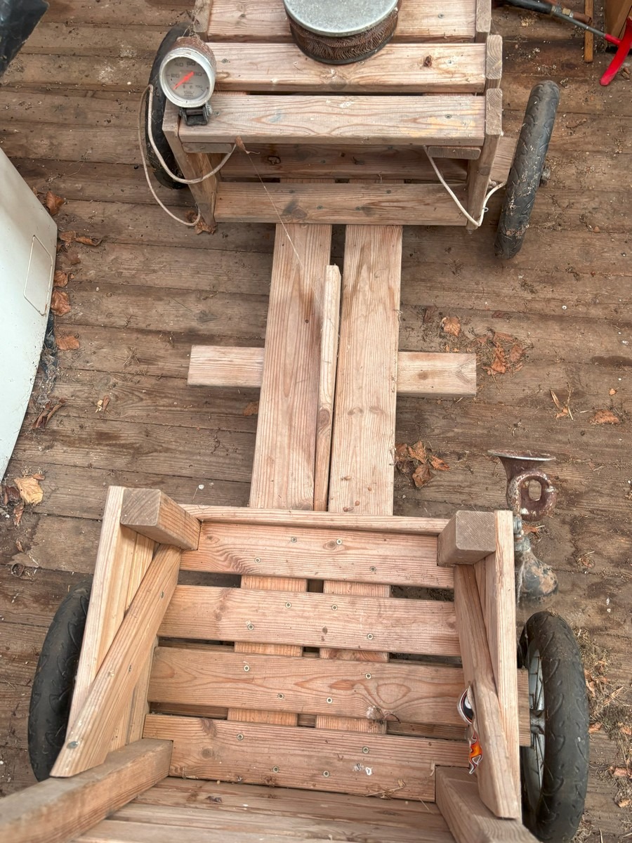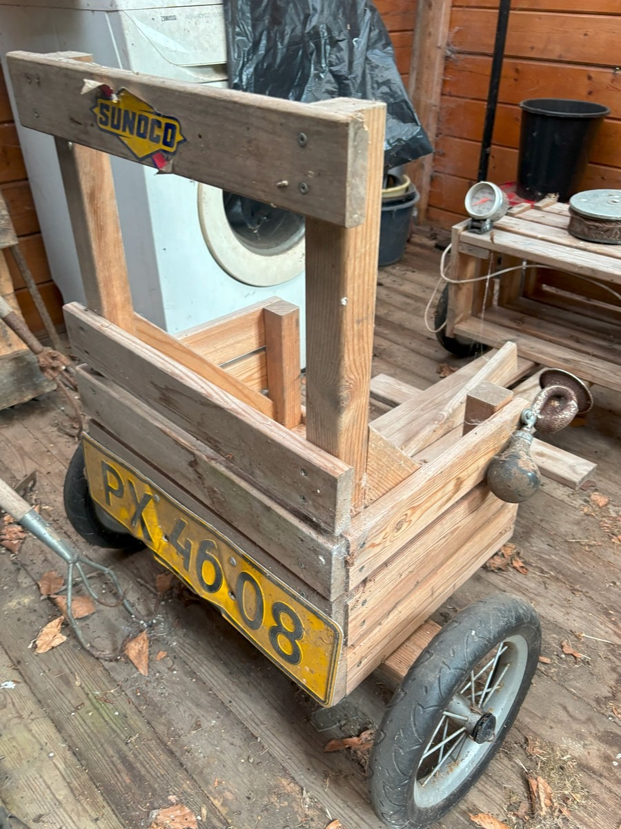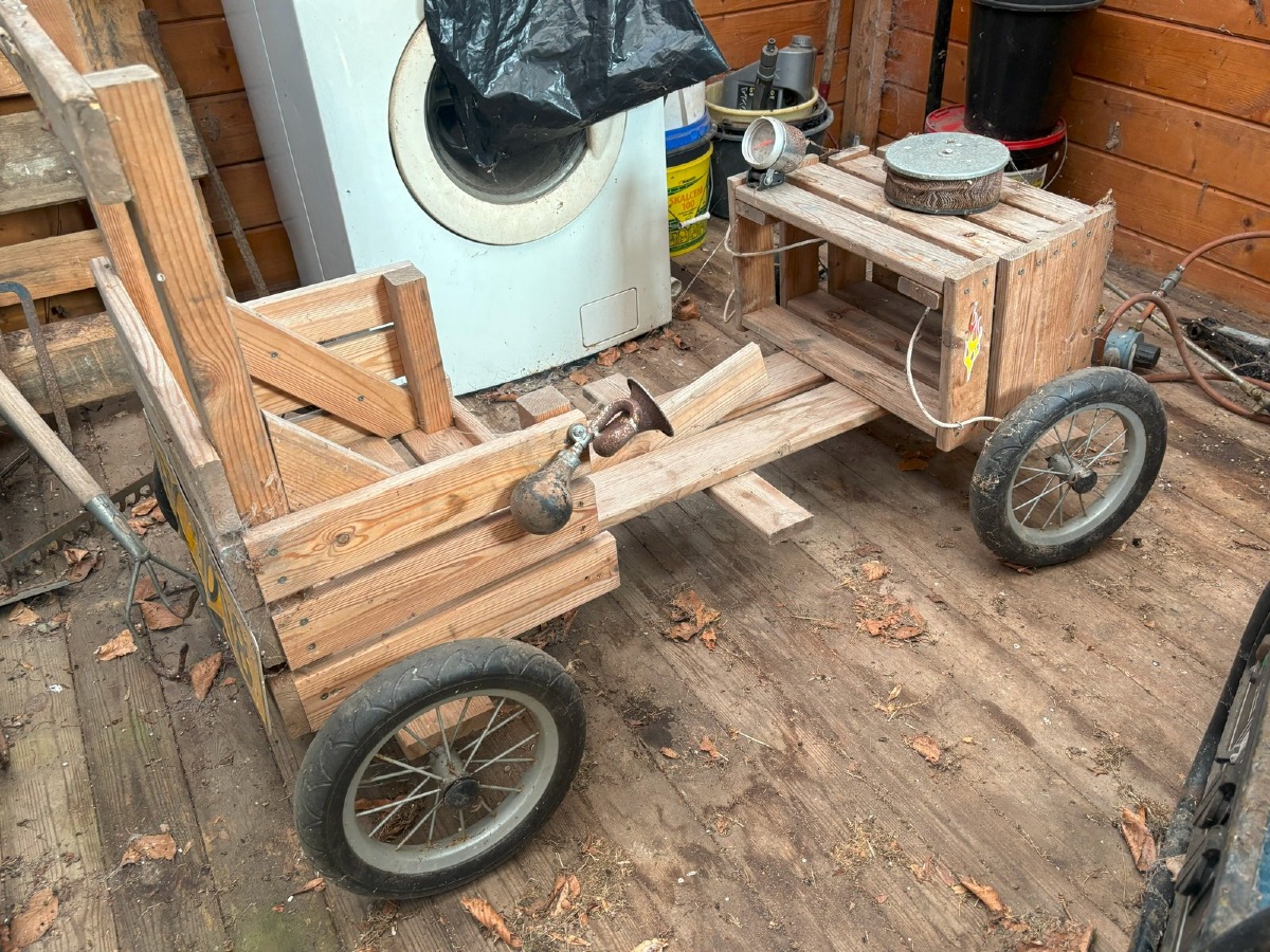 Hjemmelavet sæbekassebil. Fremstår i nogenlunde stand. Fra dødsbo