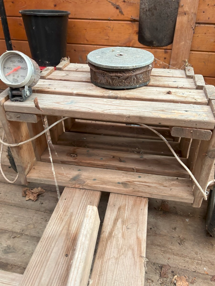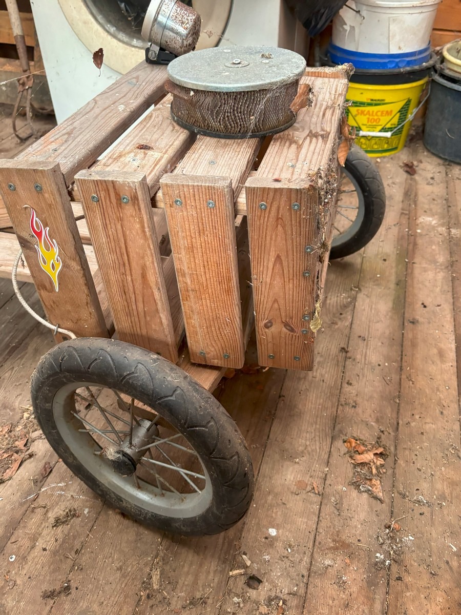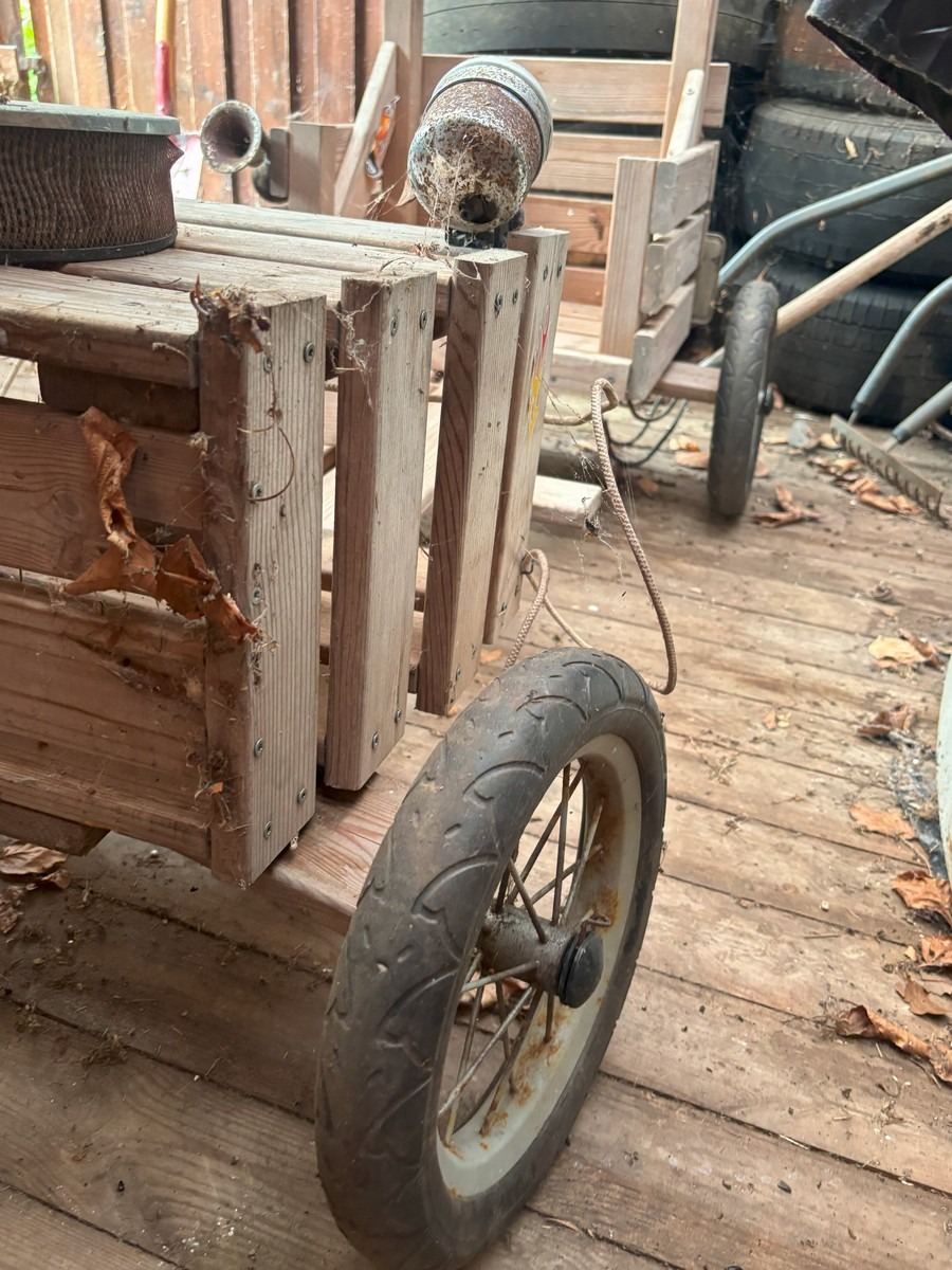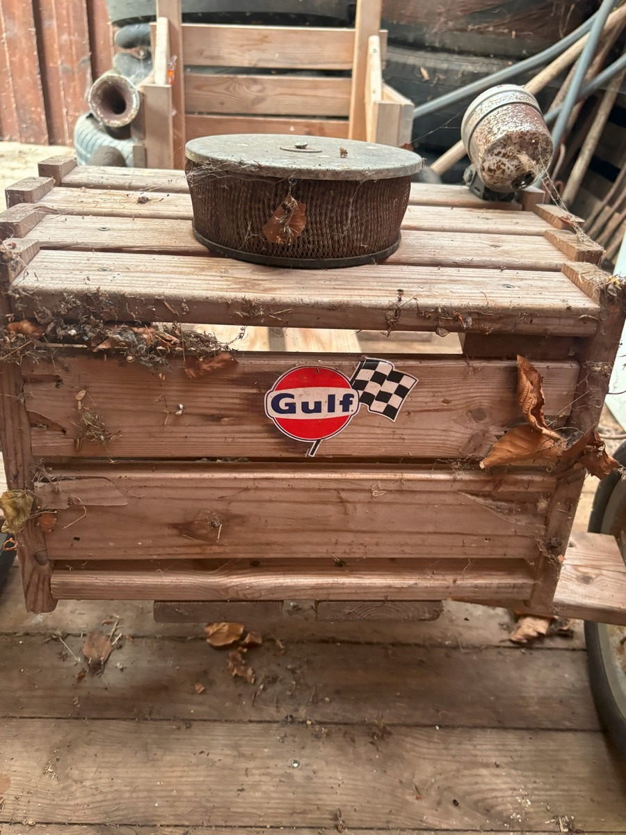 Hjemmelavet sæbekassebil. Fremstår i nogenlunde stand. Fra dødsbo