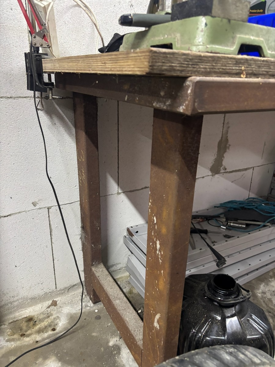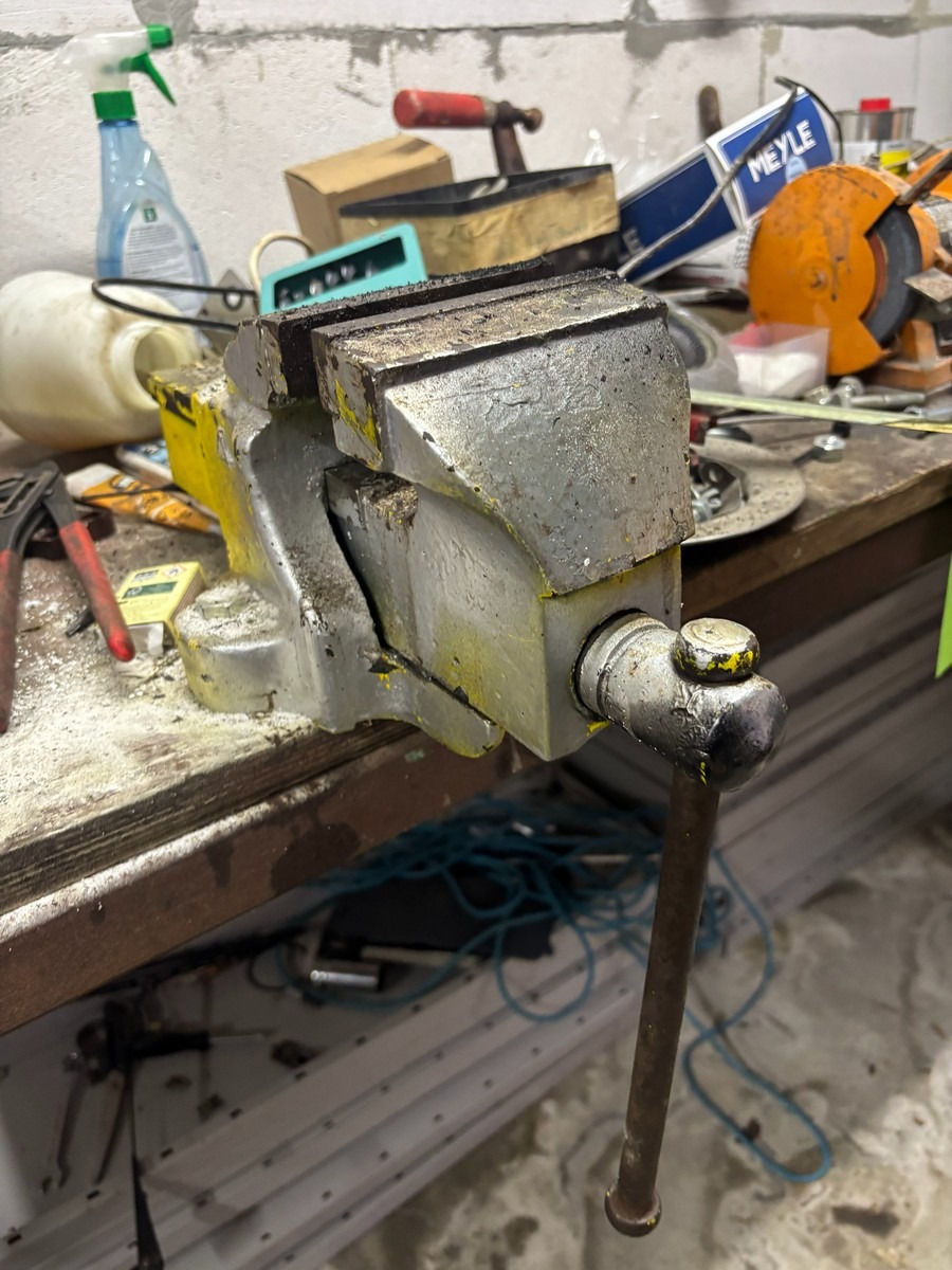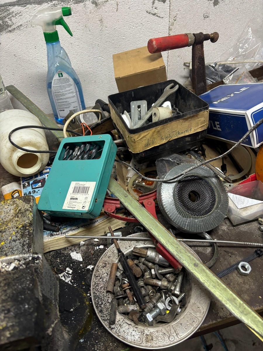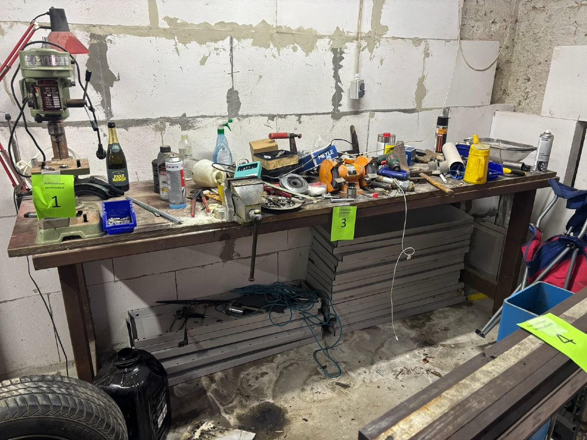 Stort værkstedsbord med skruestik og indhold (Minus pladerne nedeunder bordet og søjleboremaskine). Fra dødsbo
