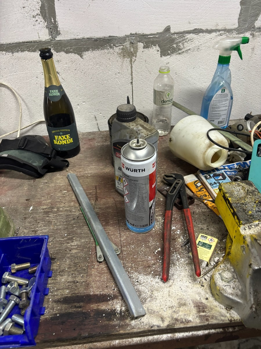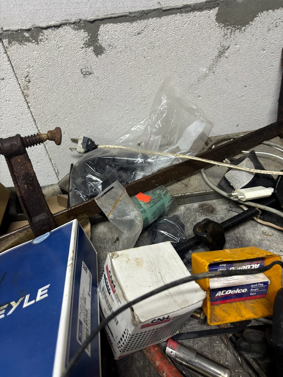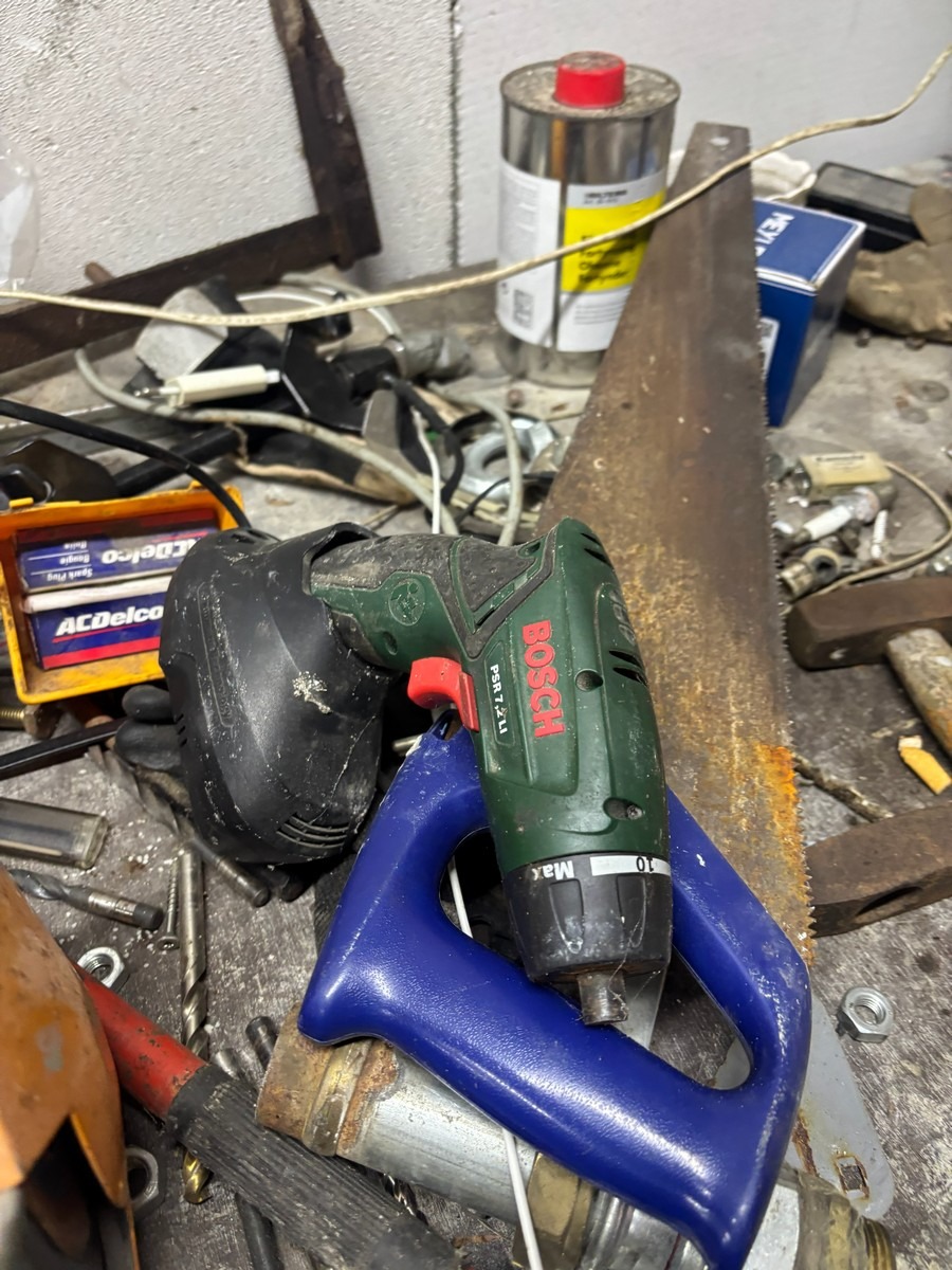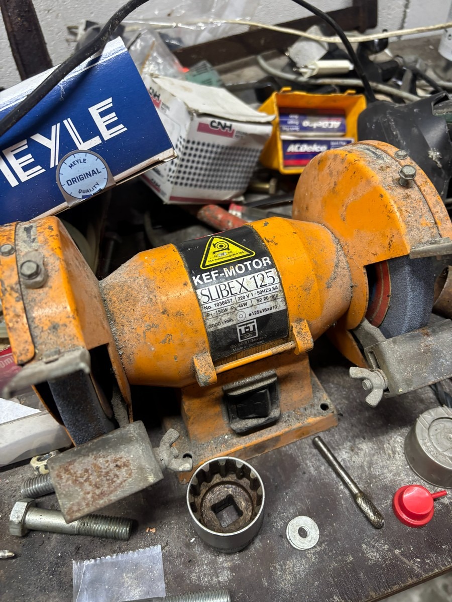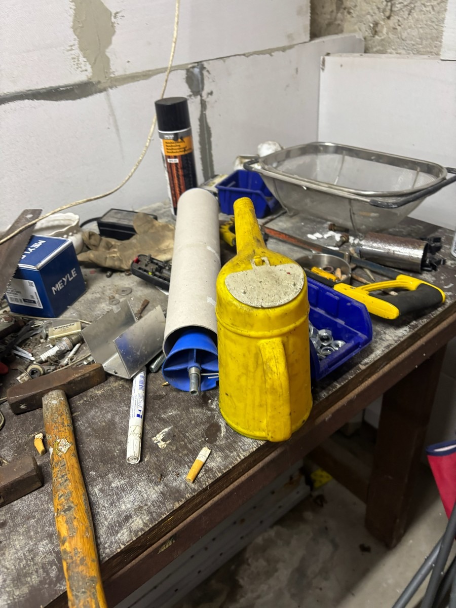 Stort værkstedsbord med skruestik og indhold (Minus pladerne nedeunder bordet og søjleboremaskine). Fra dødsbo