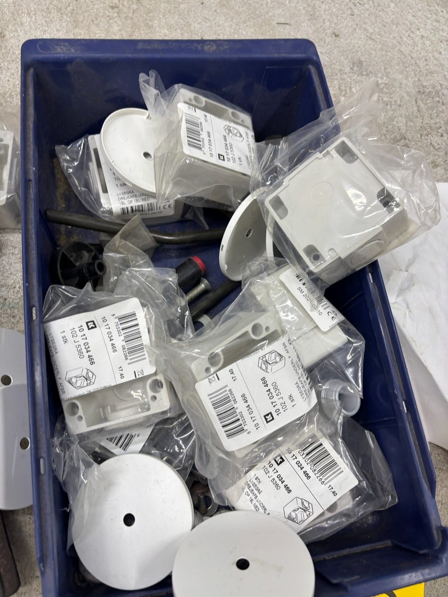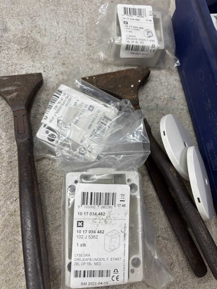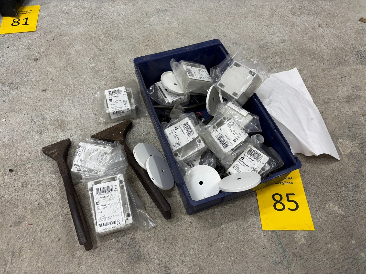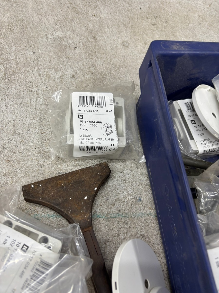 Kasse med byggematerialer - stikdåser, afbryder mm. Ubrugt, fra dødsbo.