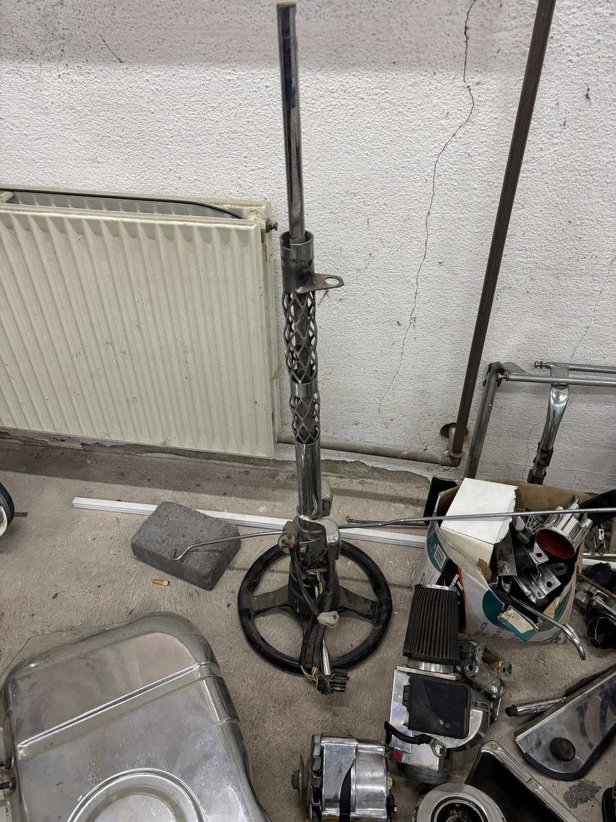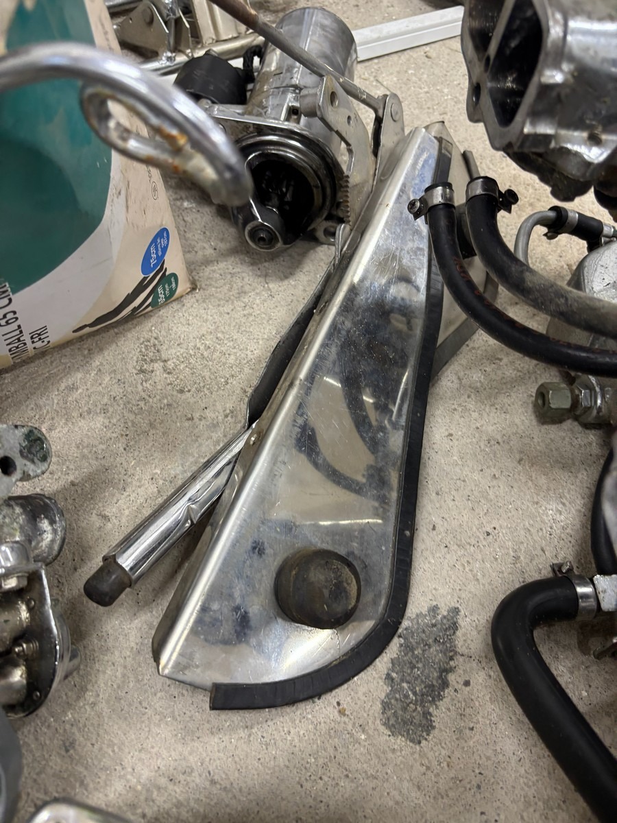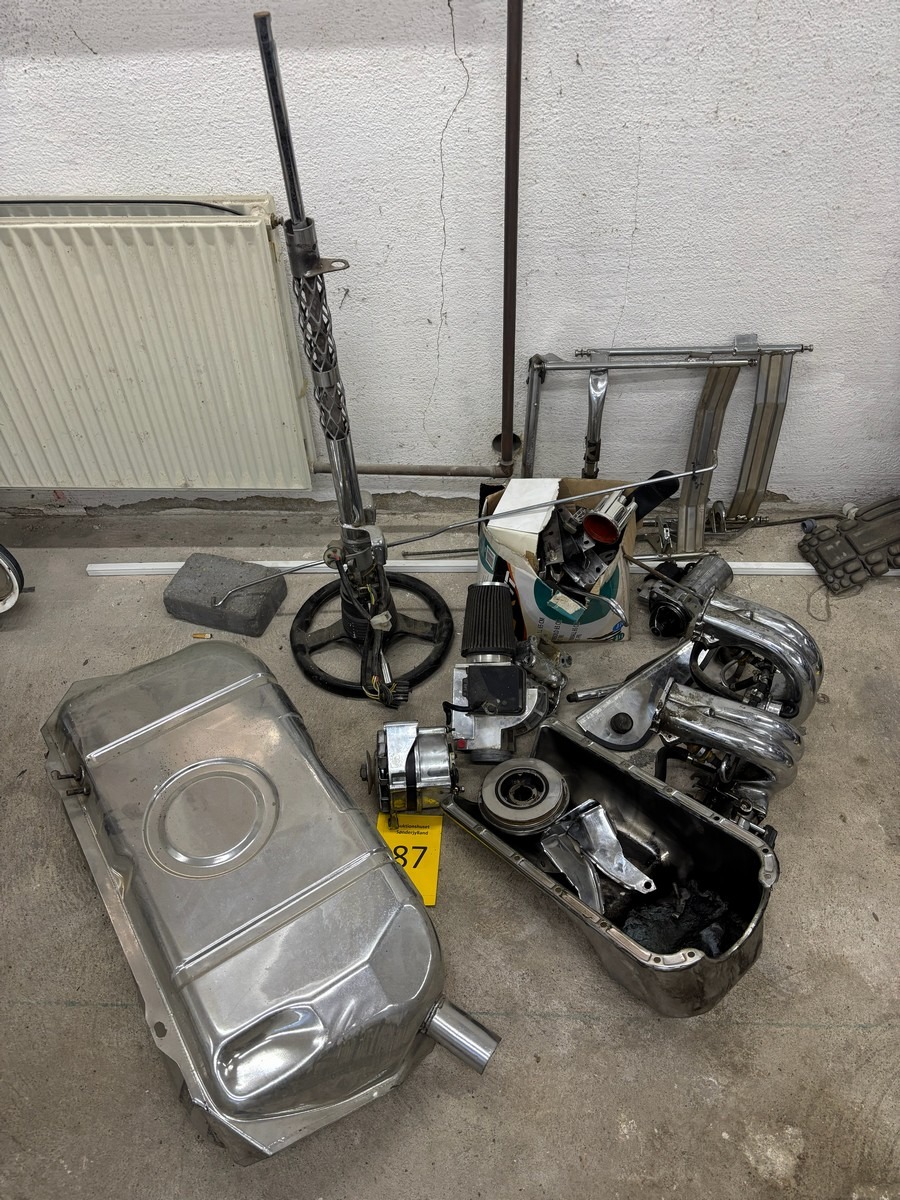 Diverse krom motordele, sædekonsol mm. til Kadett C. Brugt, fra dødsbo.