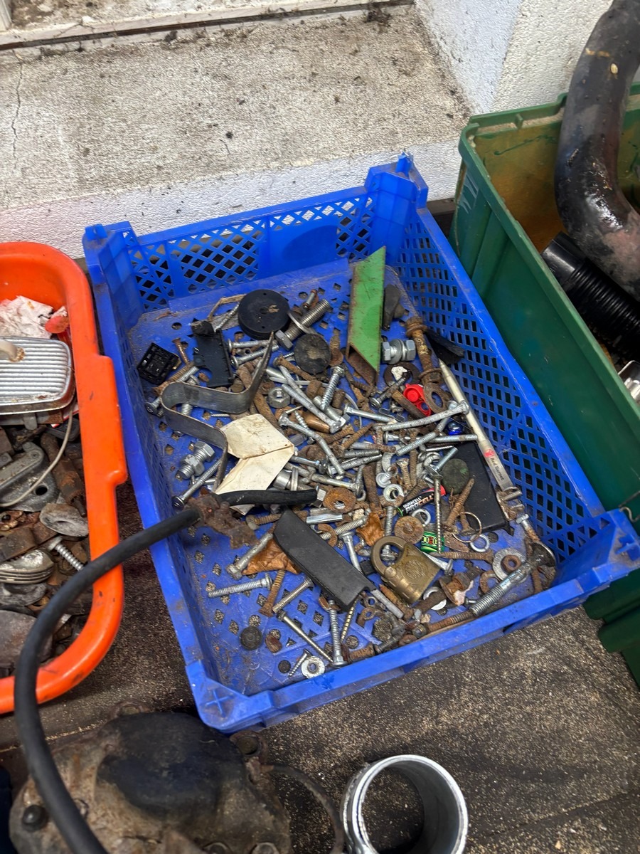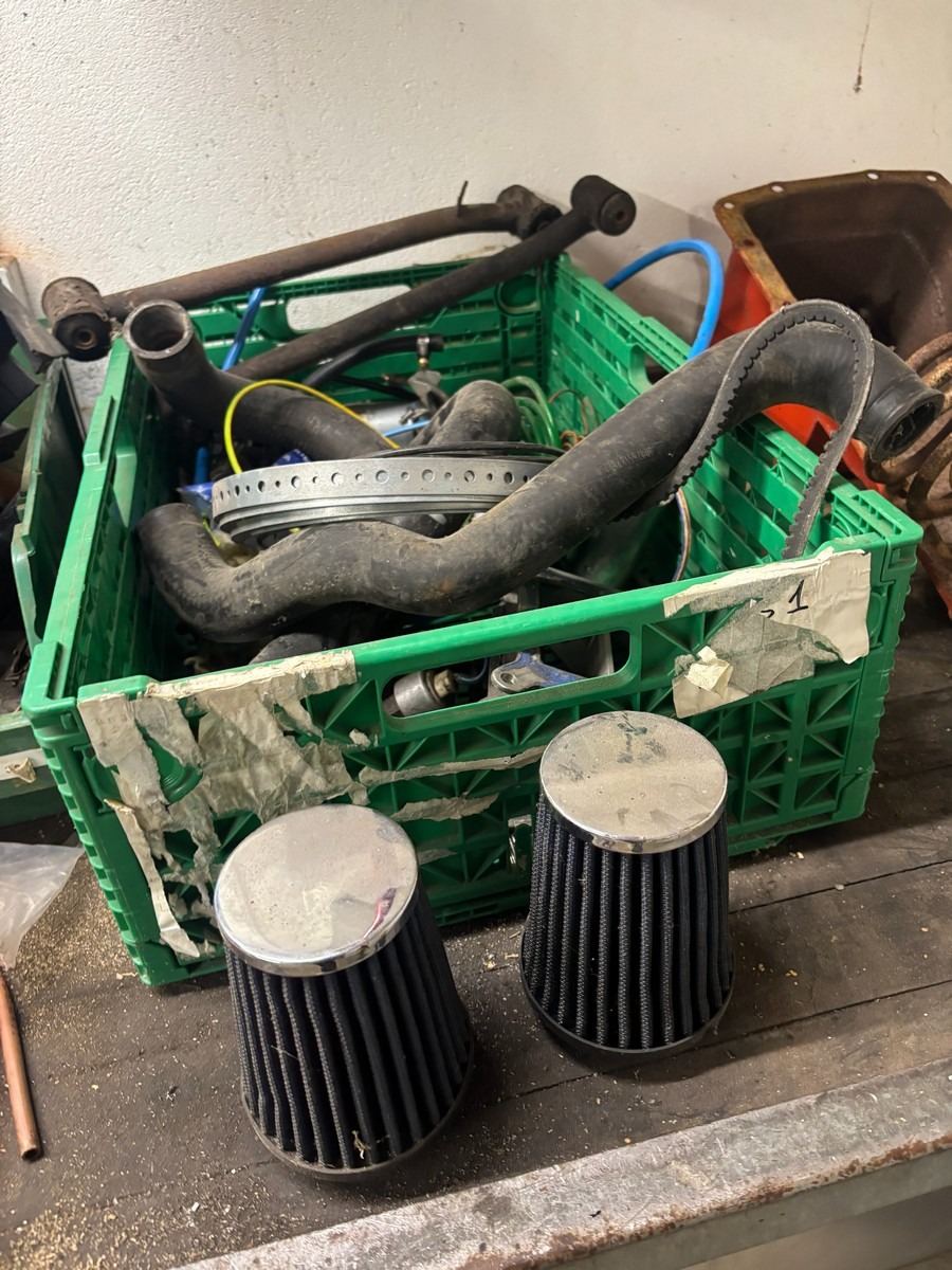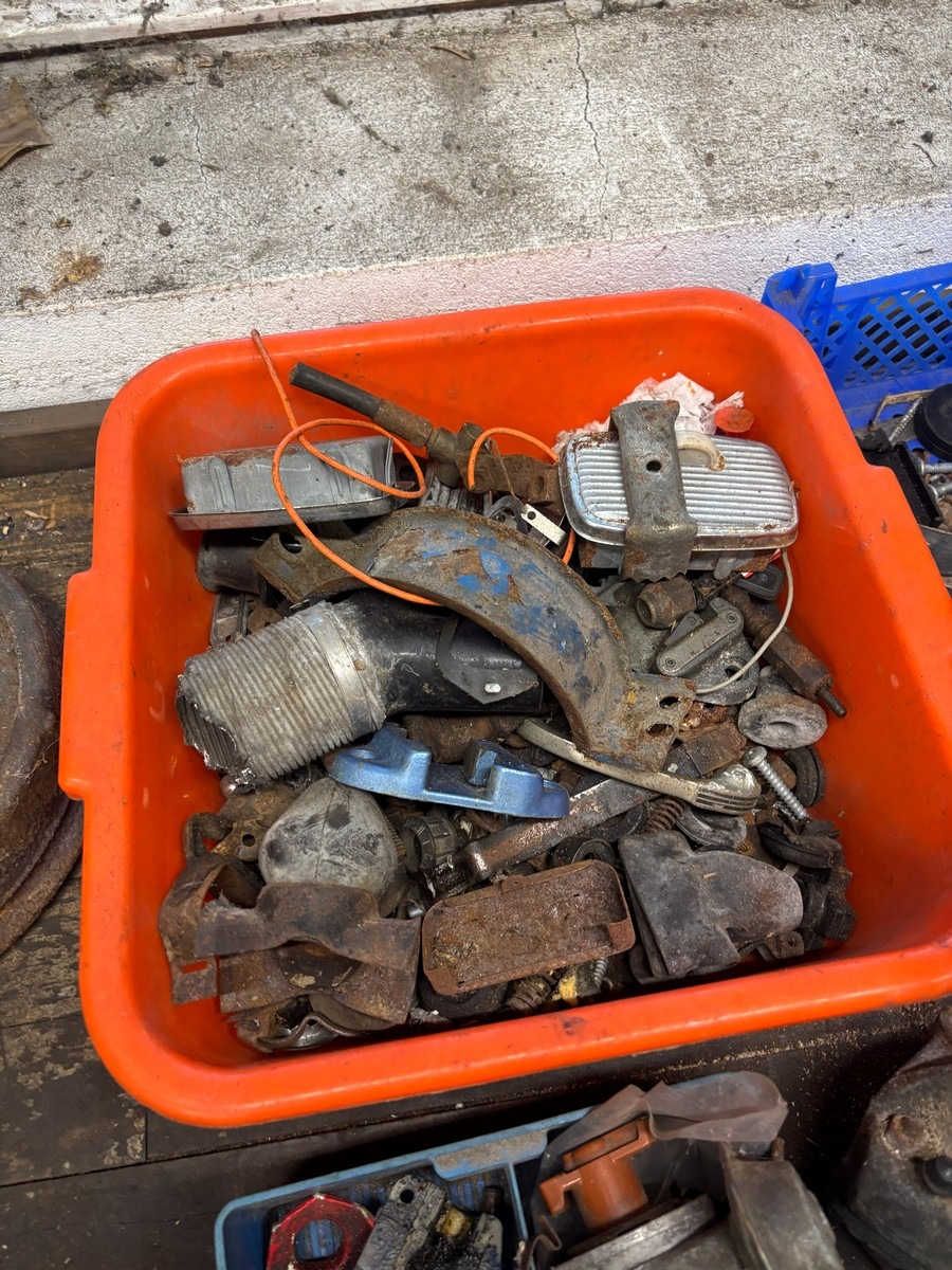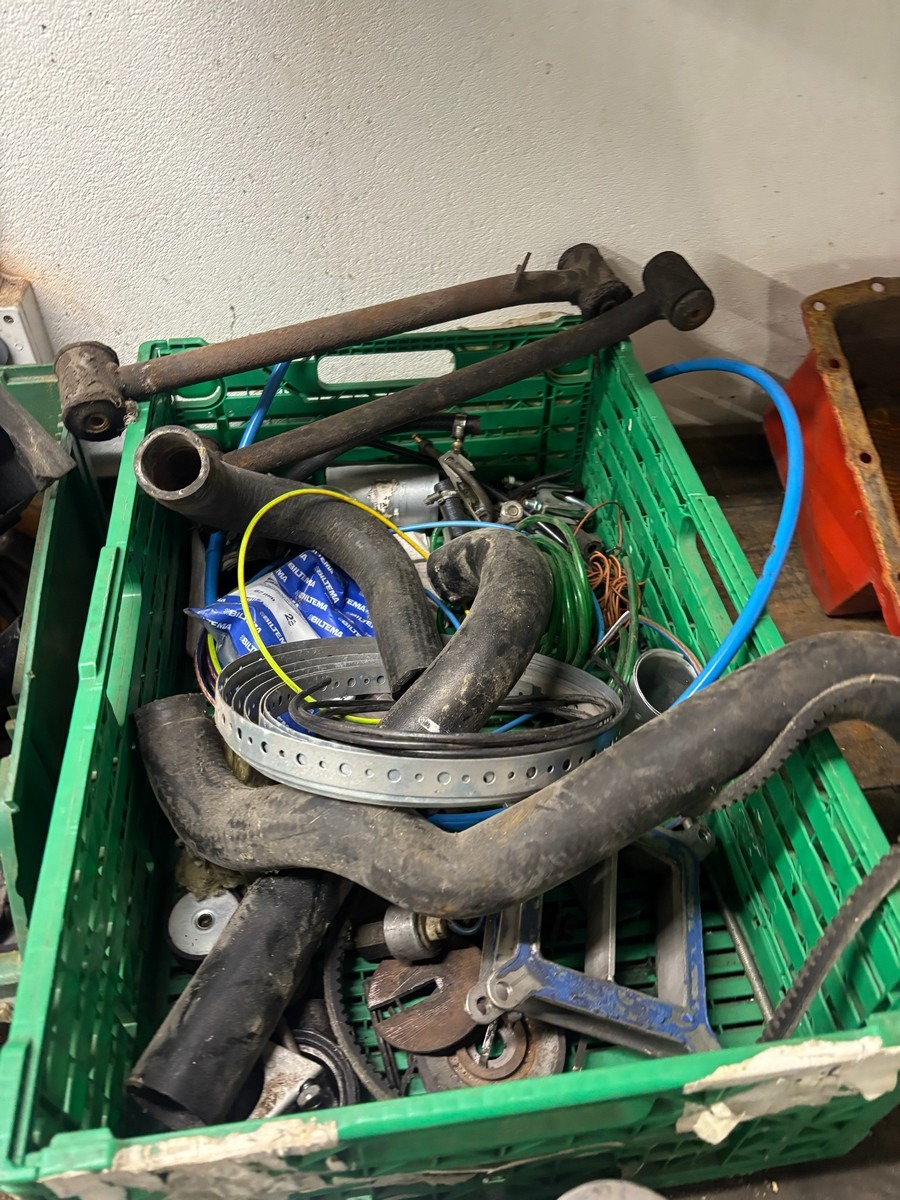 Diverse reservedele, alt på bord (Minus bord og skruestik). Fra dødsbo