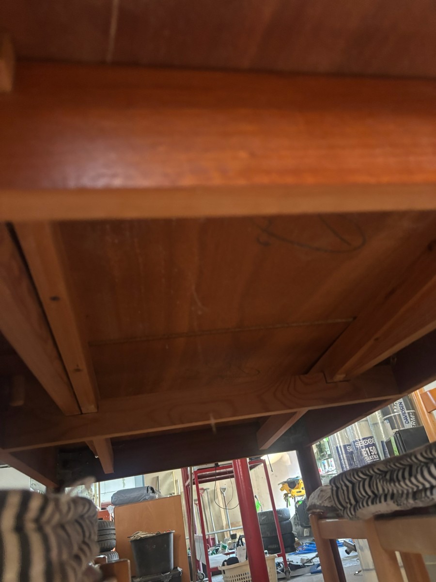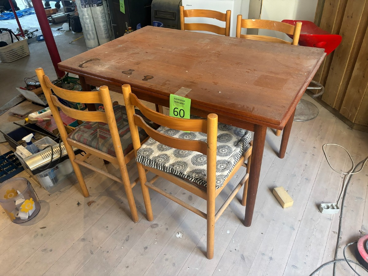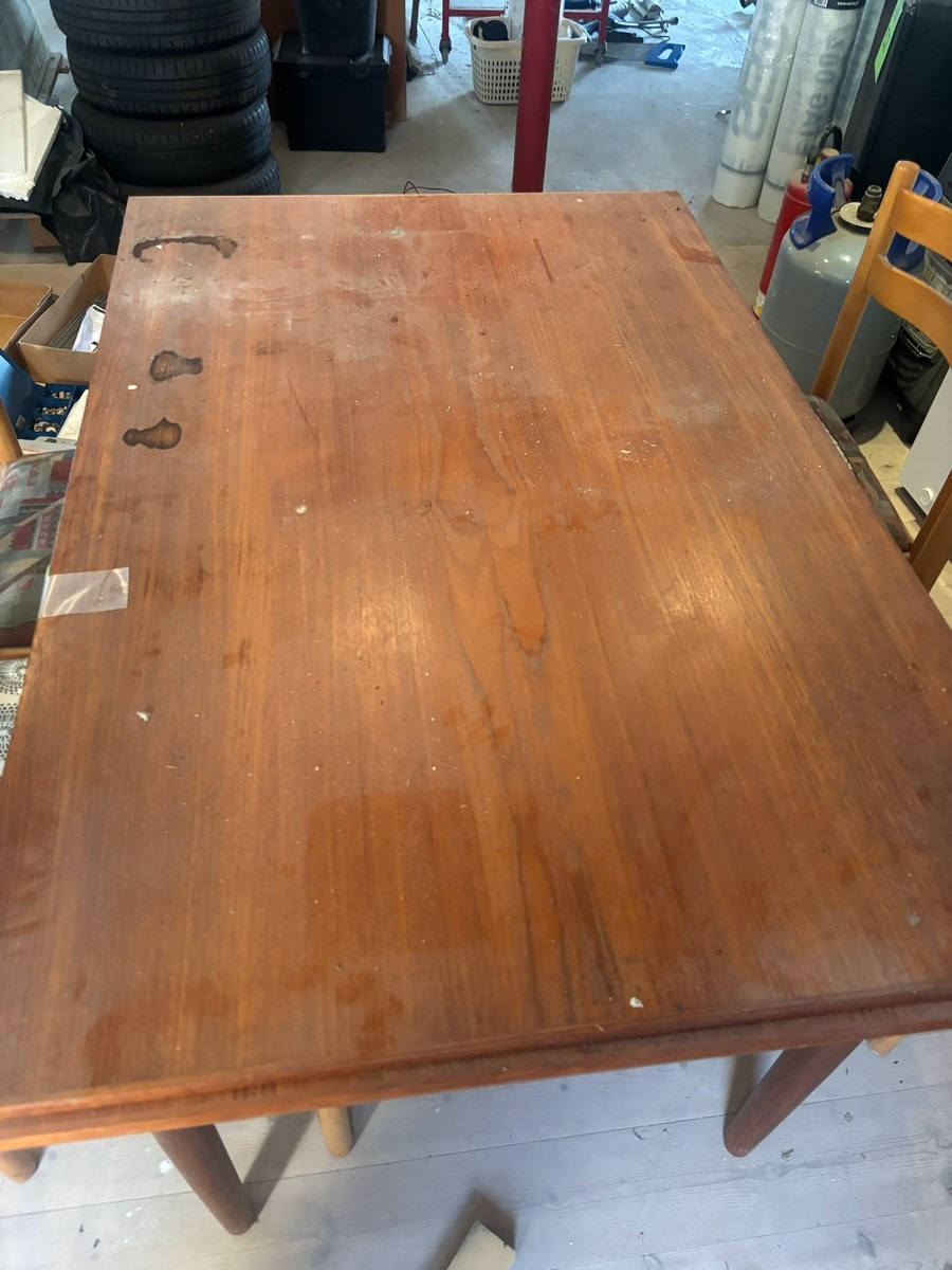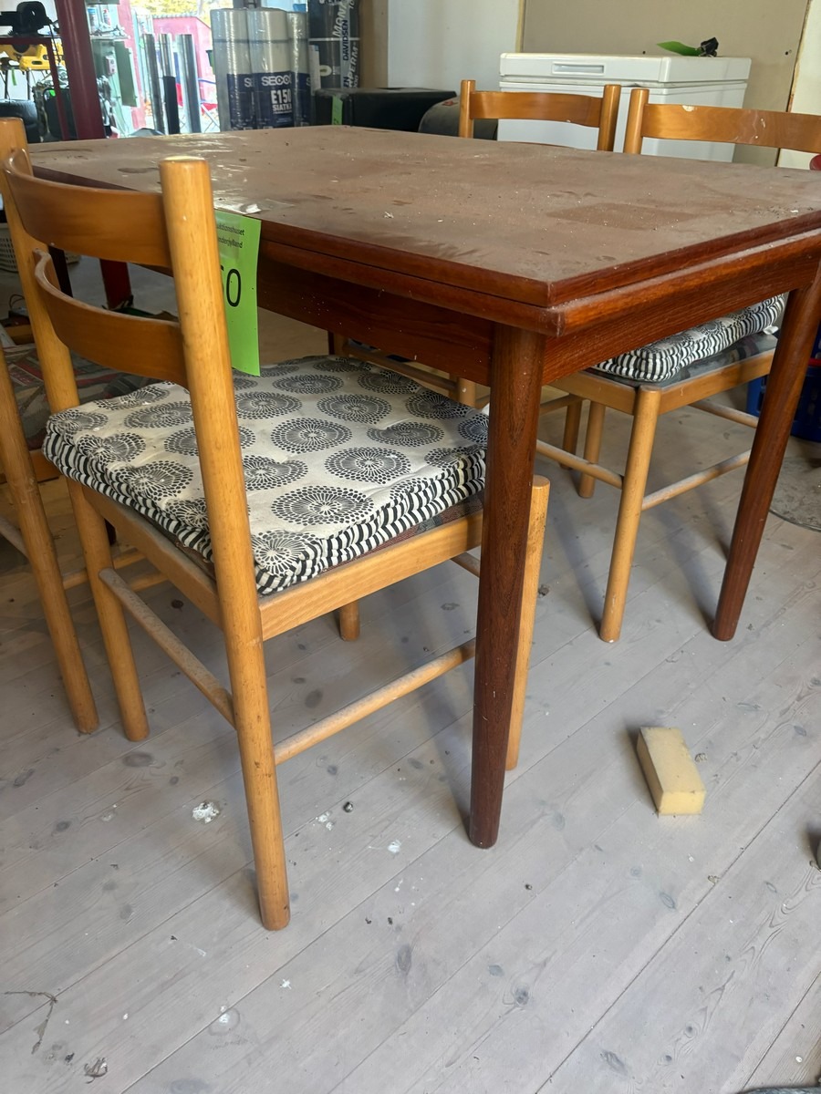 Ældre spisebord i teaktræ m 4 stole. Trænger til en kærlig hånd