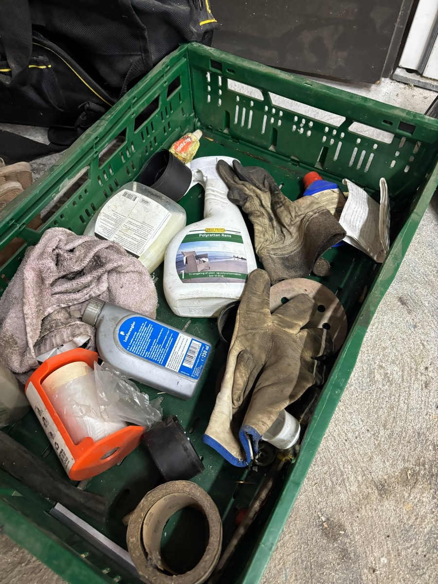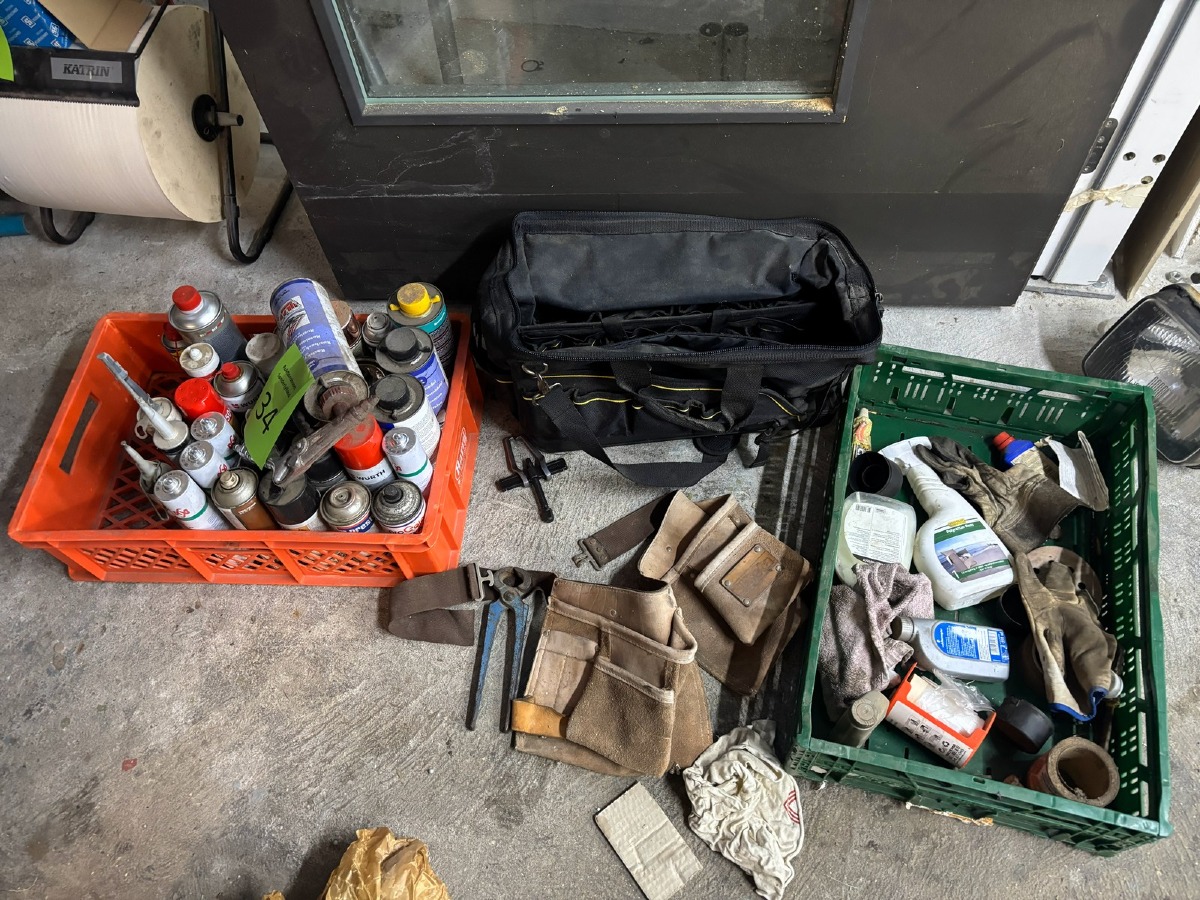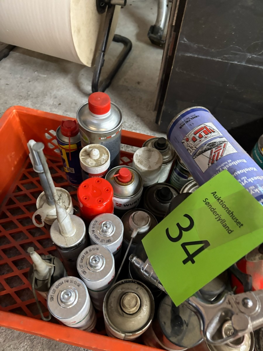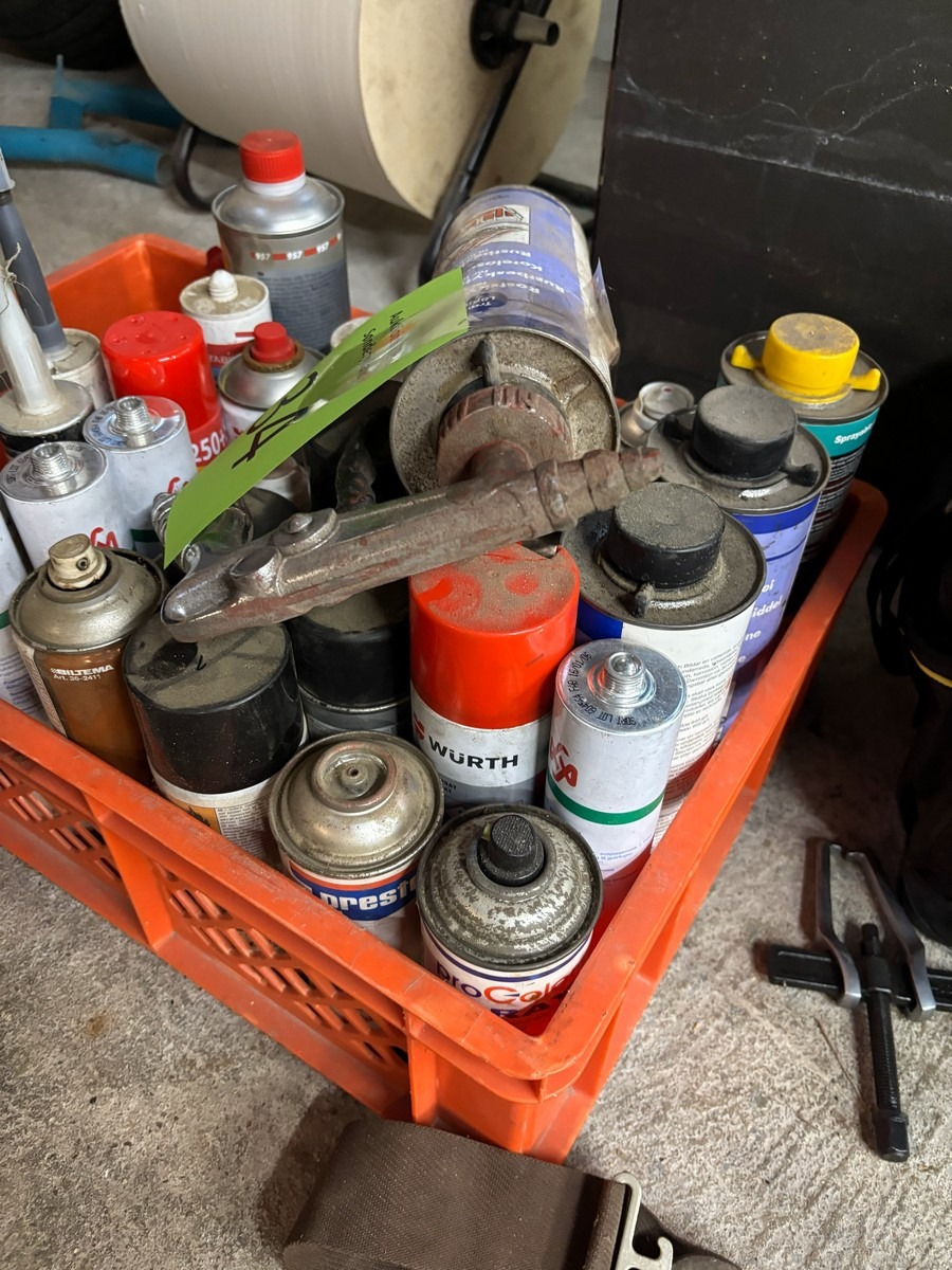 Diverse spraydåser, mm. Mange af dem er halvt tomme. Fra dødsbo