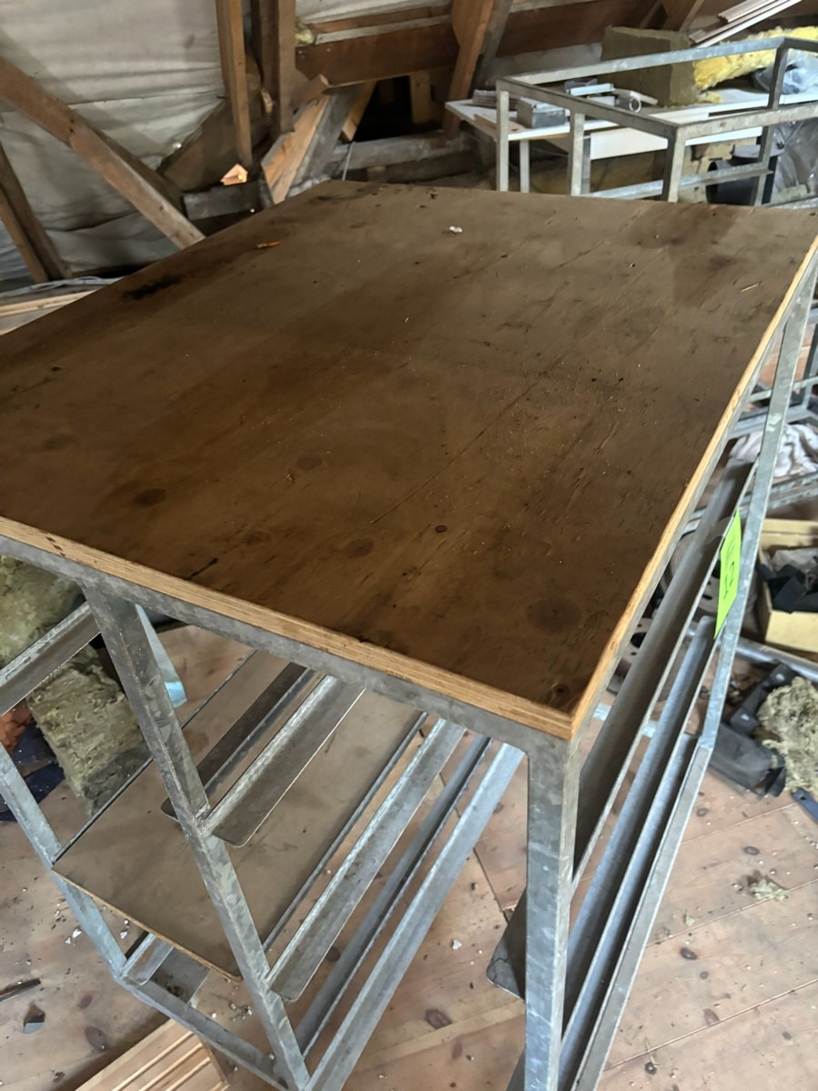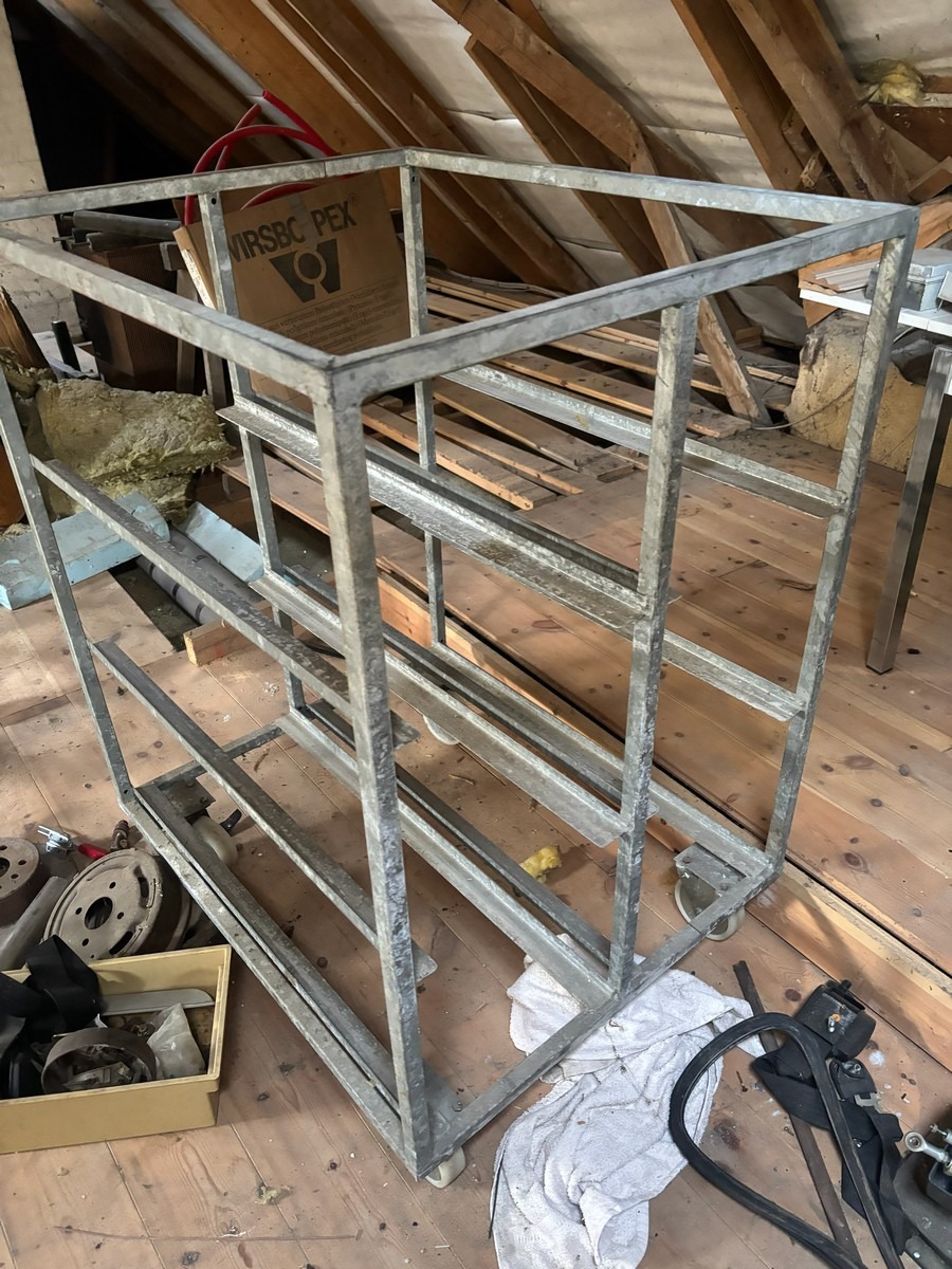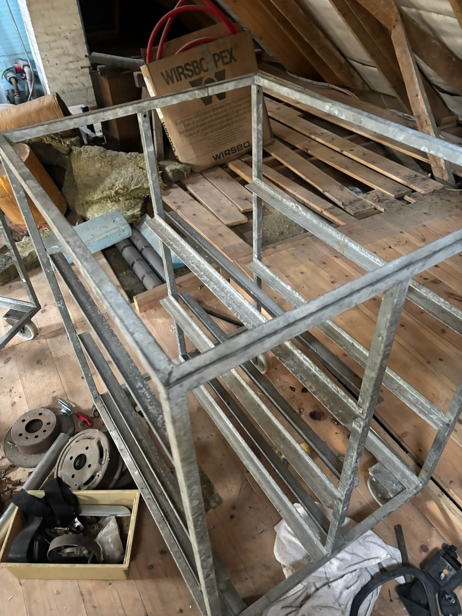 2 stk. rulleborde med 7 stk. tilsvarende kasser der passer til. Måler: 78 x 92 x 120cm.  Bemærk: Står oppe på loftet og skal bæres ned af en snæver trappe. Oprdyning fra dødsbo