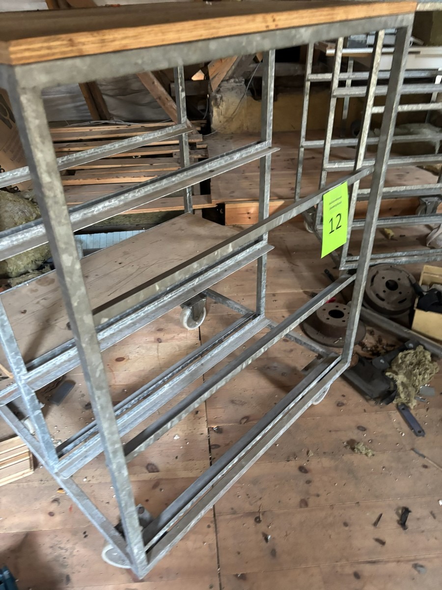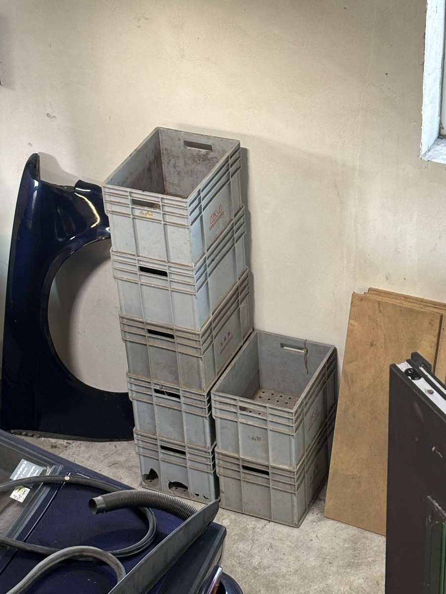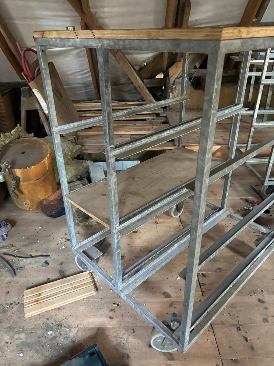 2 stk. rulleborde med 7 stk. tilsvarende kasser der passer til. Måler: 78 x 92 x 120cm.  Bemærk: Står oppe på loftet og skal bæres ned af en snæver trappe. Oprdyning fra dødsbo