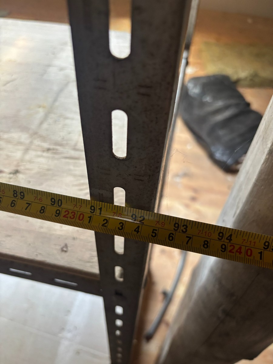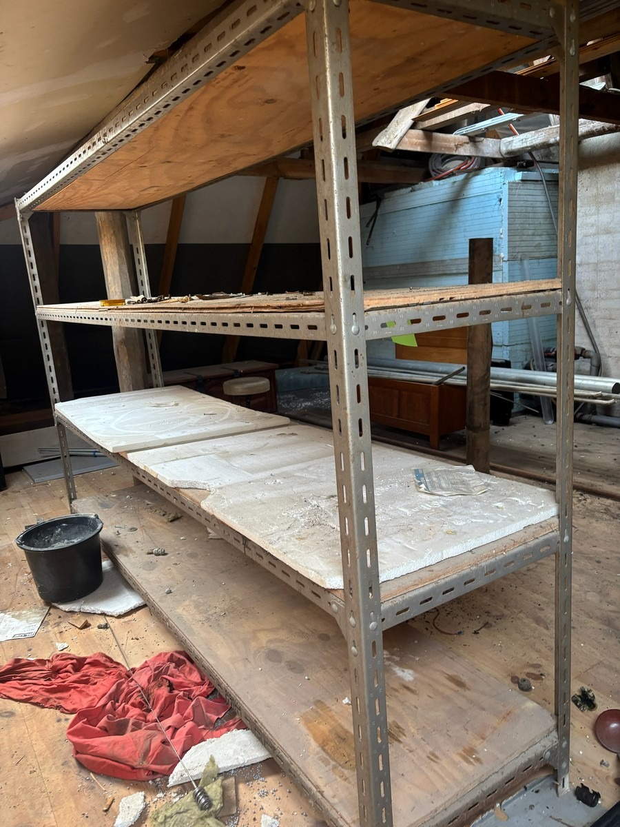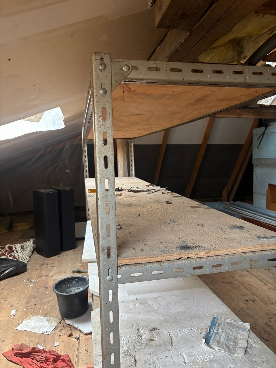 2 stk. værkstedsreoler (Forskellige str. og modeller). Bemærk: Står oppe på loftet og skal bæres ned af en snæver trappe. Oprdyning fra dødsbo