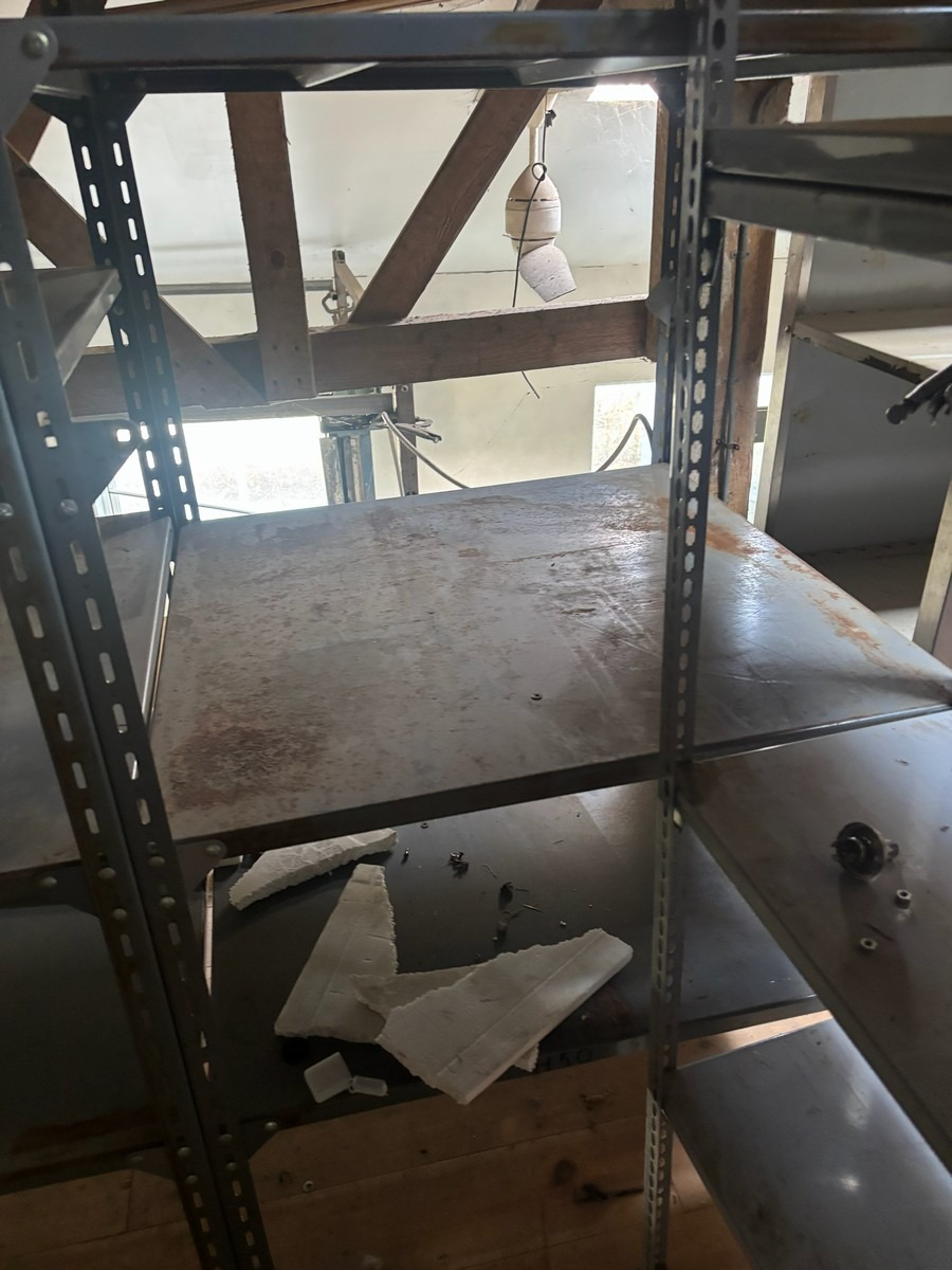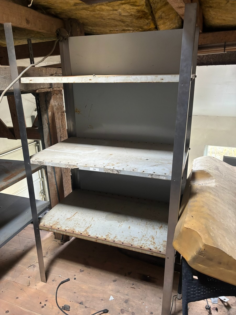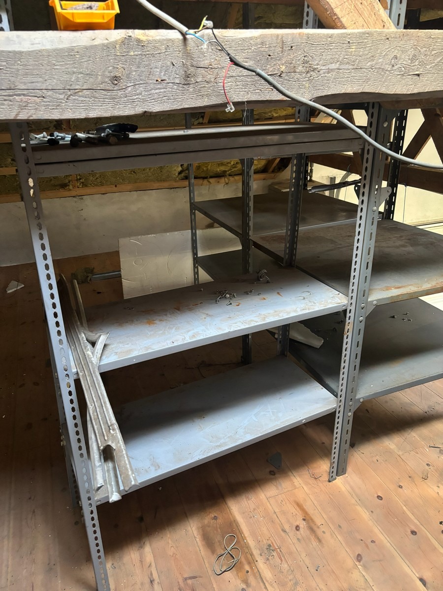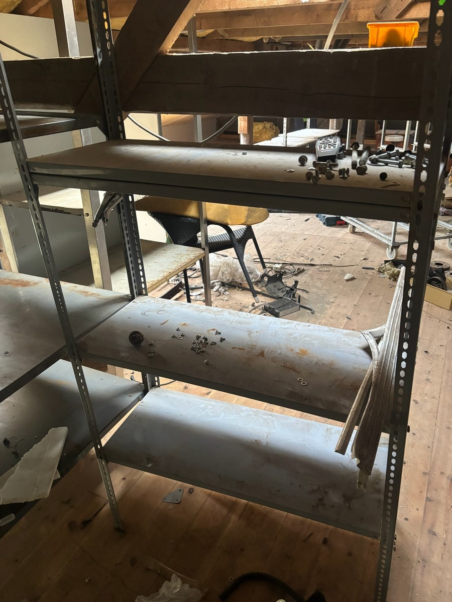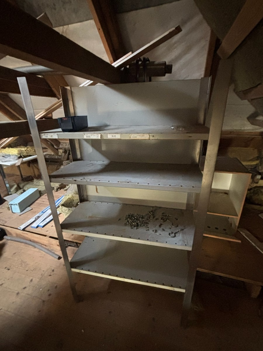 Diverse værksteds reoler (Forskellige str. og modeller) Bemærk: Står oppe på loftet og skal bæres ned af en snæver trappe. Oprdyning fra dødsbo