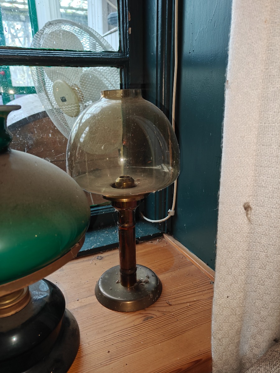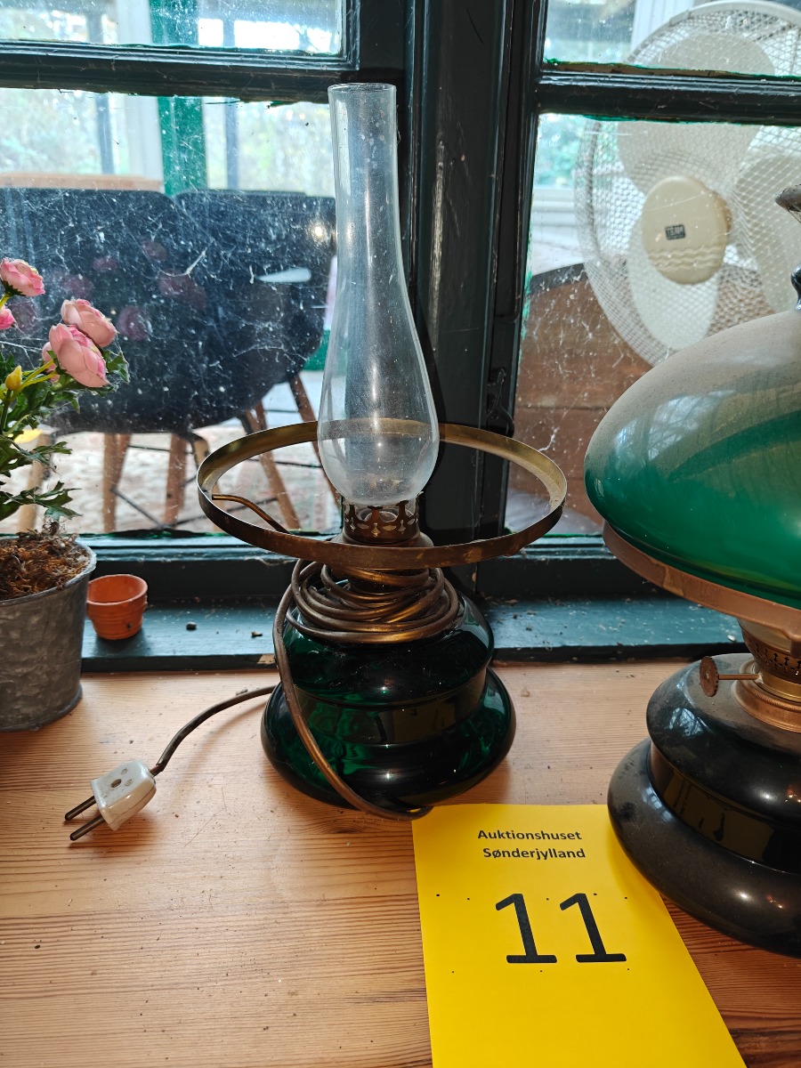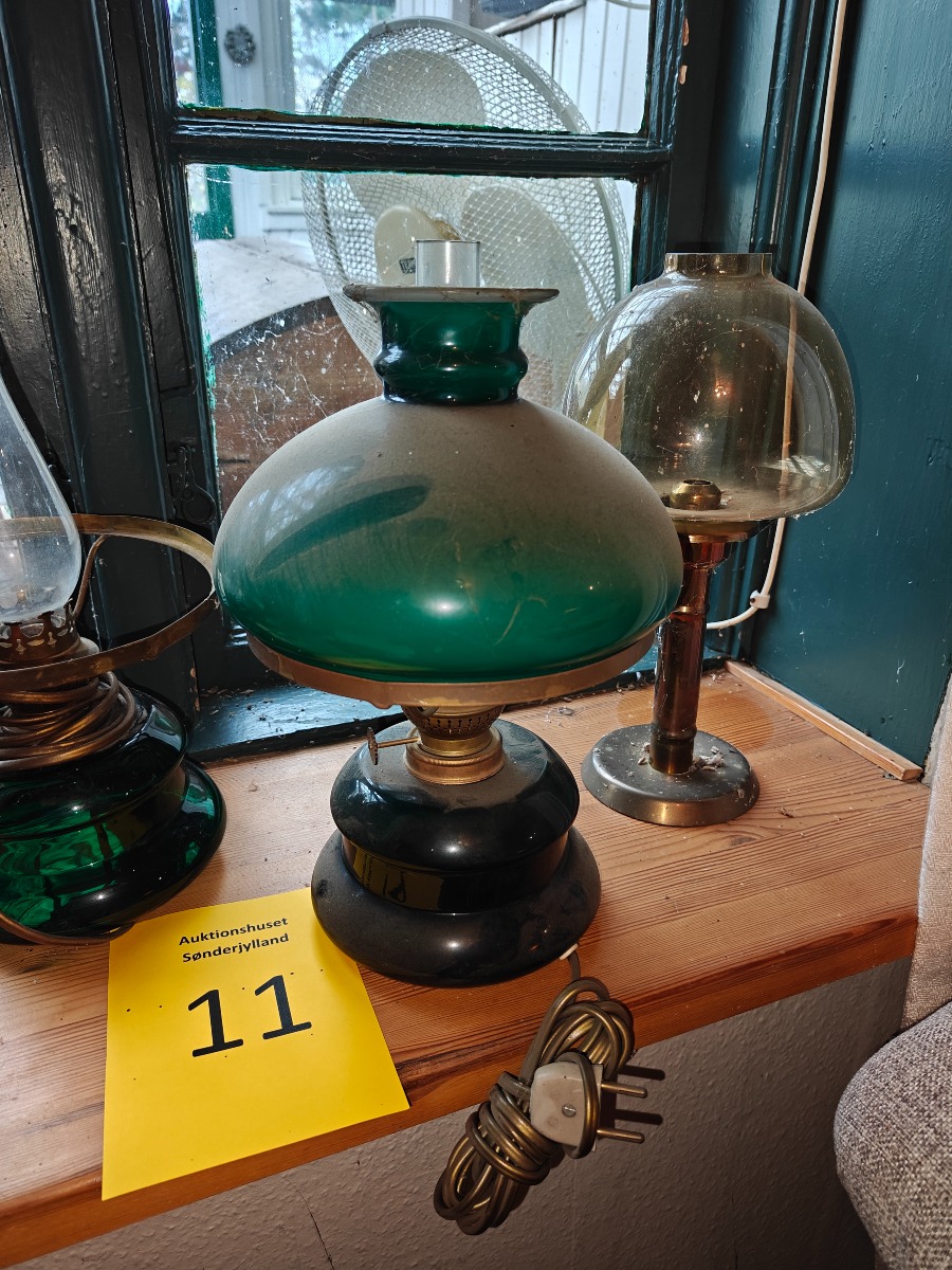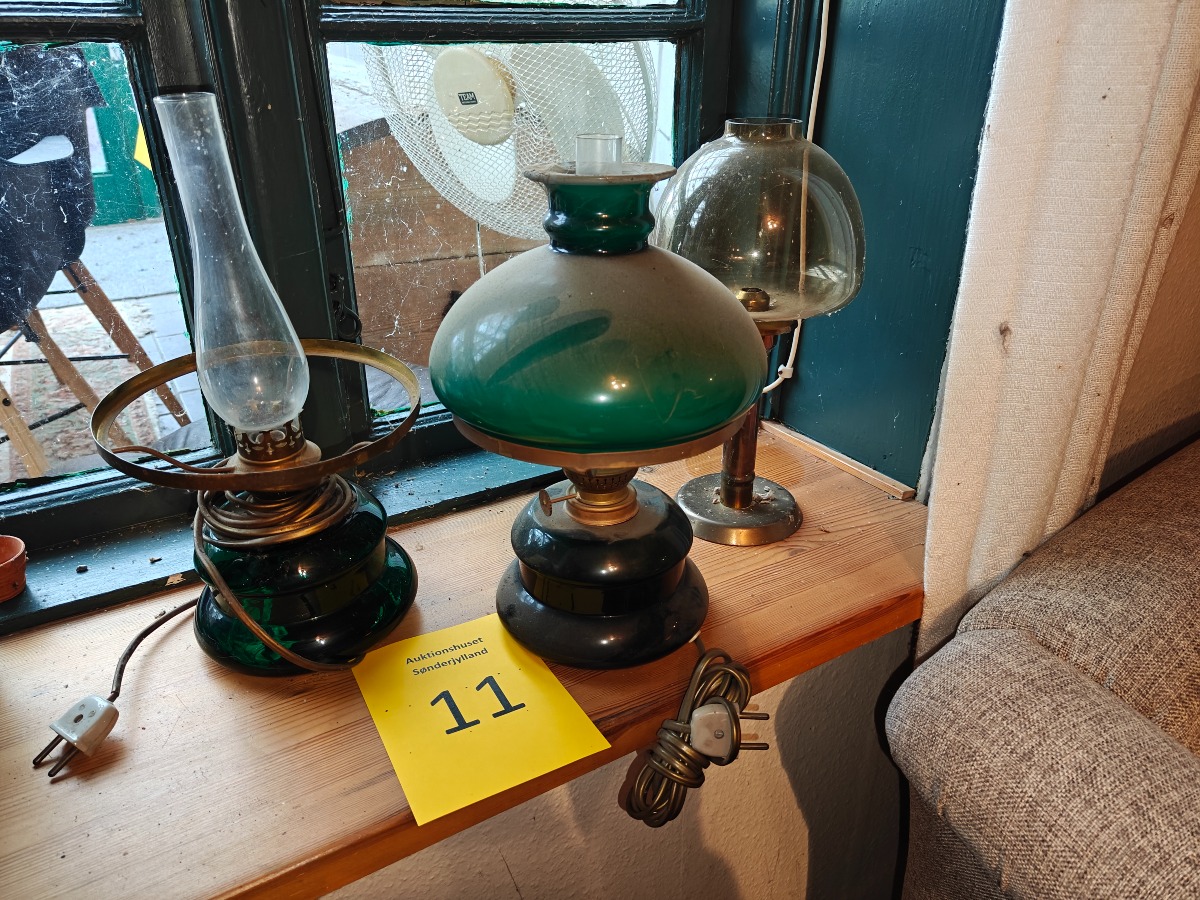 3 petroleumslamper Ene mangler overskærm. 2 er omlavet til el.
