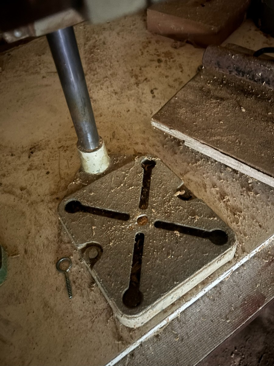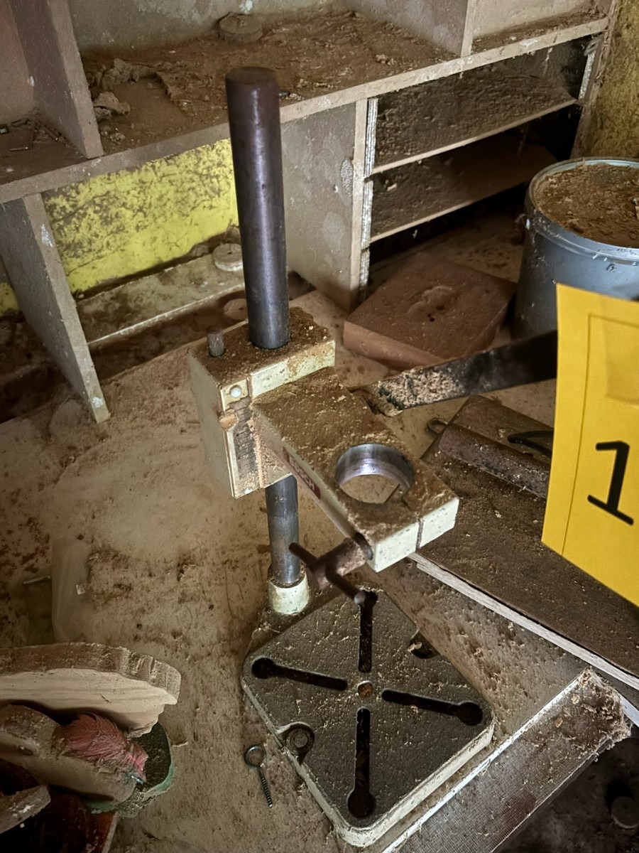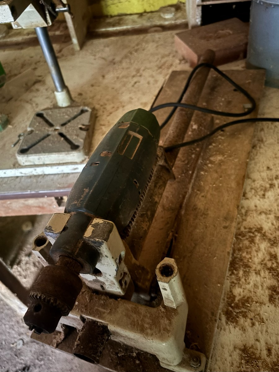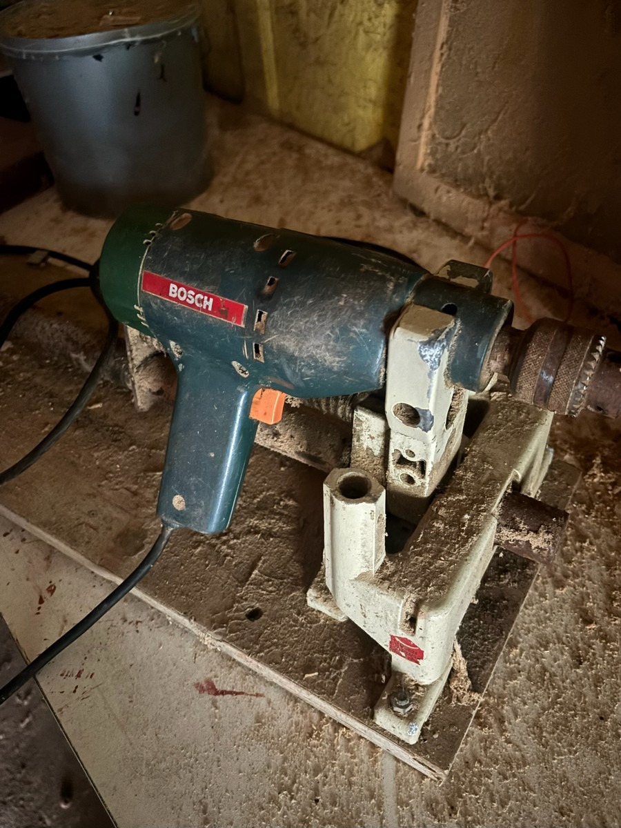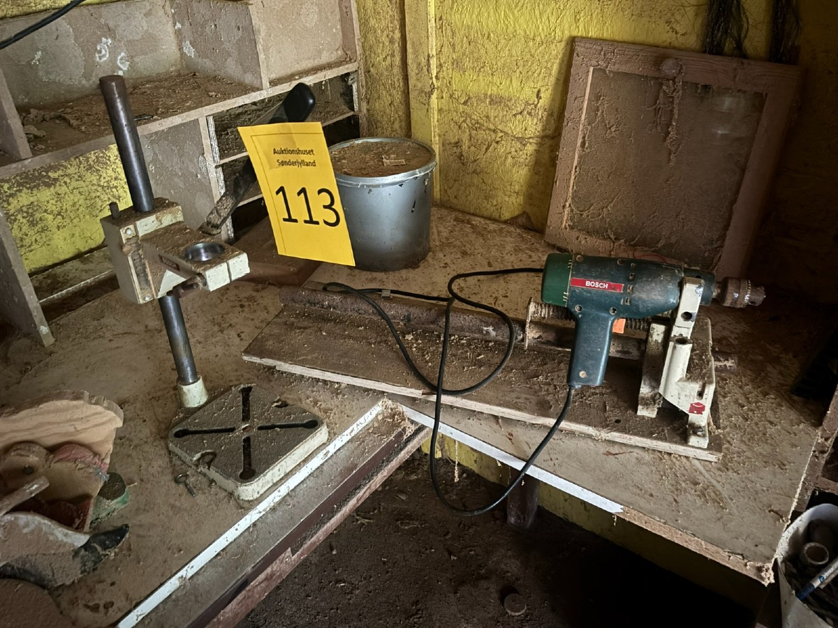 Ældre Bosch boremaskine med borestander og horisontal stand.