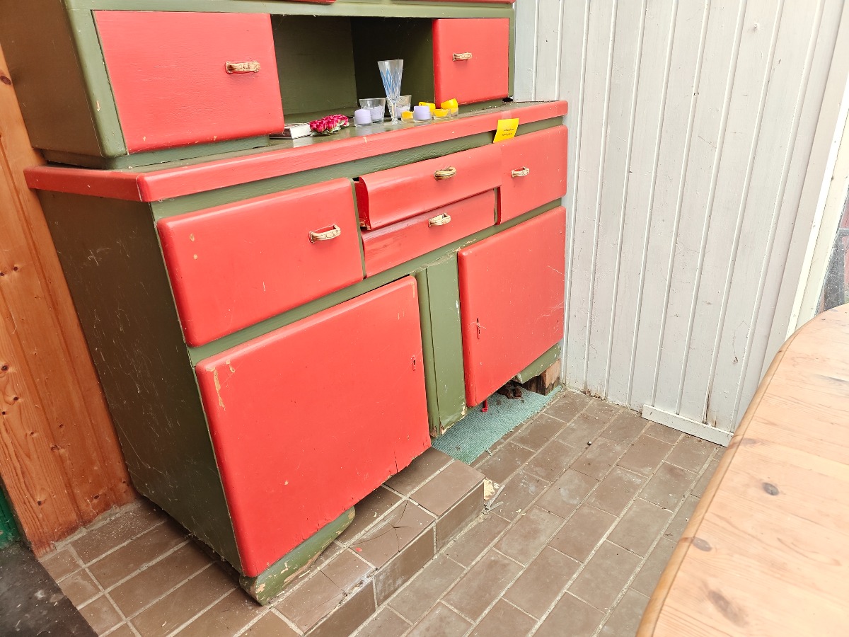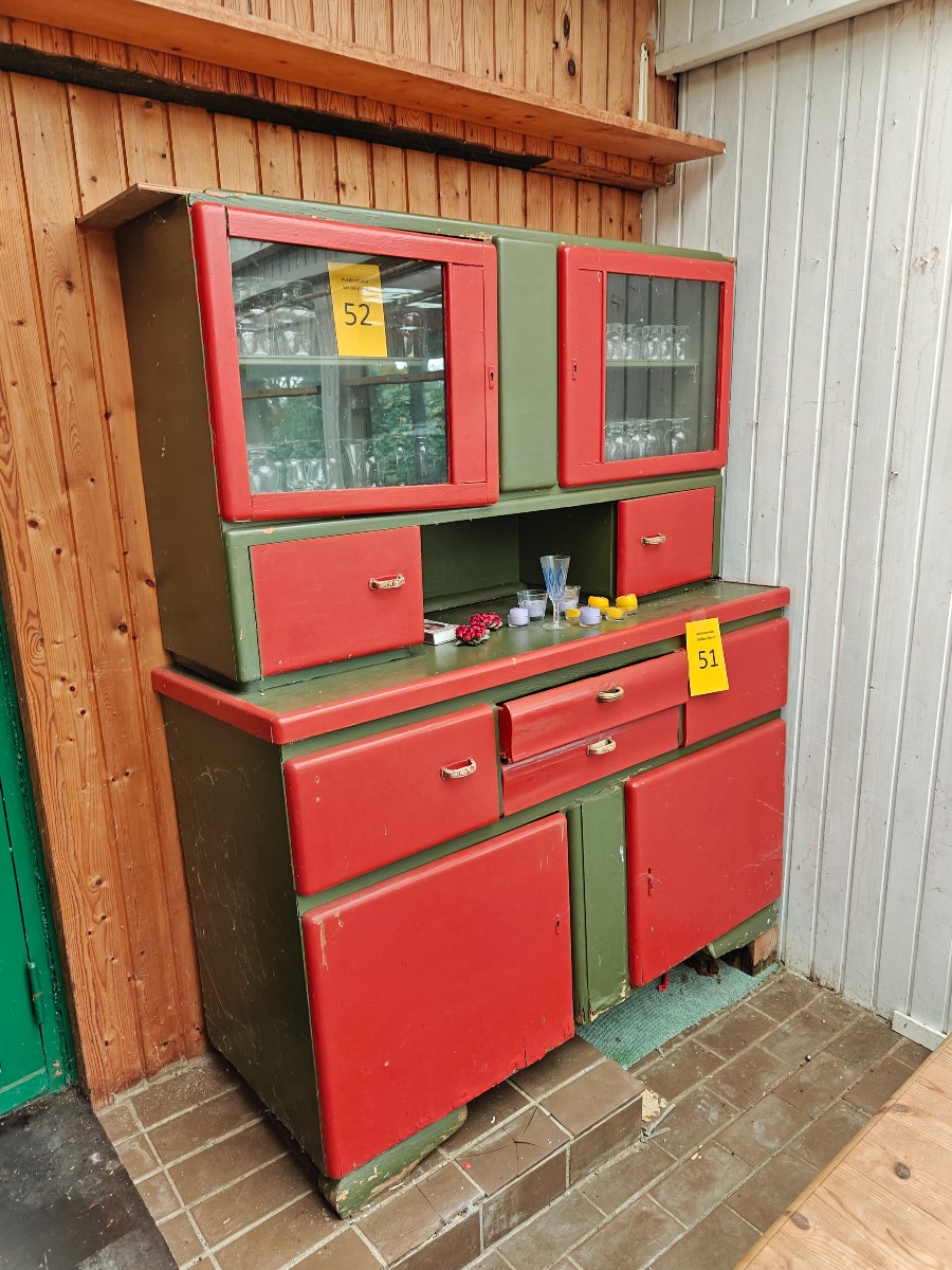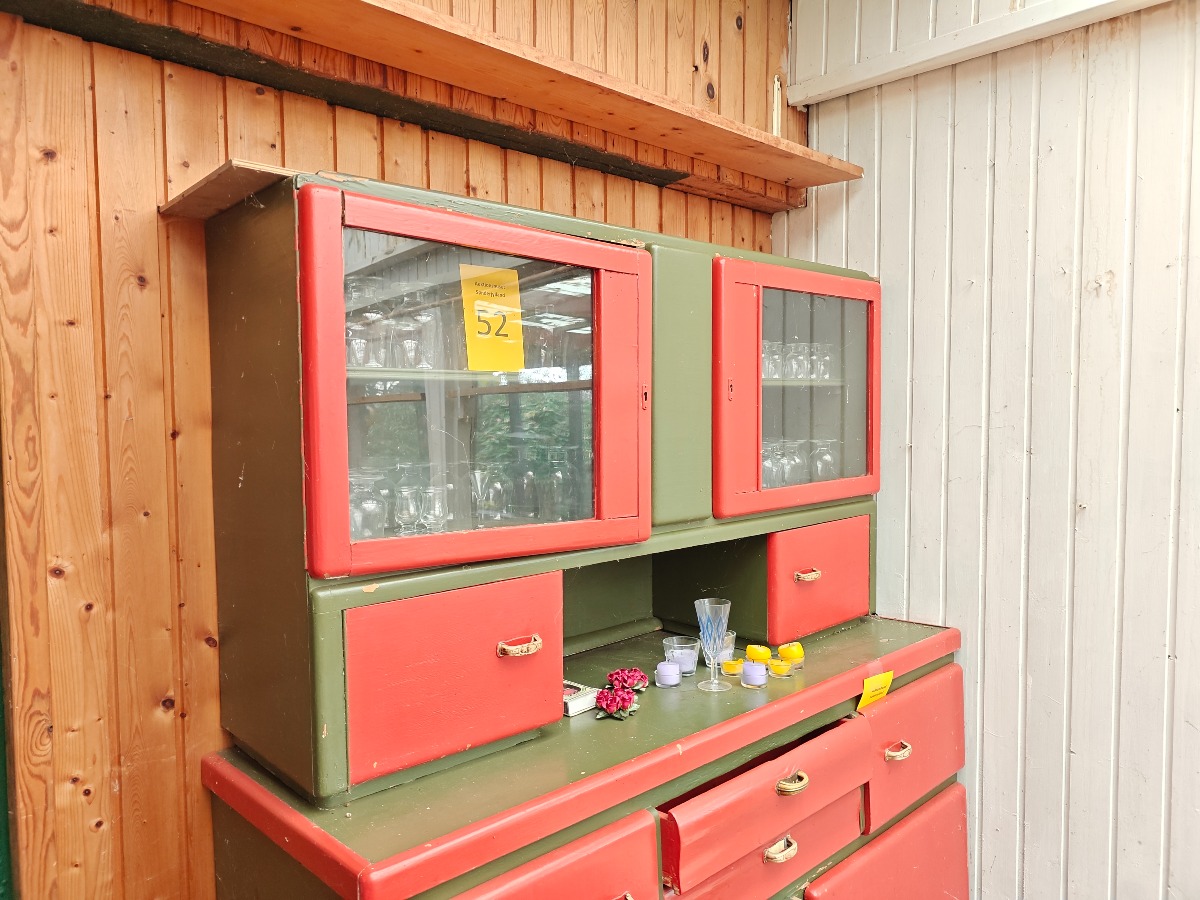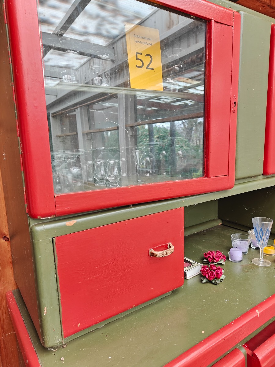 Ældre køkkenskab med mange låger enkelte glasskuffer. Senere bemalet. Maling skaller. H. 170, b. 140, D. 52 cm.