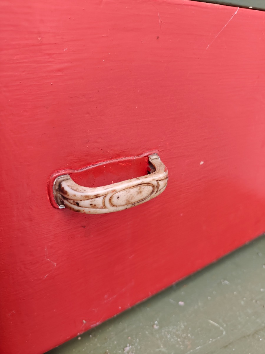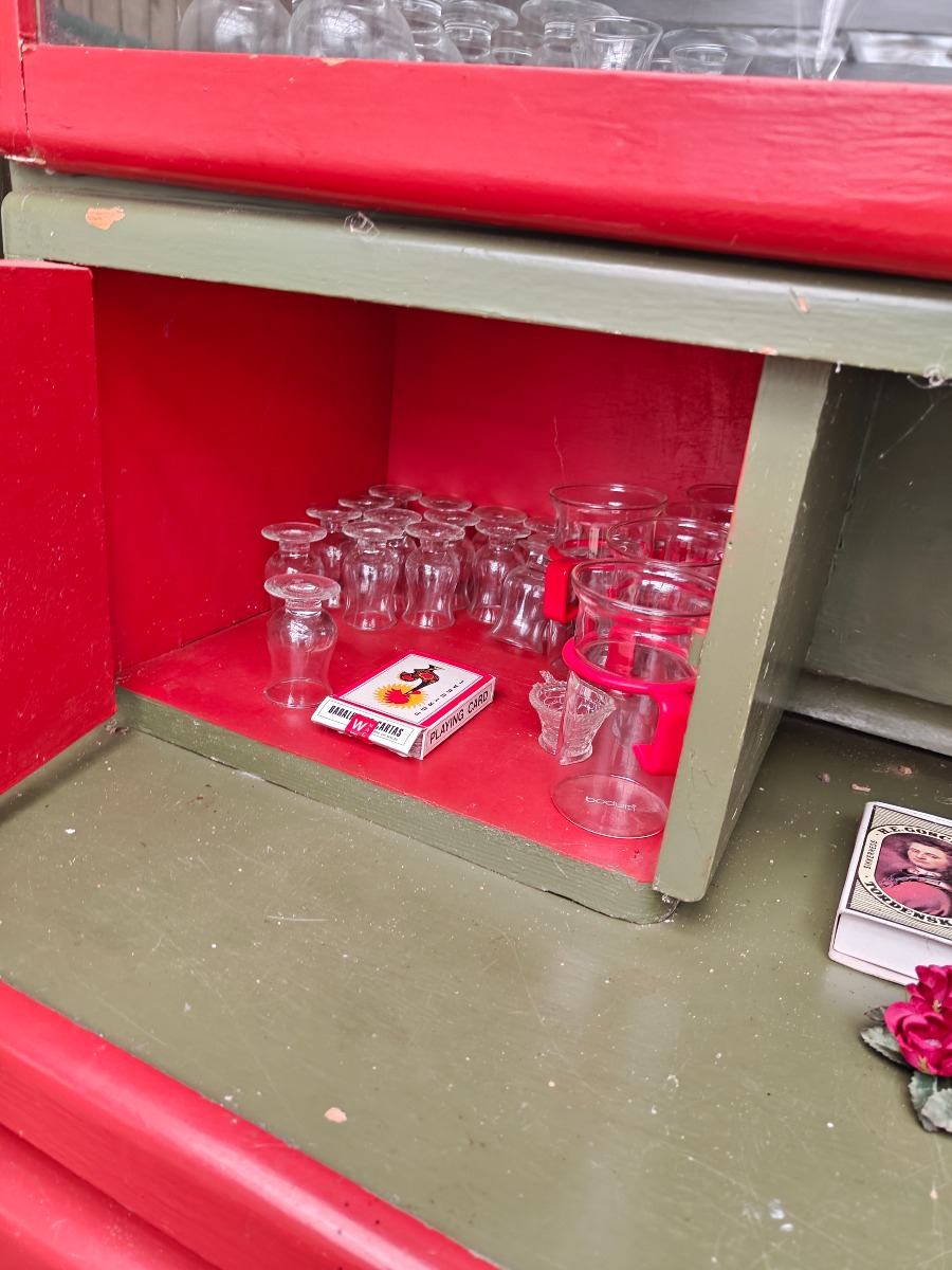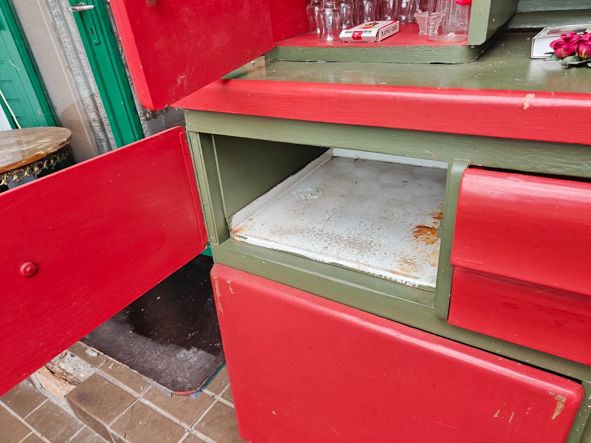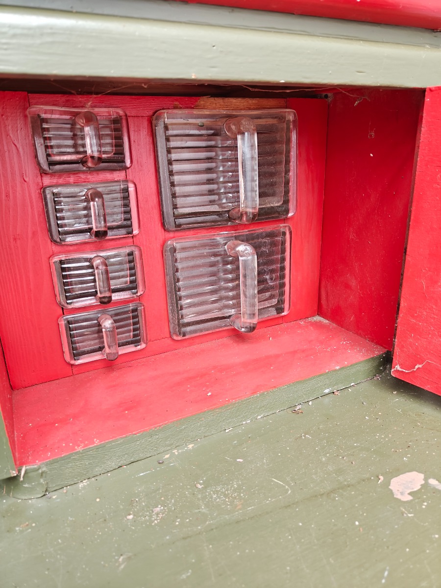 Ældre køkkenskab med mange låger enkelte glasskuffer. Senere bemalet. Maling skaller. H. 170, b. 140, D. 52 cm.