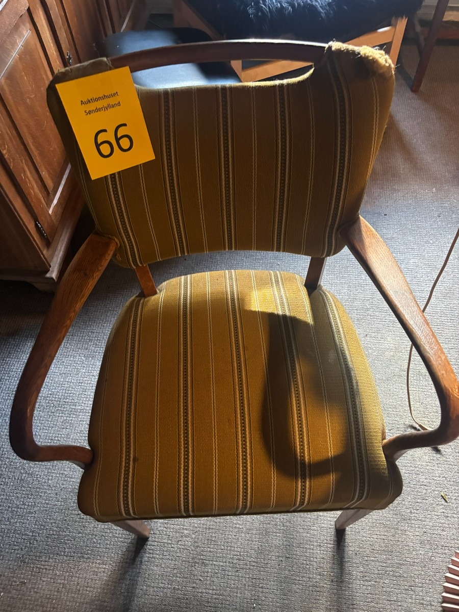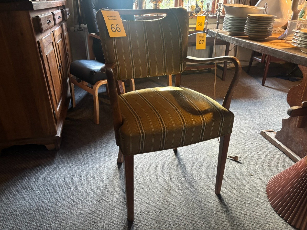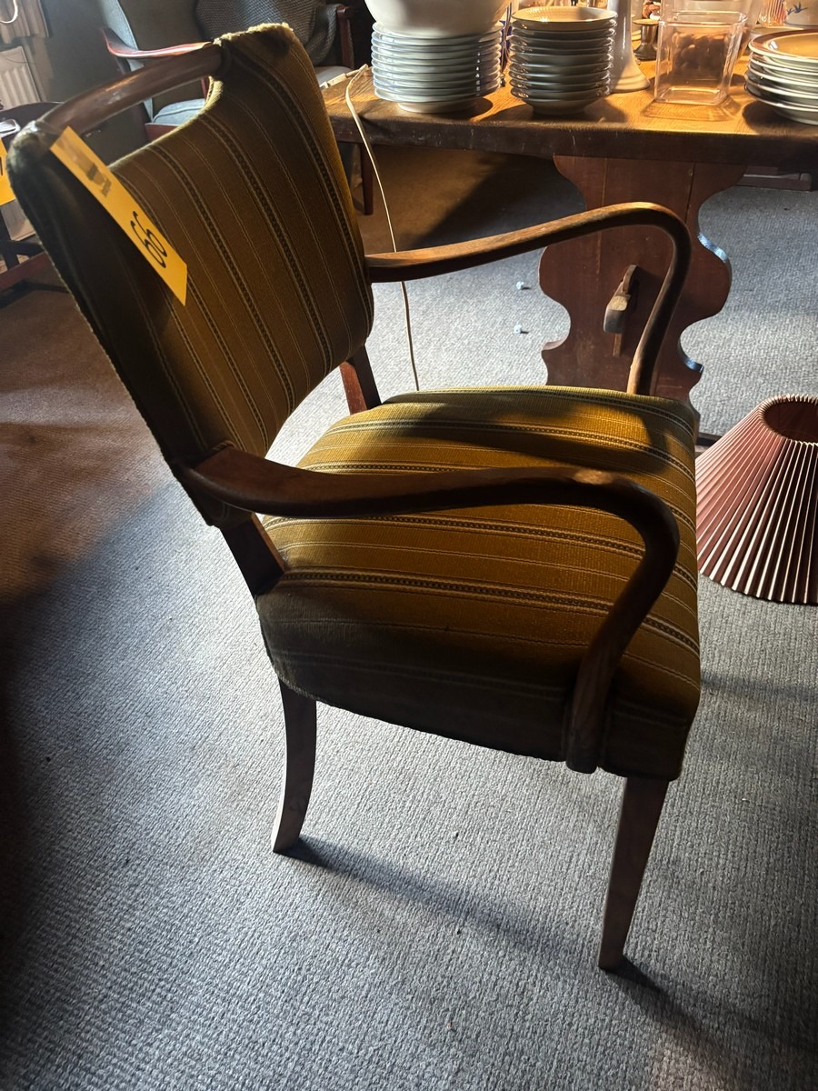 Armstol af eg. Monteret med grøn stribet uld. Fremstår med slid.