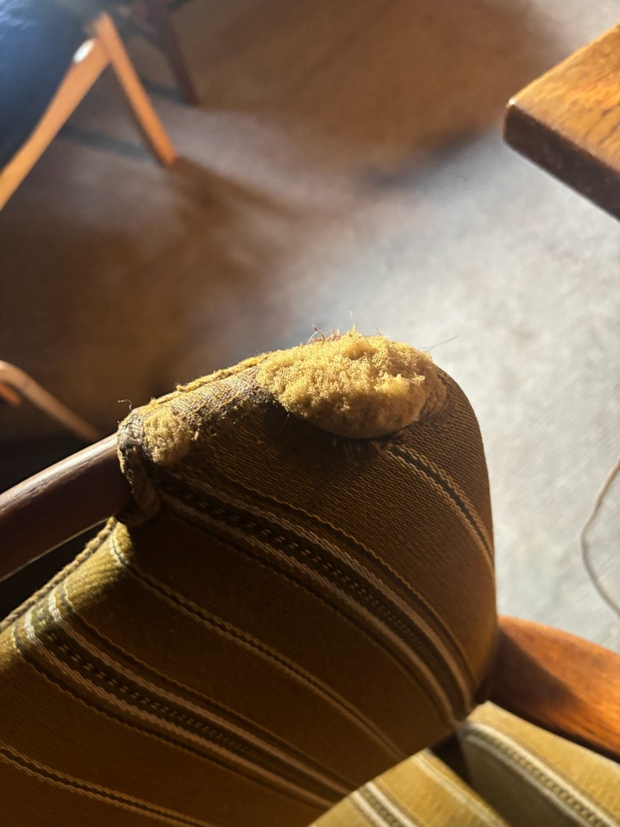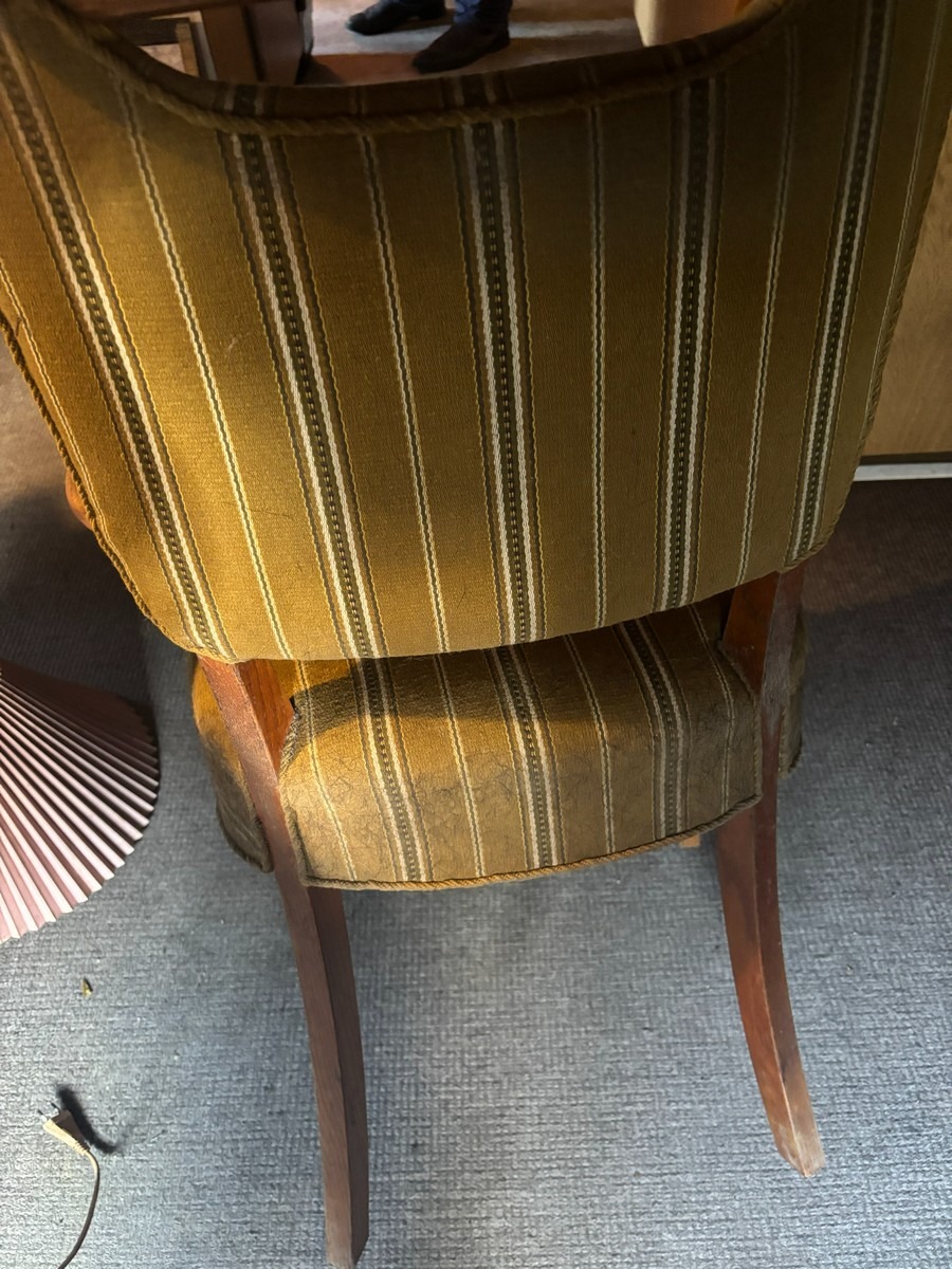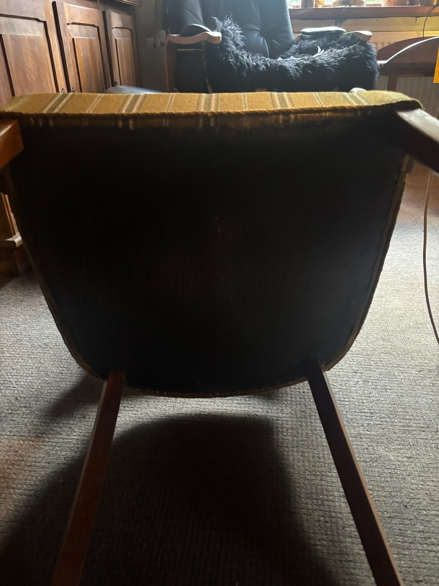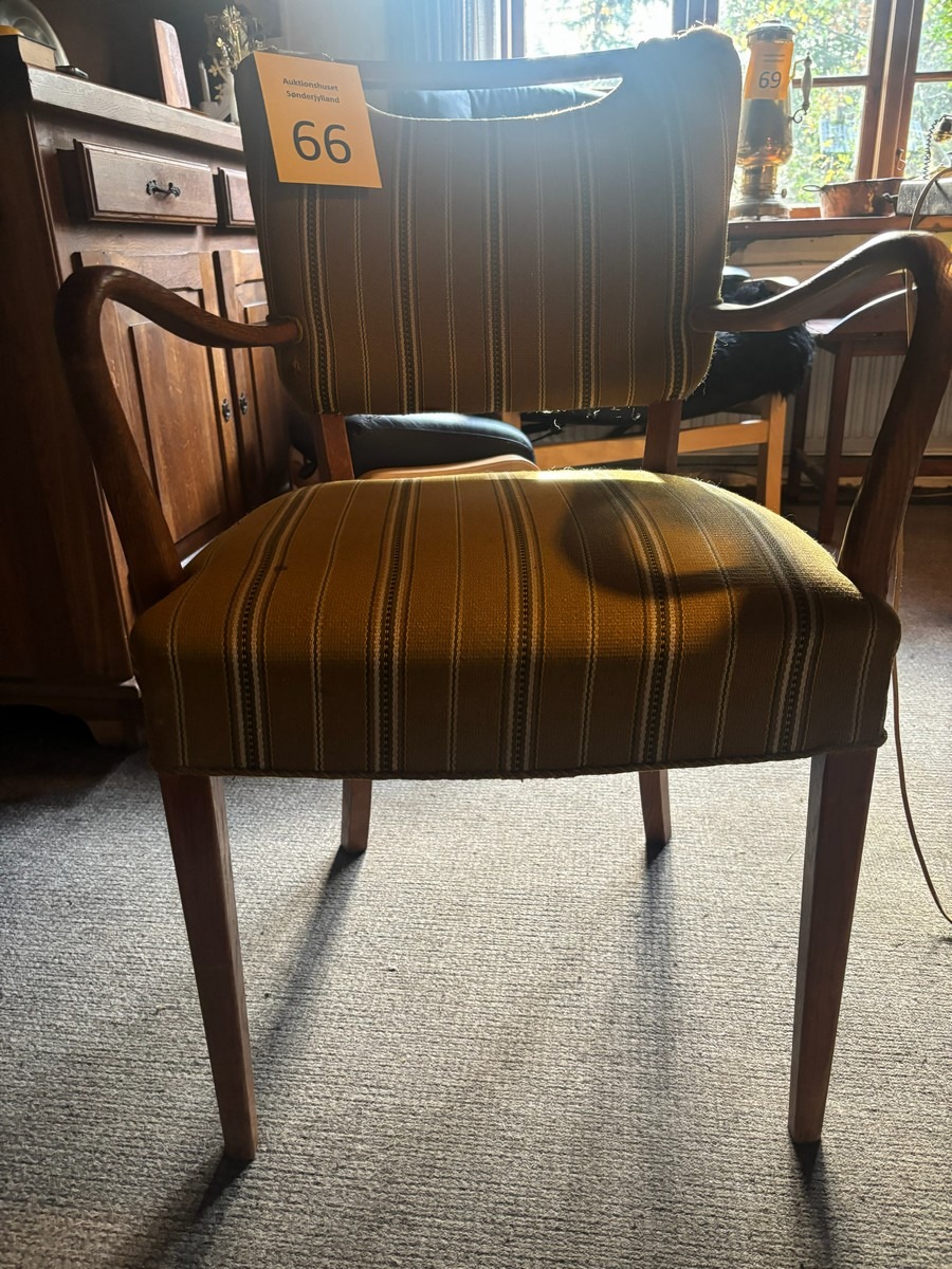 Armstol af eg. Monteret med grøn stribet uld. Fremstår med slid.