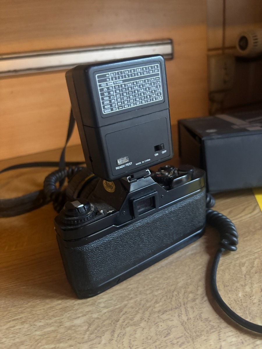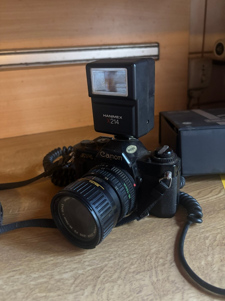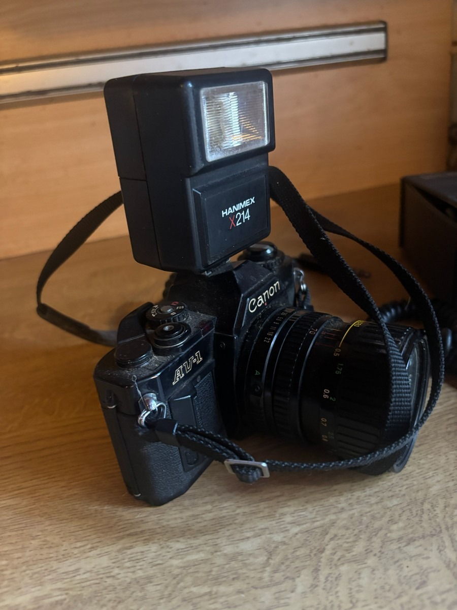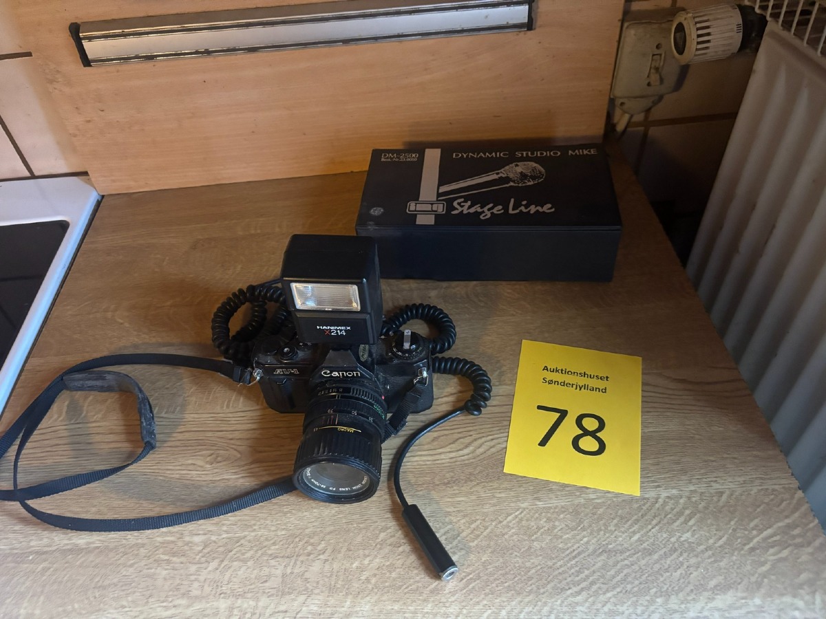Canon AV-1 spejlreflekskamera med Hanimex X214 blitz samt IMG DM-2500 mikrofon. Vi garanterer ikke for funktionaliteten.