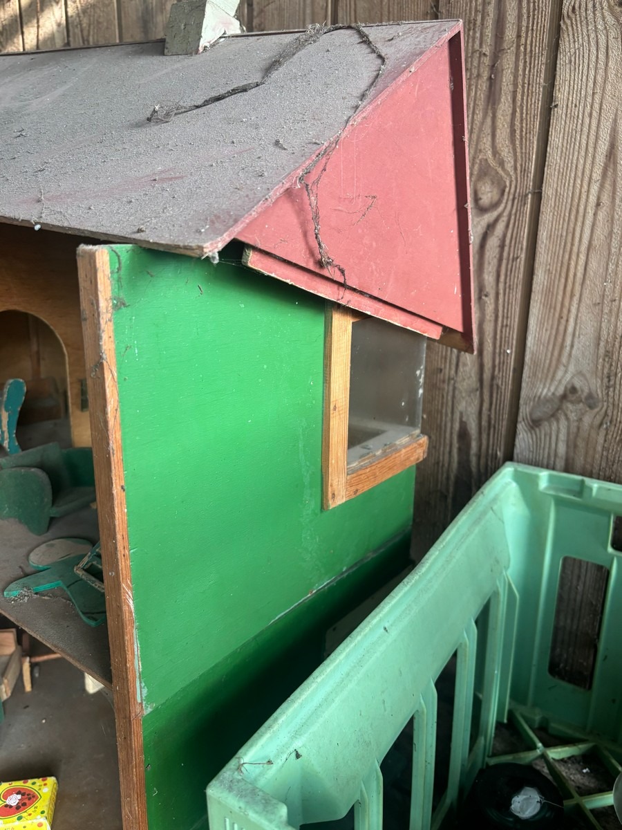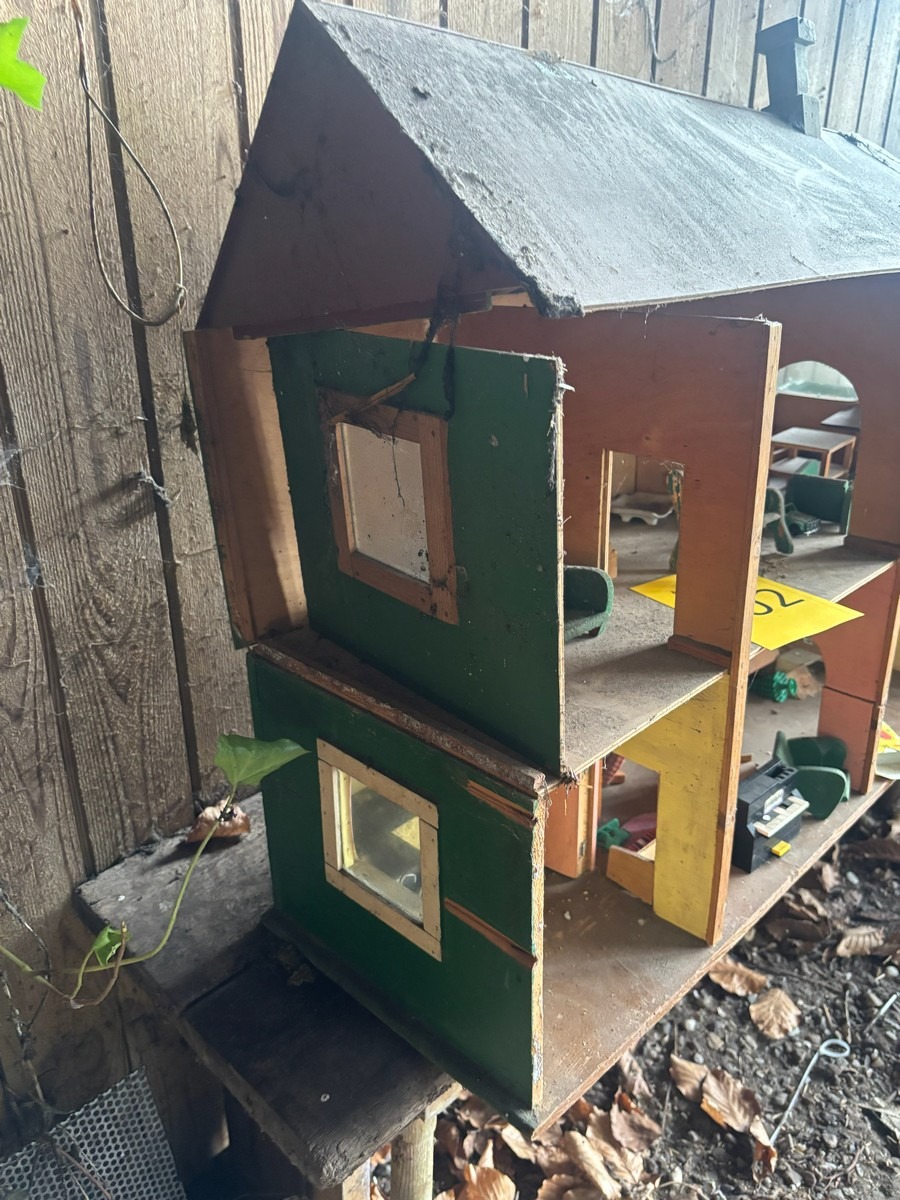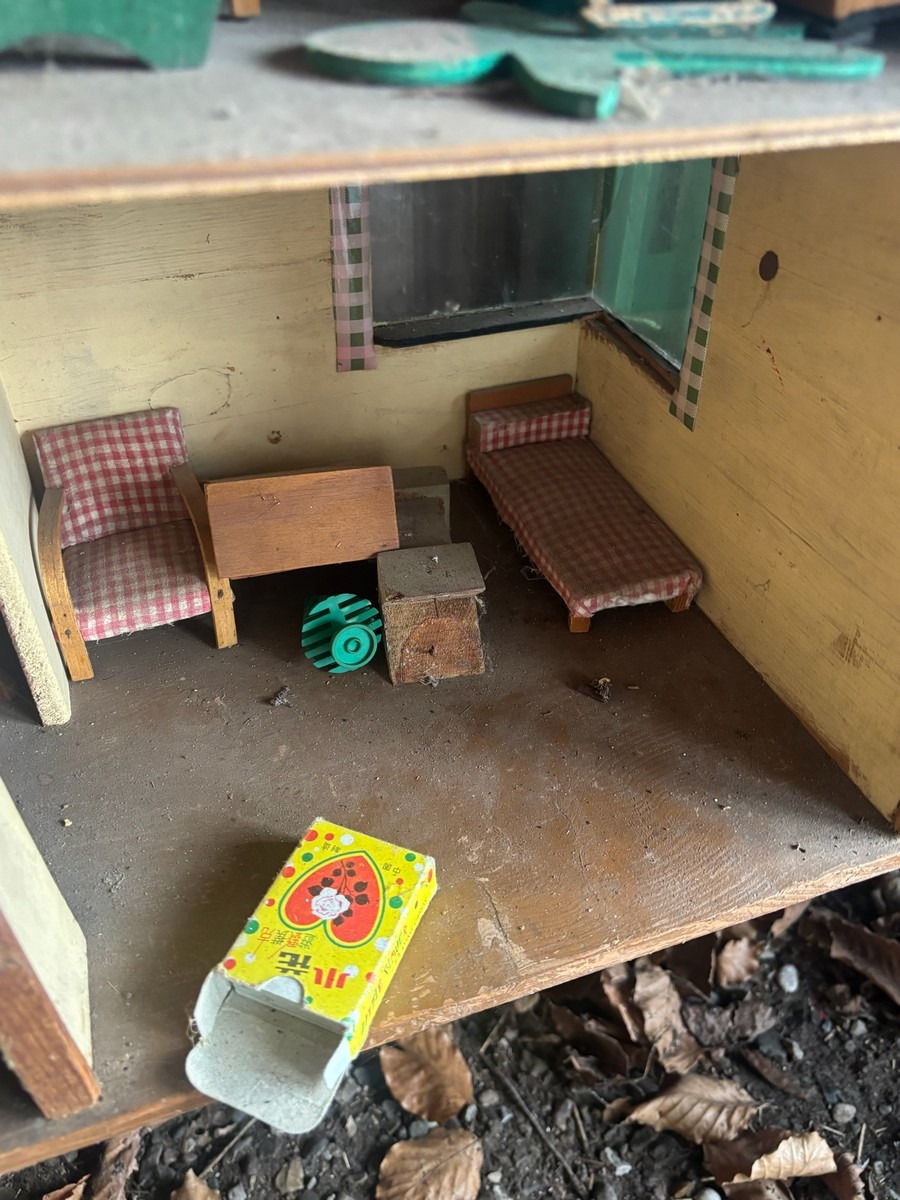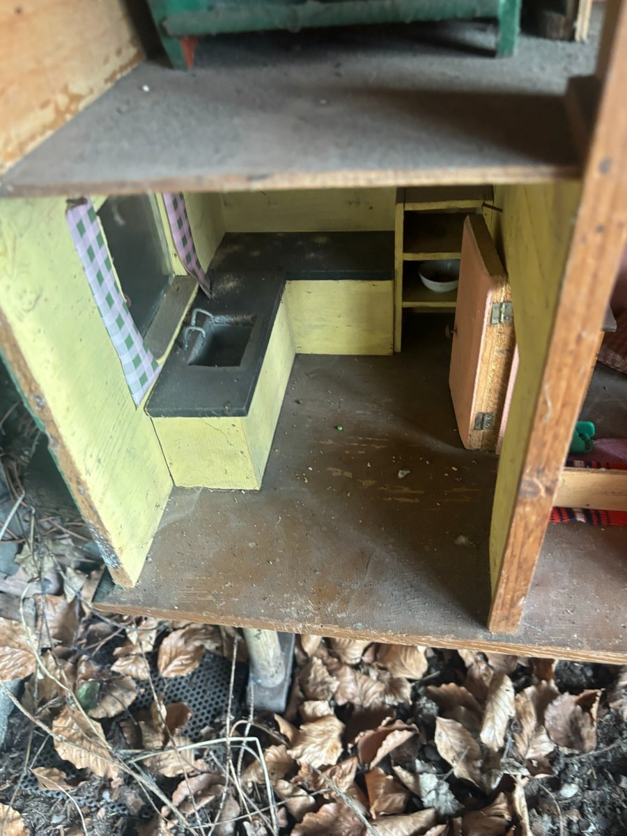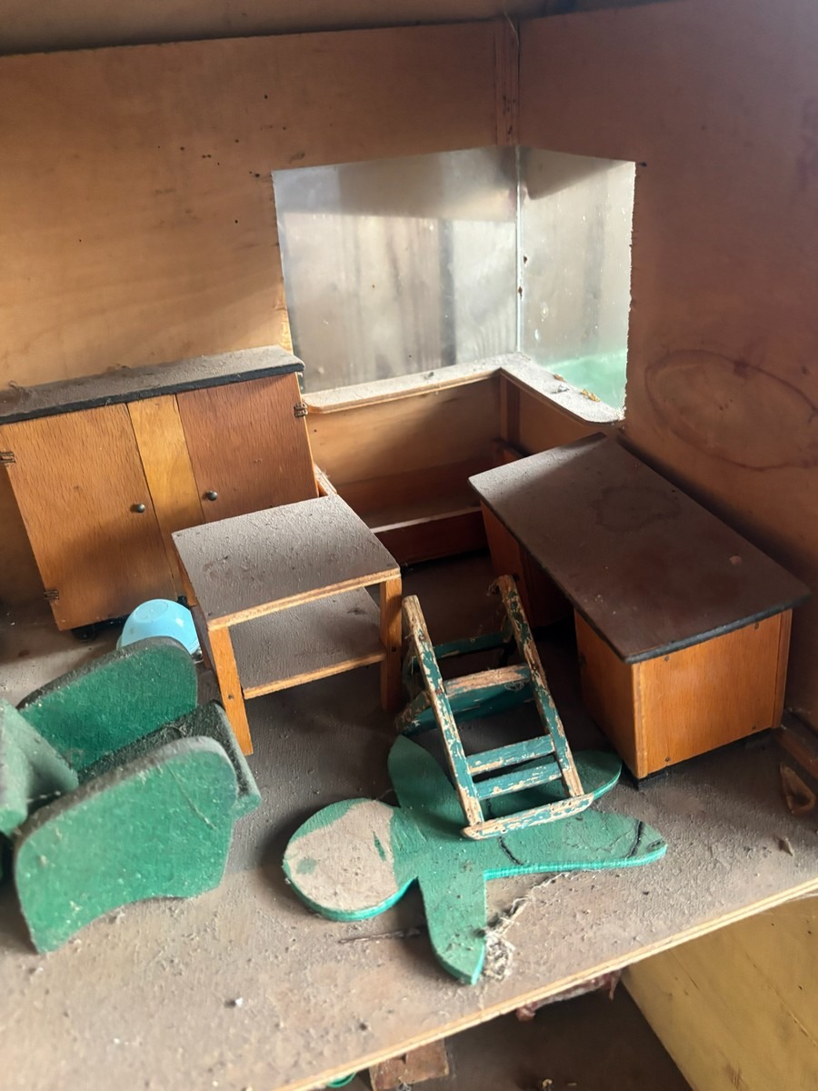 Dukkehus, hjemmelavet. Indbo medfølger. Mindre defekter.