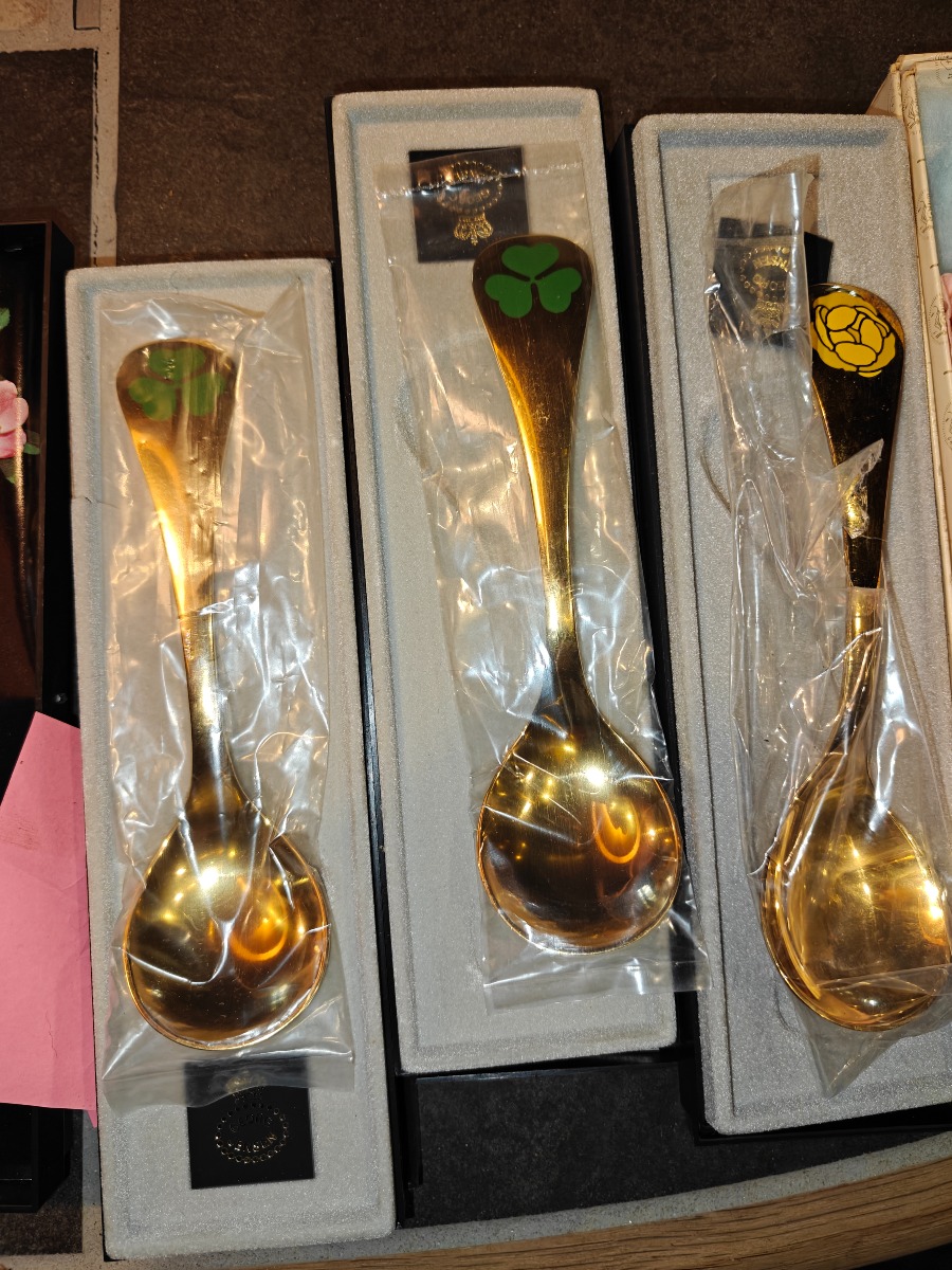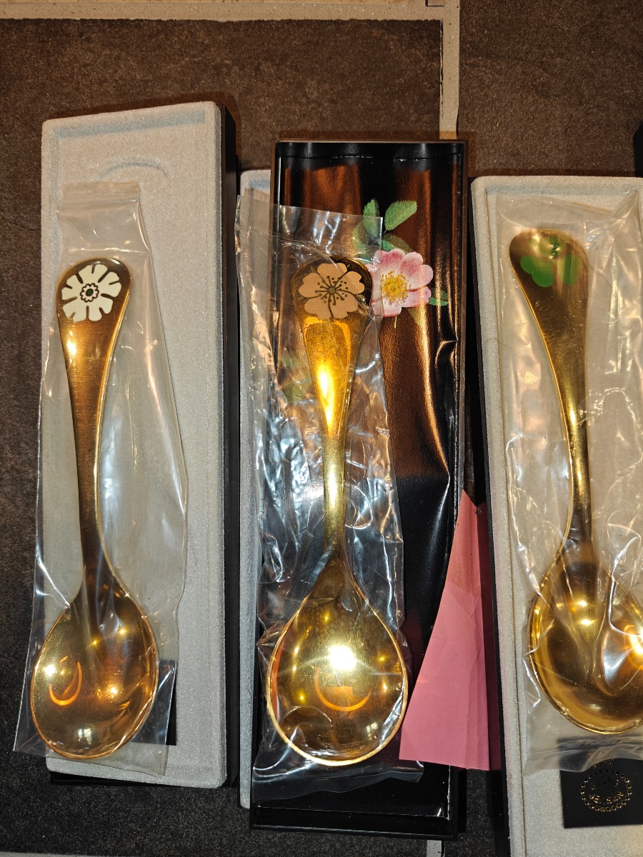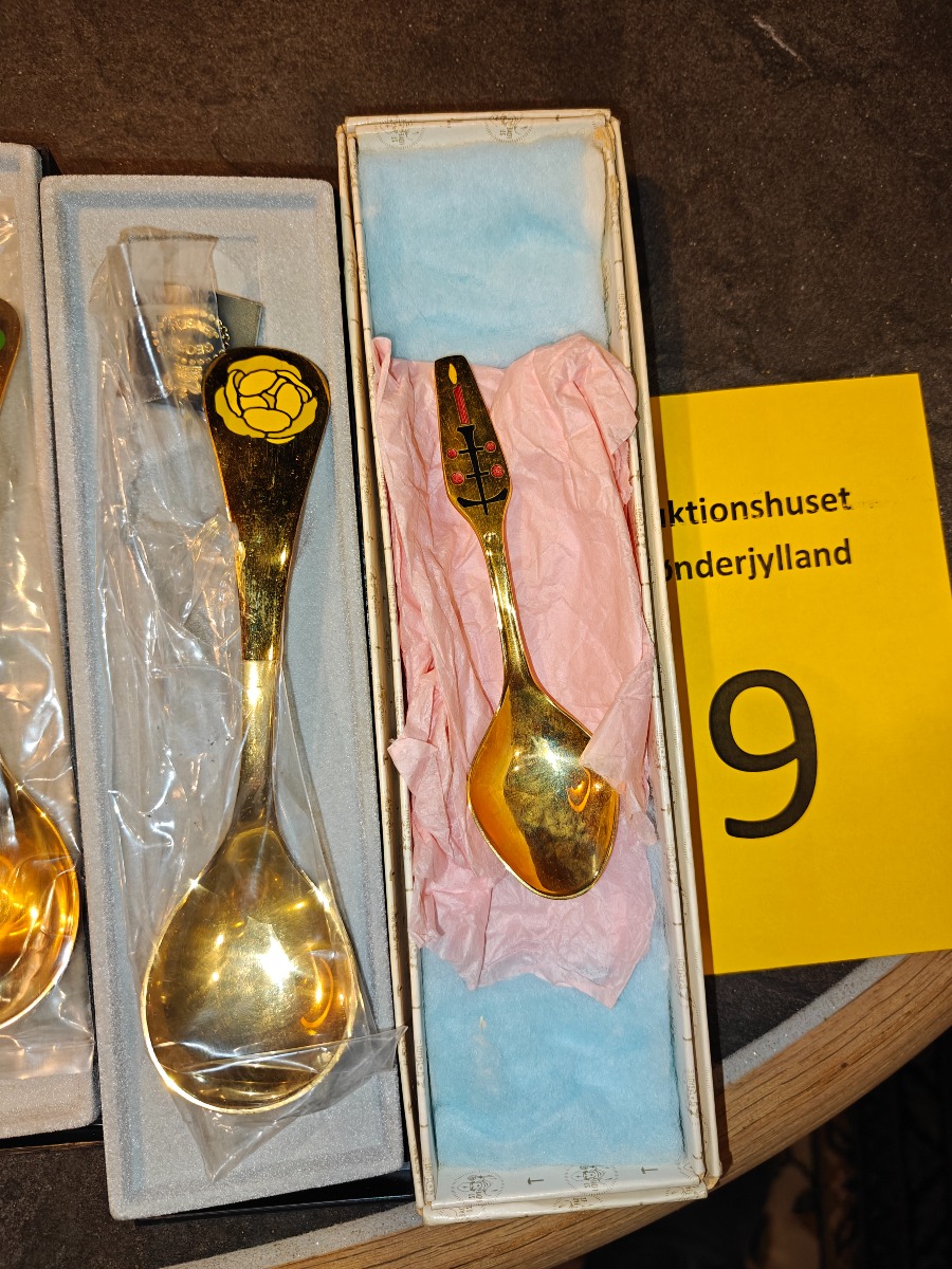 Georg Jensen årsskeer m.m. Forgyldt sterlingsølv, dekoreret med farvet emalje. Ligger i originale æsker.