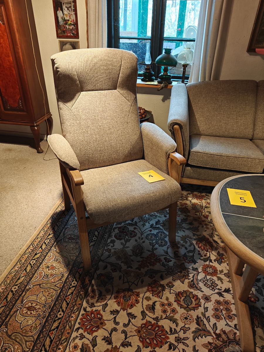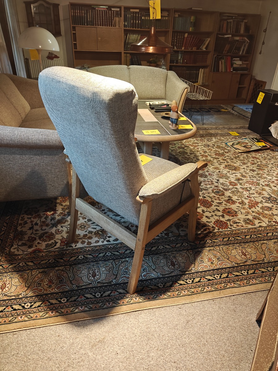 Hvilestol med stel af eg og monteret med beige nisteret uld. Fremstår næsten som ny.