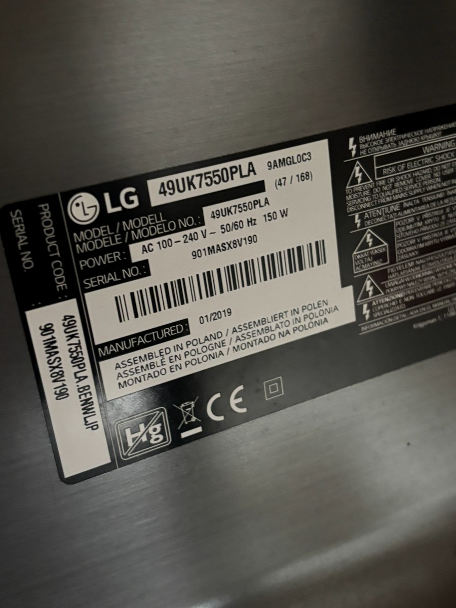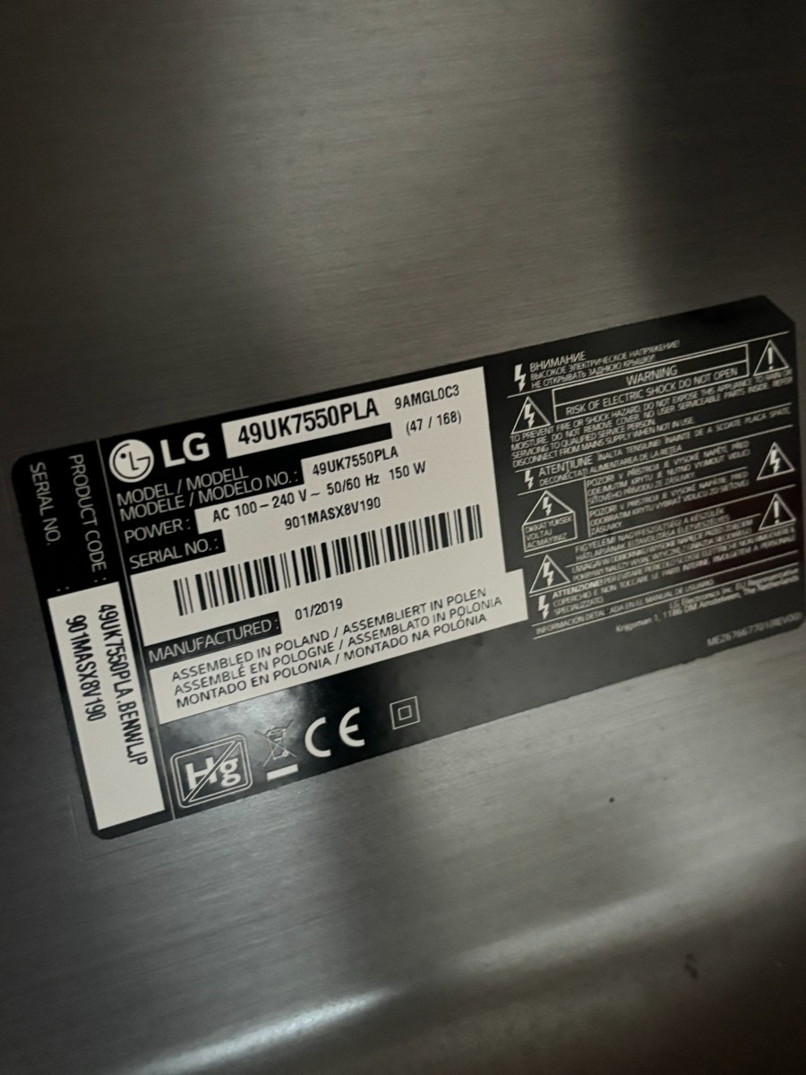 LG 49" TV, model 49UK7550PLA. Fjernbetjening medfølger. Vi garanterer ikke for funktionaliteten. Køber skal selv afmontere.