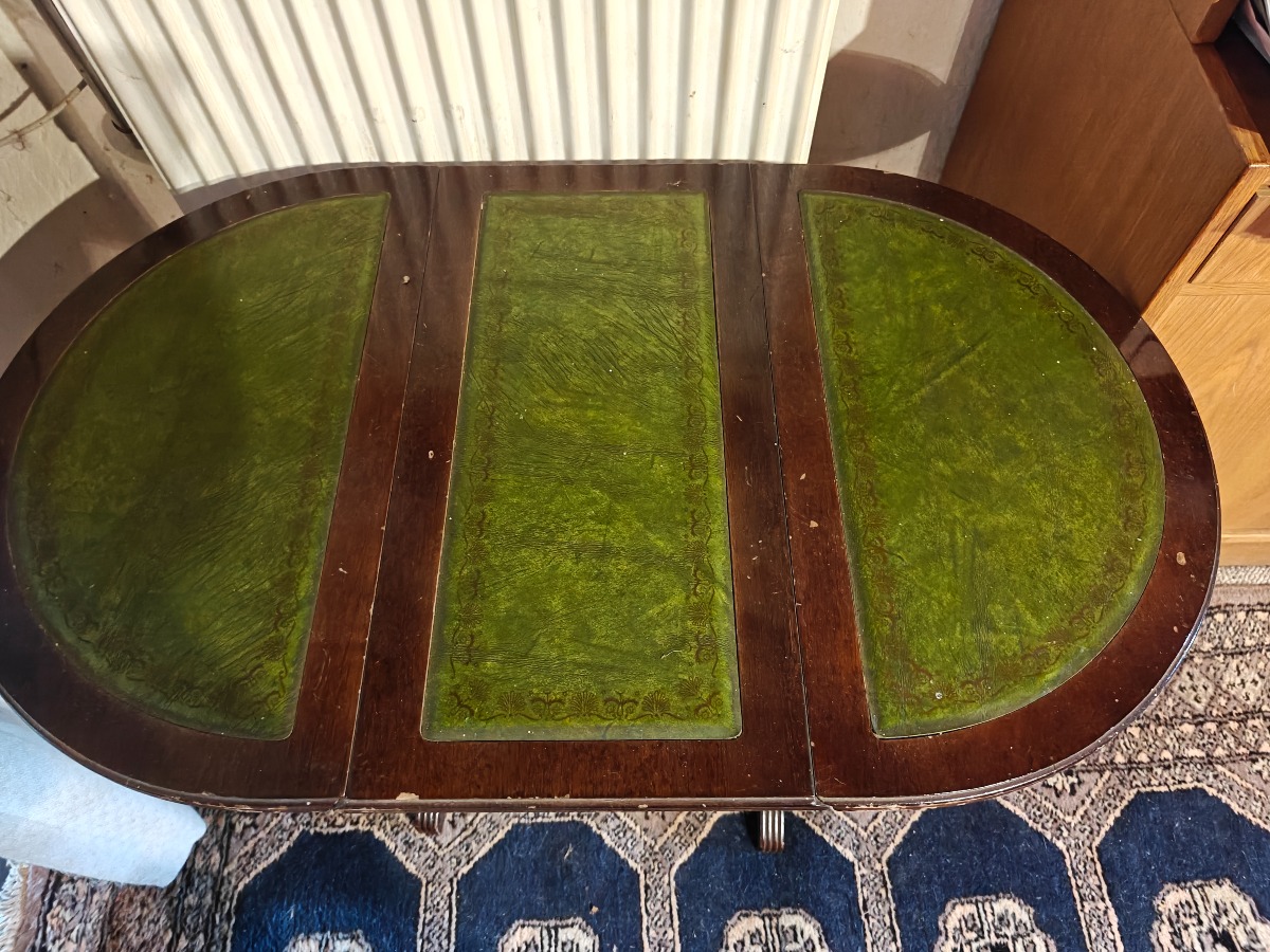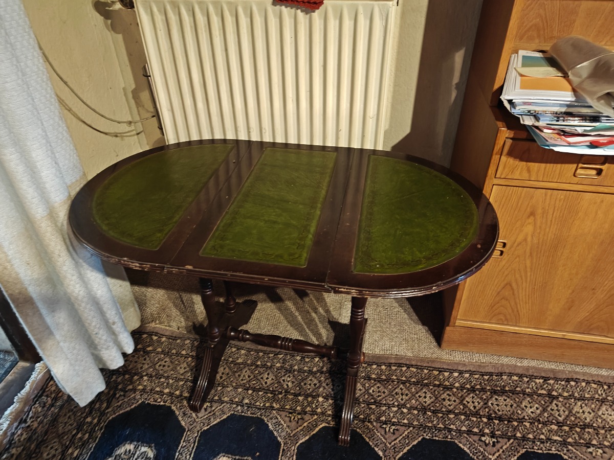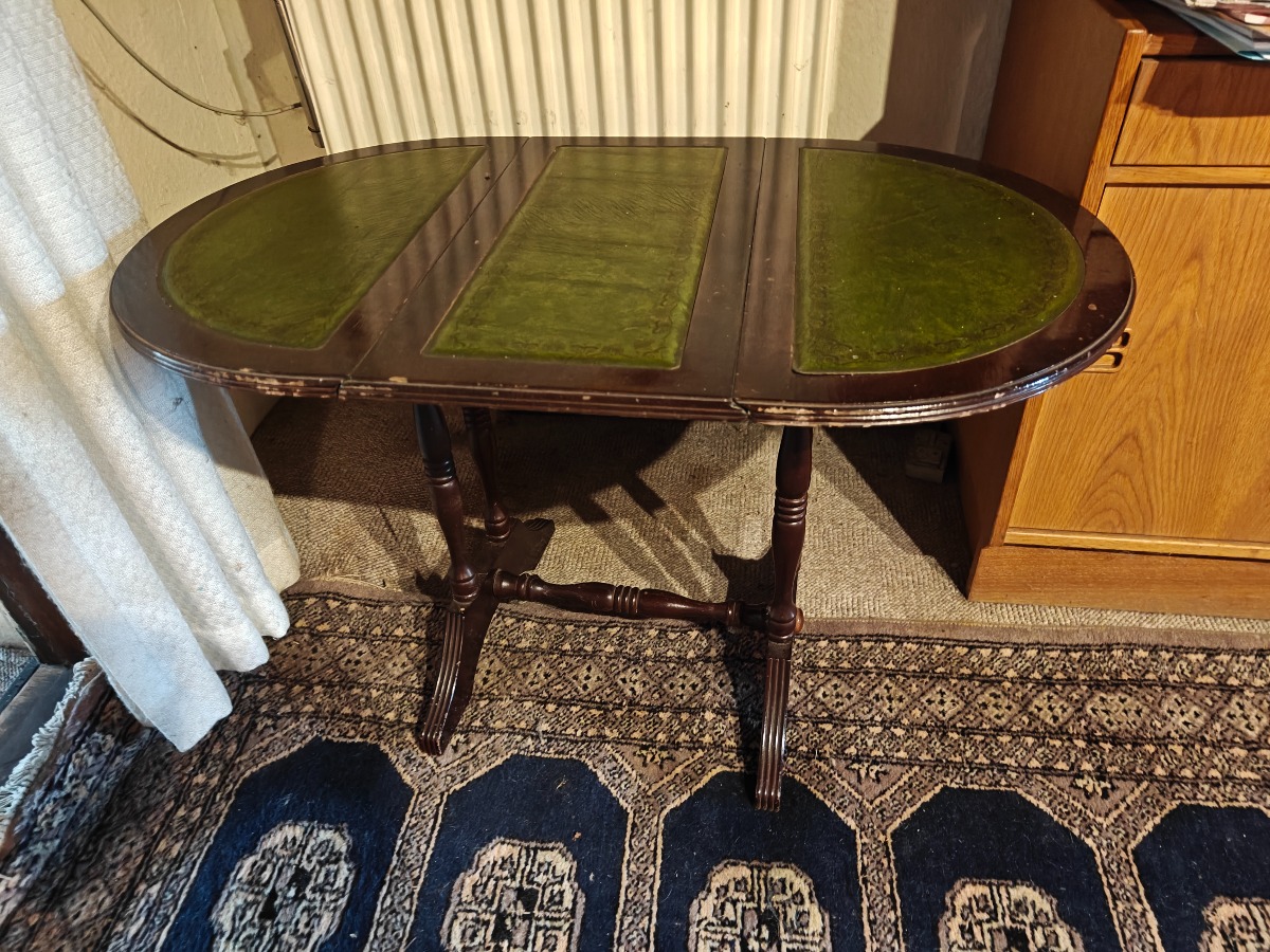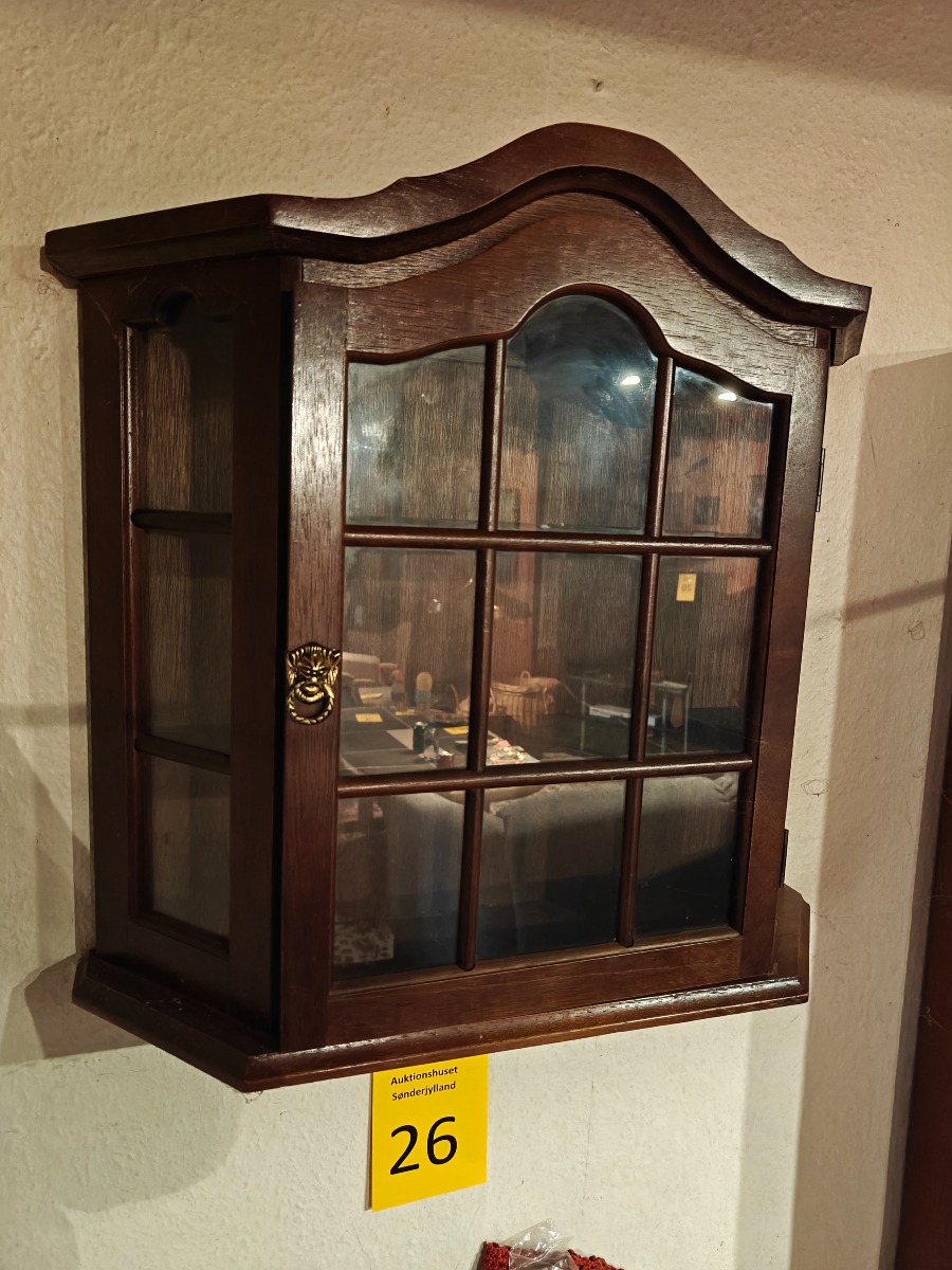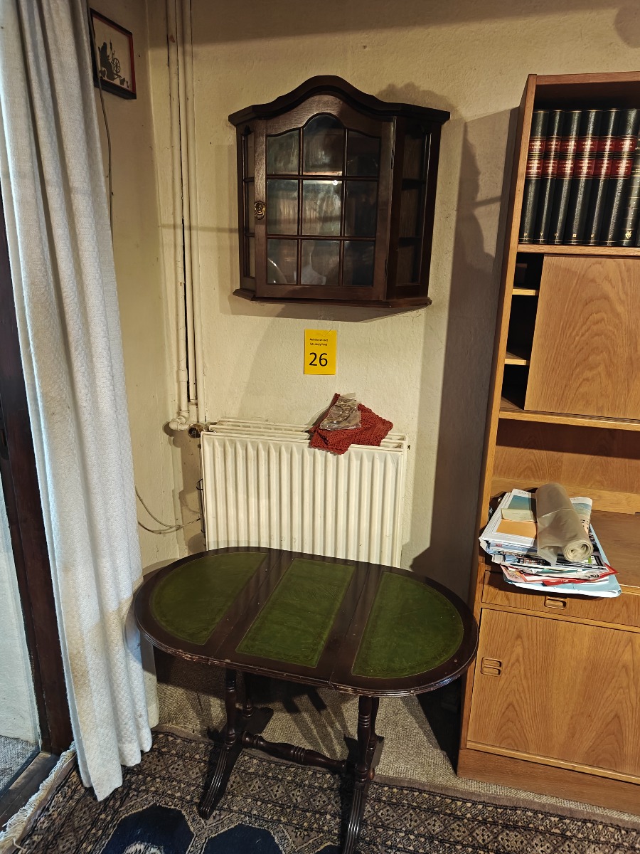 Lille væghængt vitrine samt klapbord.. Mahognibejdset træ. Bord med indlægninger af grønt læder. Bordplade 50 x 80 cm. En del brugsspor. Køber skal selv afmontere.